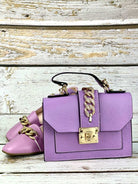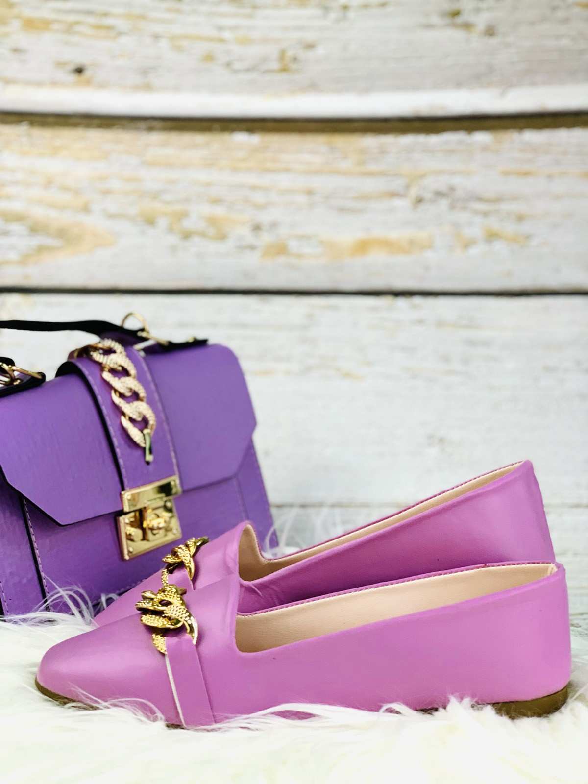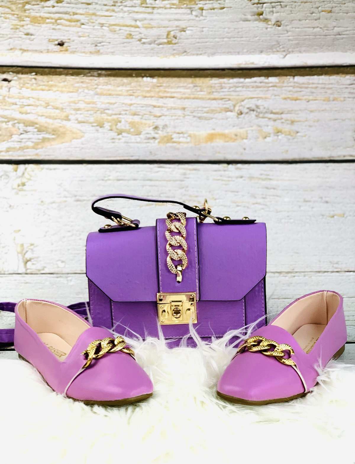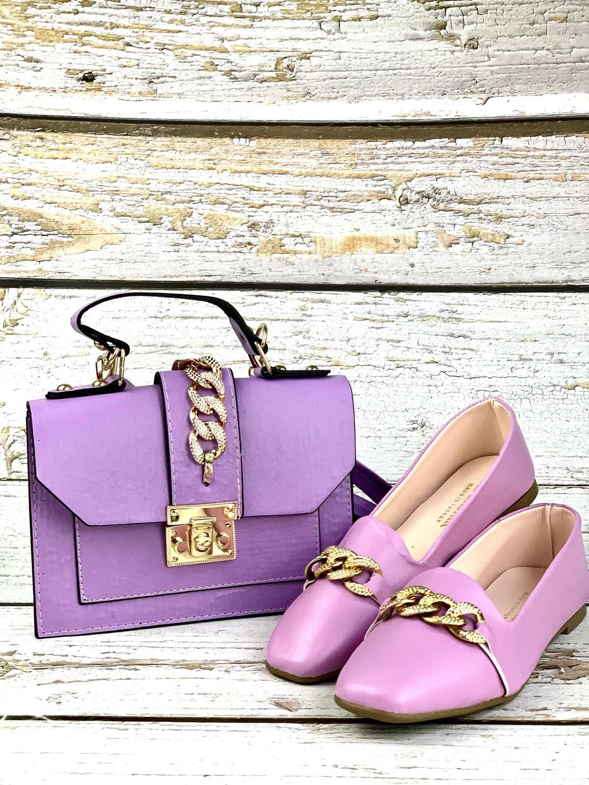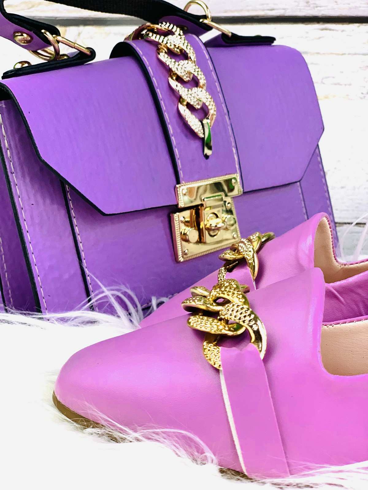 حقيبة وحذاء باللون الأرجواني مع عقدة زخرفية