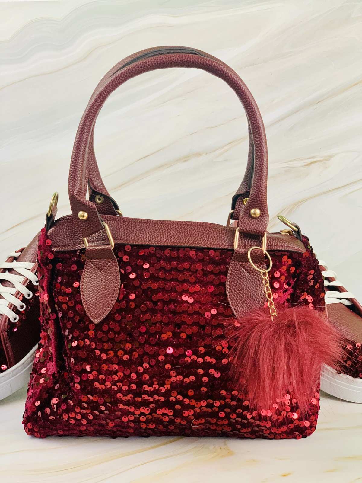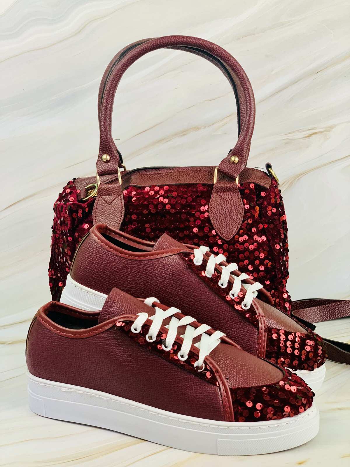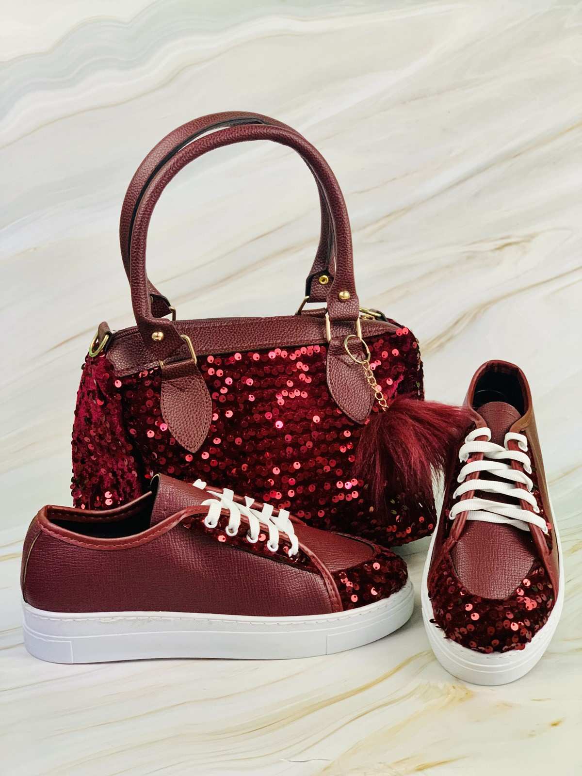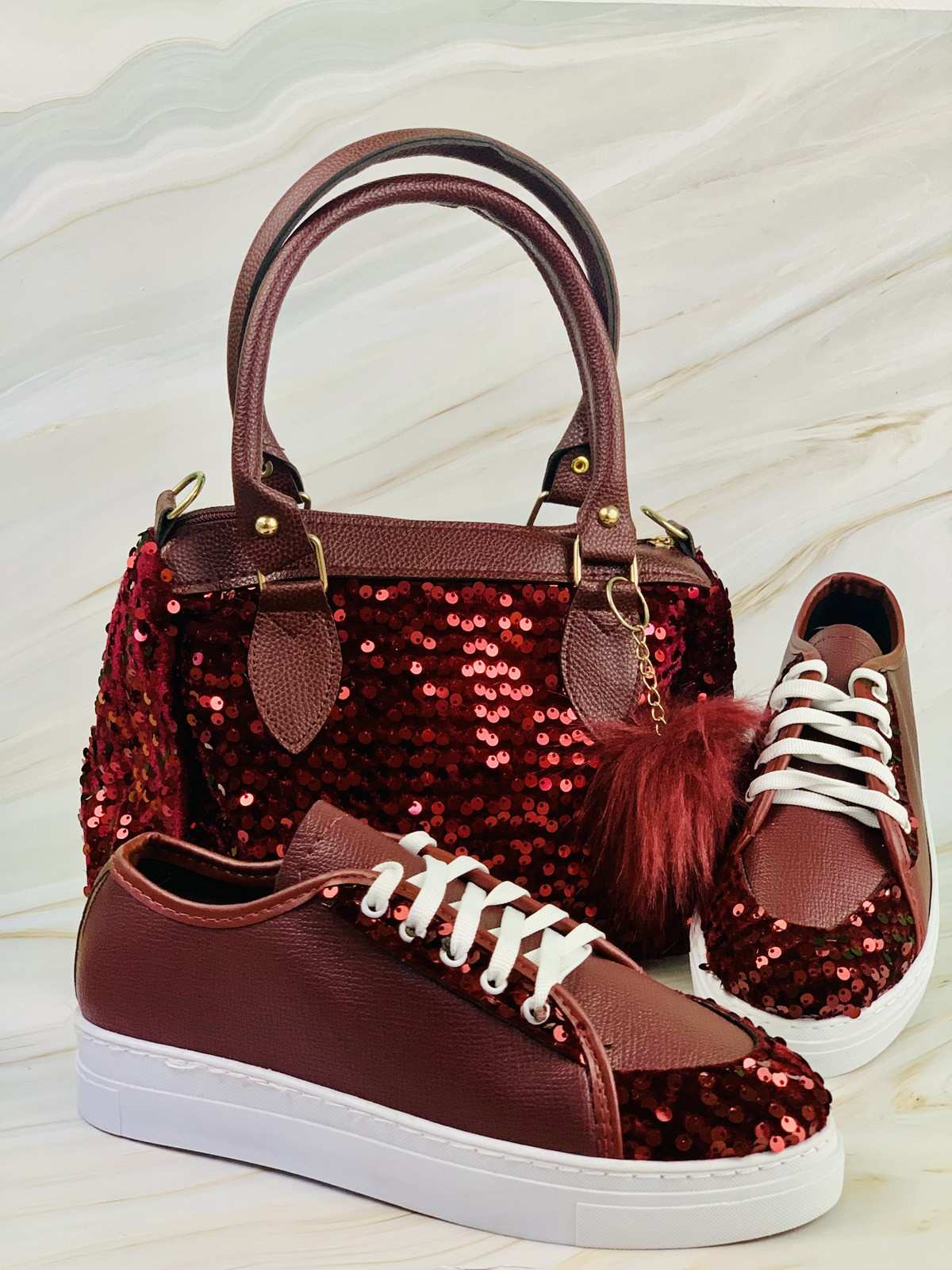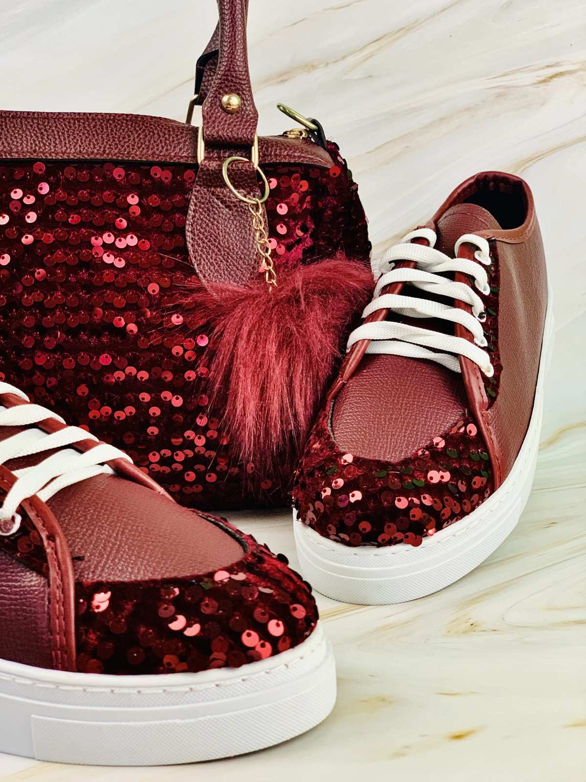 للنساء - حقيبة حمراء لامعة وحذاء رياضي