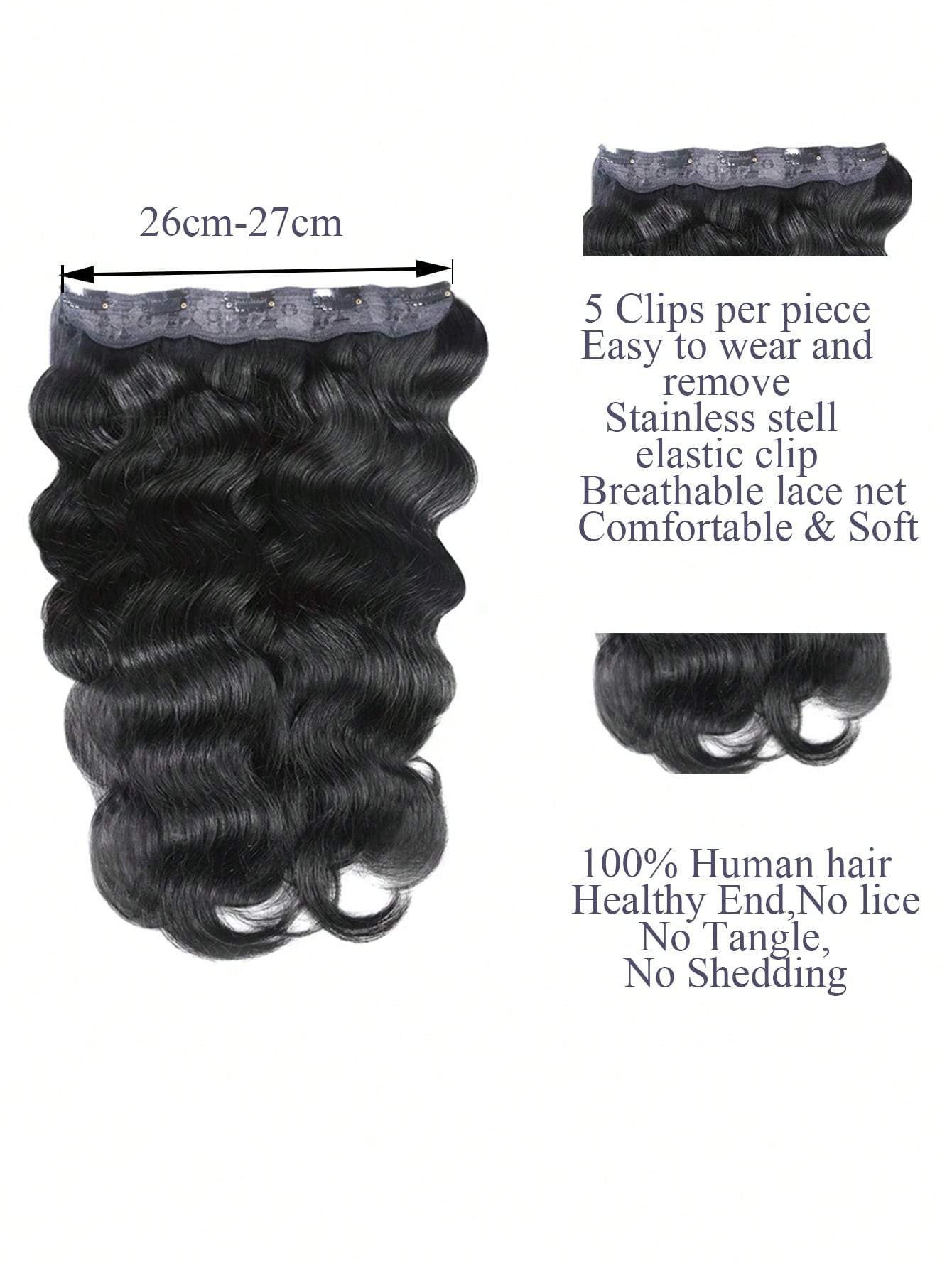 وصلات شعر مموجة للجسم، قطعة واحدة، مصنوعة يدويًا من شعر بشري طبيعي ناعم وطبيعي للنساء، بمشبك