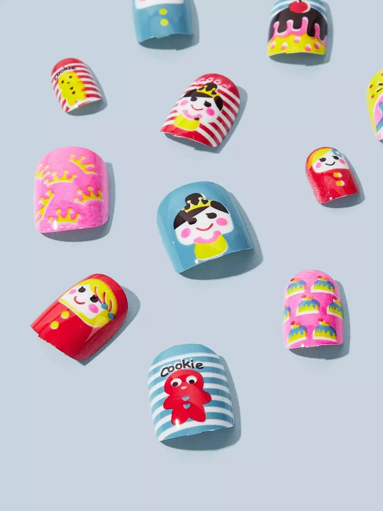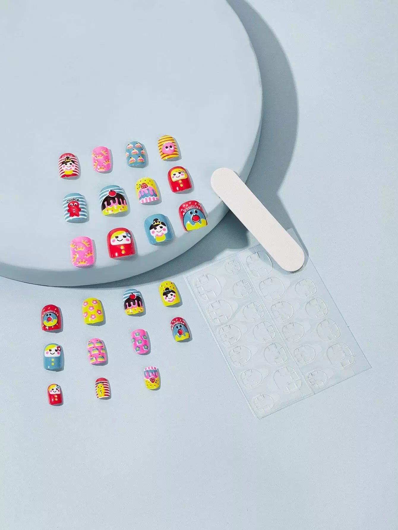 24 قطعة من أظافر صناعية برسومات كرتونية وشريط لاصق مزدوج الجوانب ومانيكير