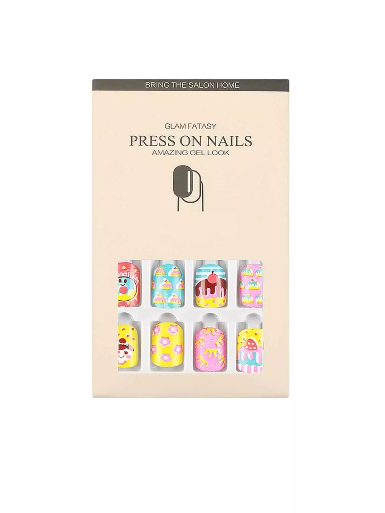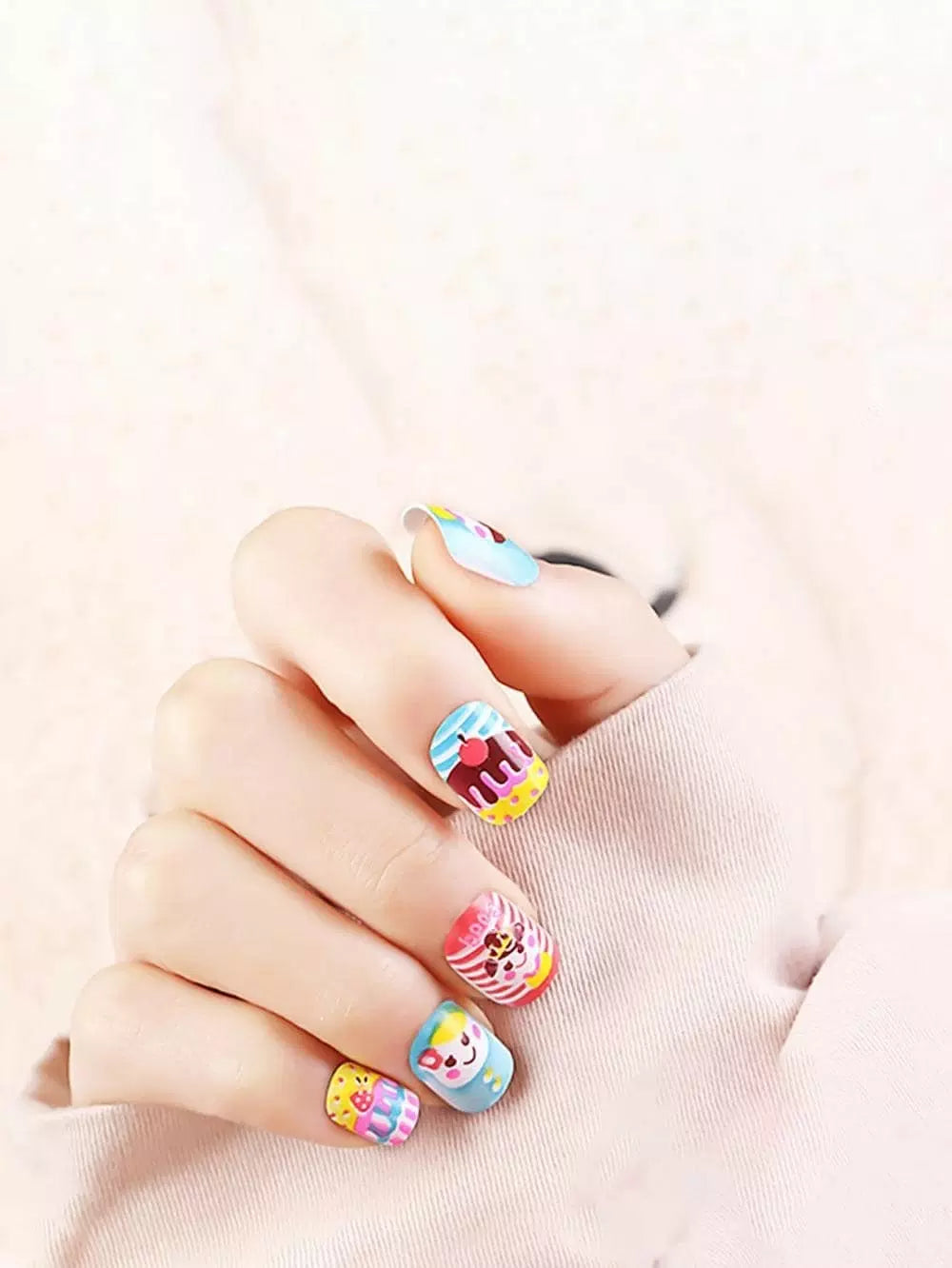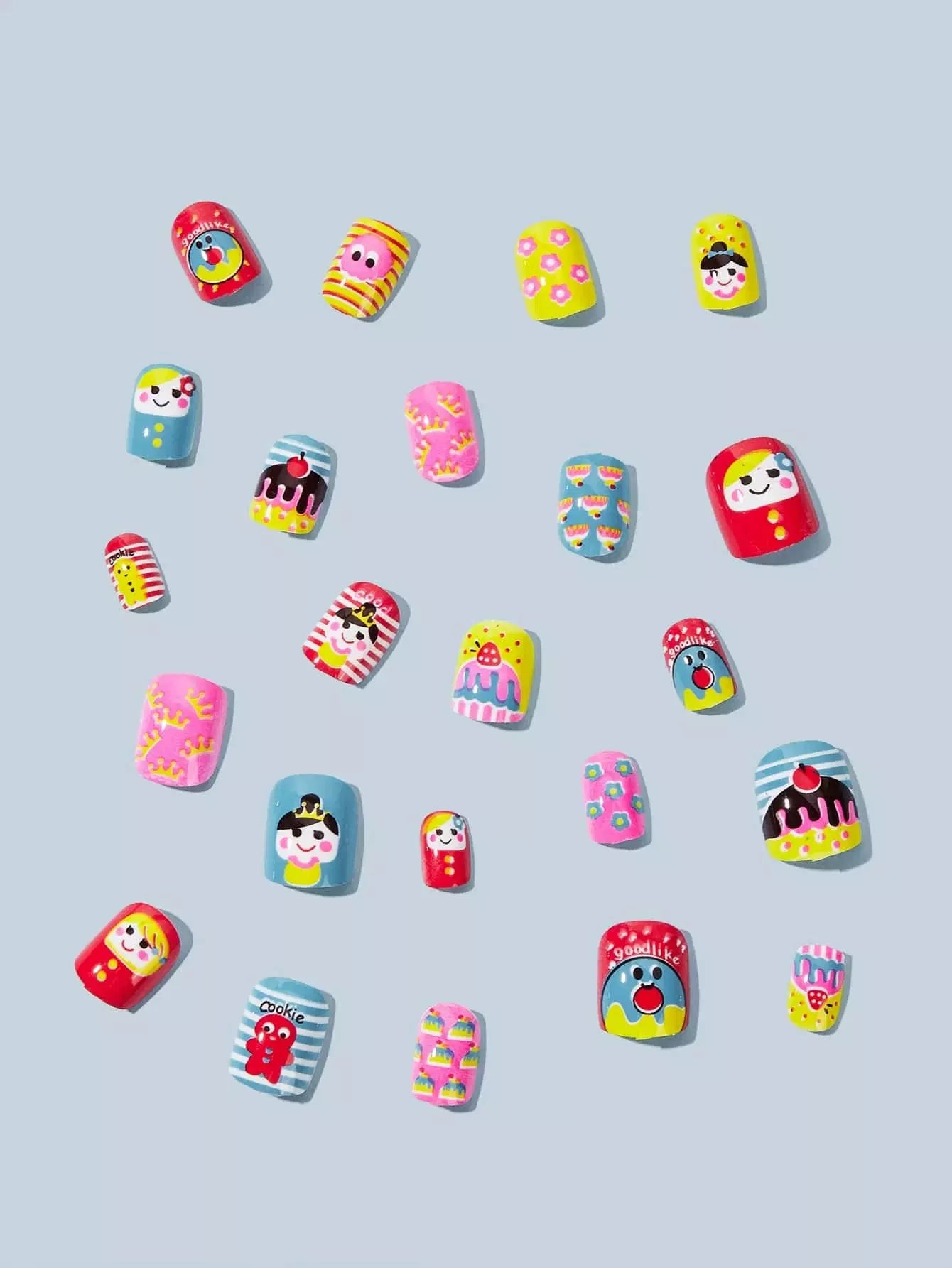 للنساء - 24 قطعة من الأظافر المزيفة برسوم كرتونية وشريط مزدوج الجوانب ومانيكير