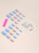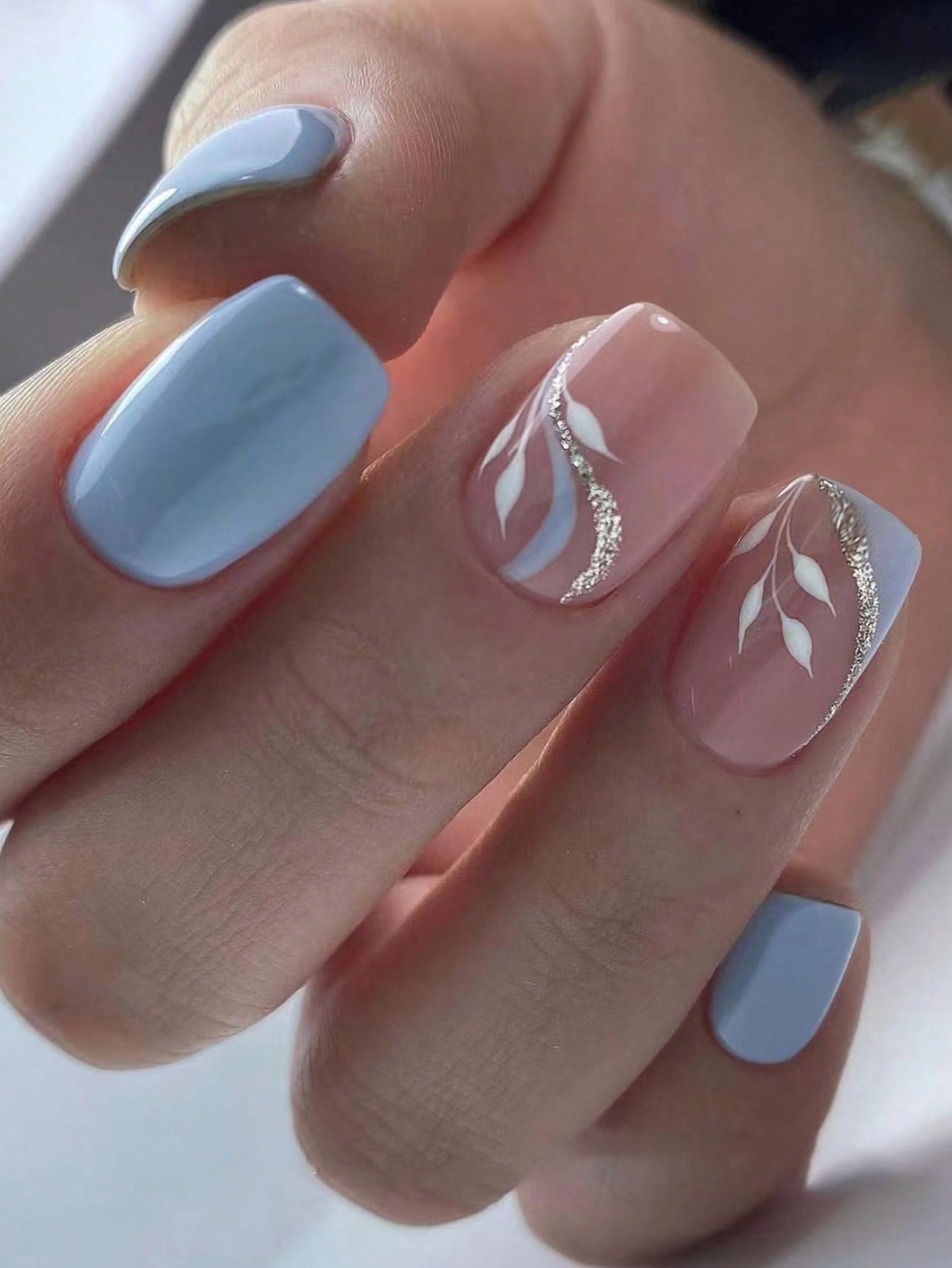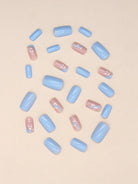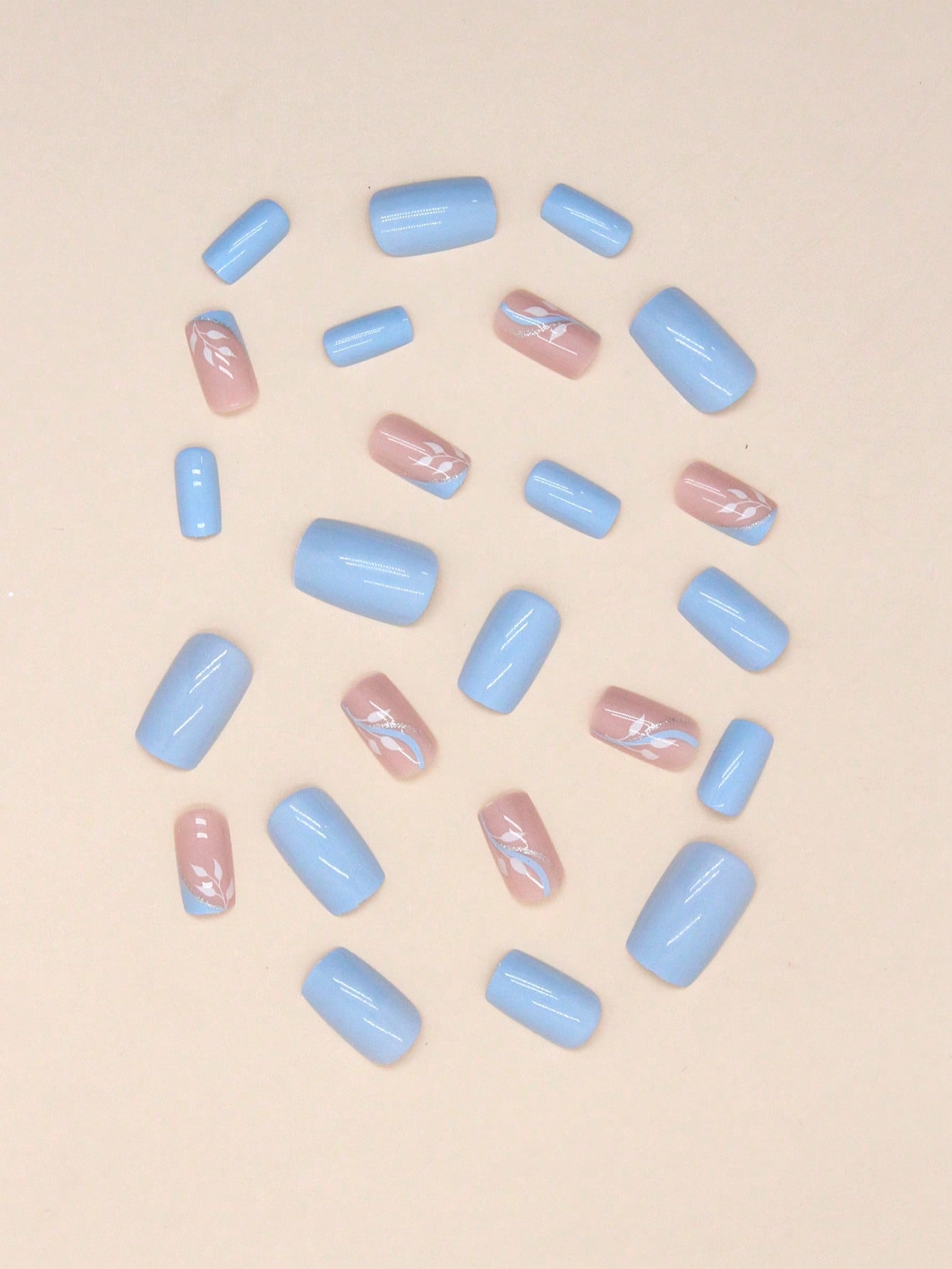 مجموعة من 24 قطعة من الأظافر الصناعية المربعة متوسطة الطول باللون الأزرق الفاتح ونقشة أوراق الشجر