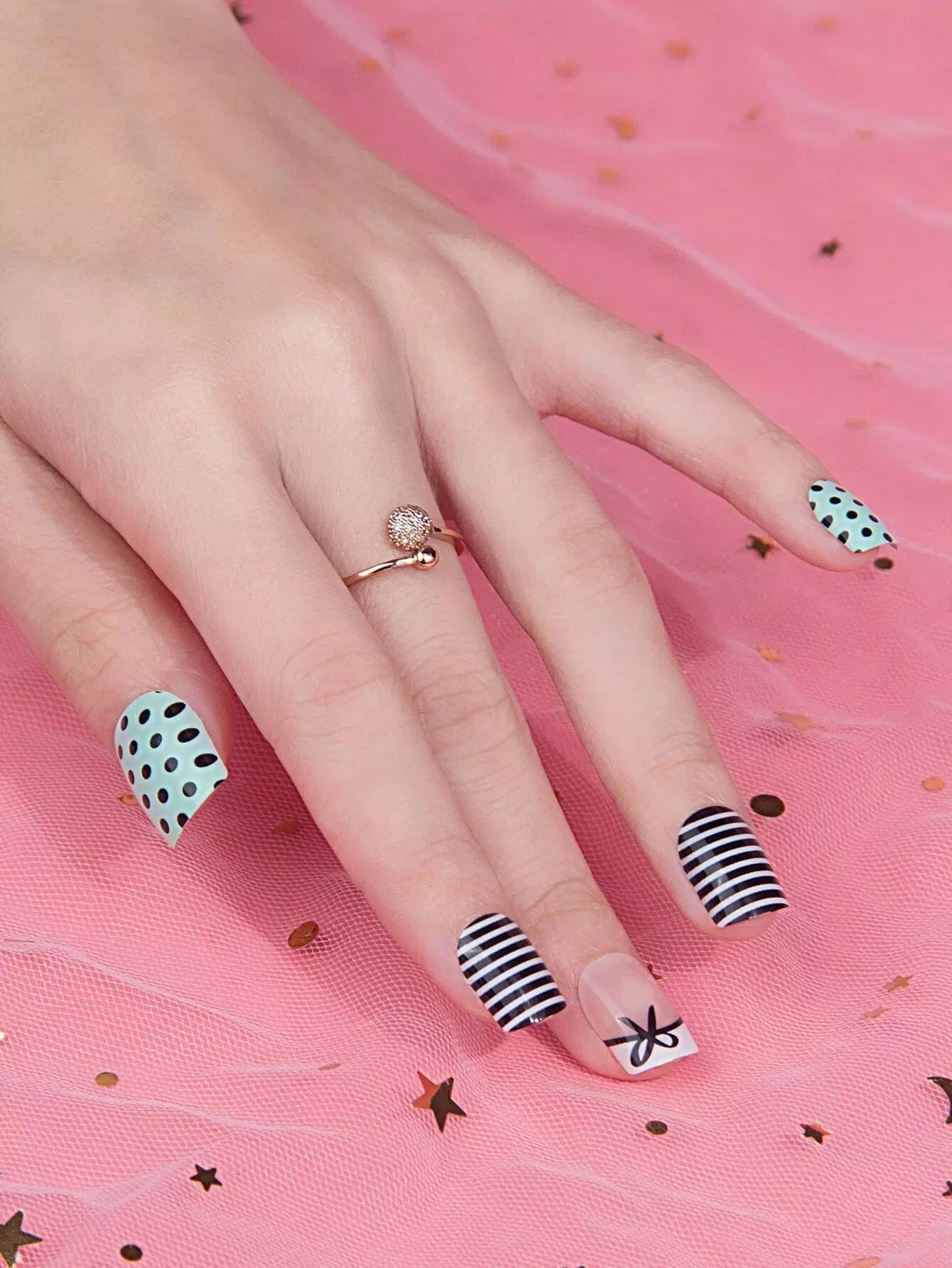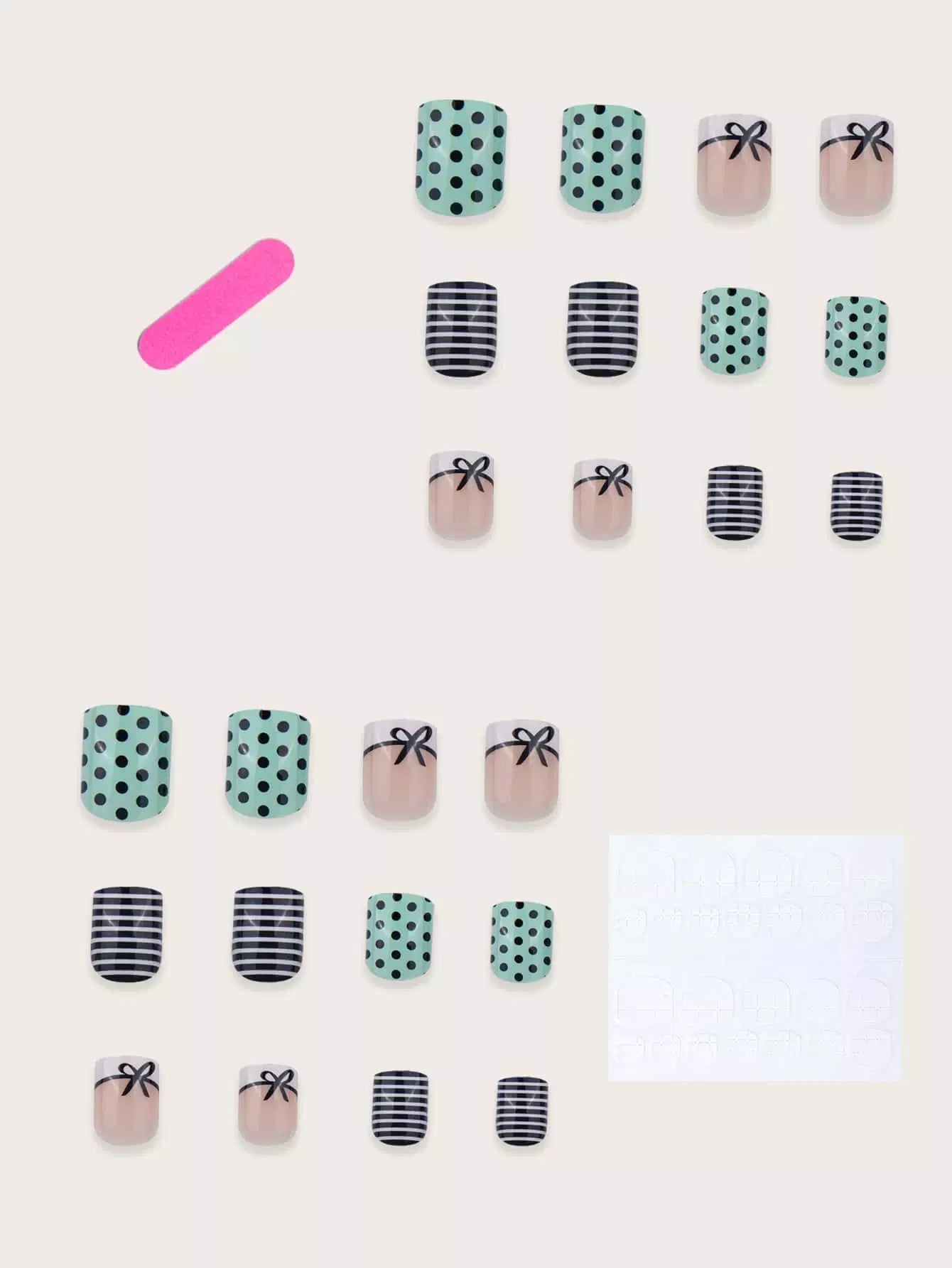 24 قطعة أظافر مزيفة مخططة ومنقطة و1 قطعة مبرد أظافر و1 شريط لاصق