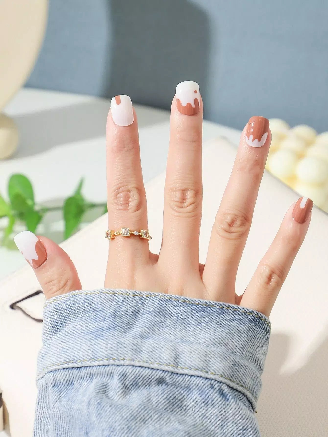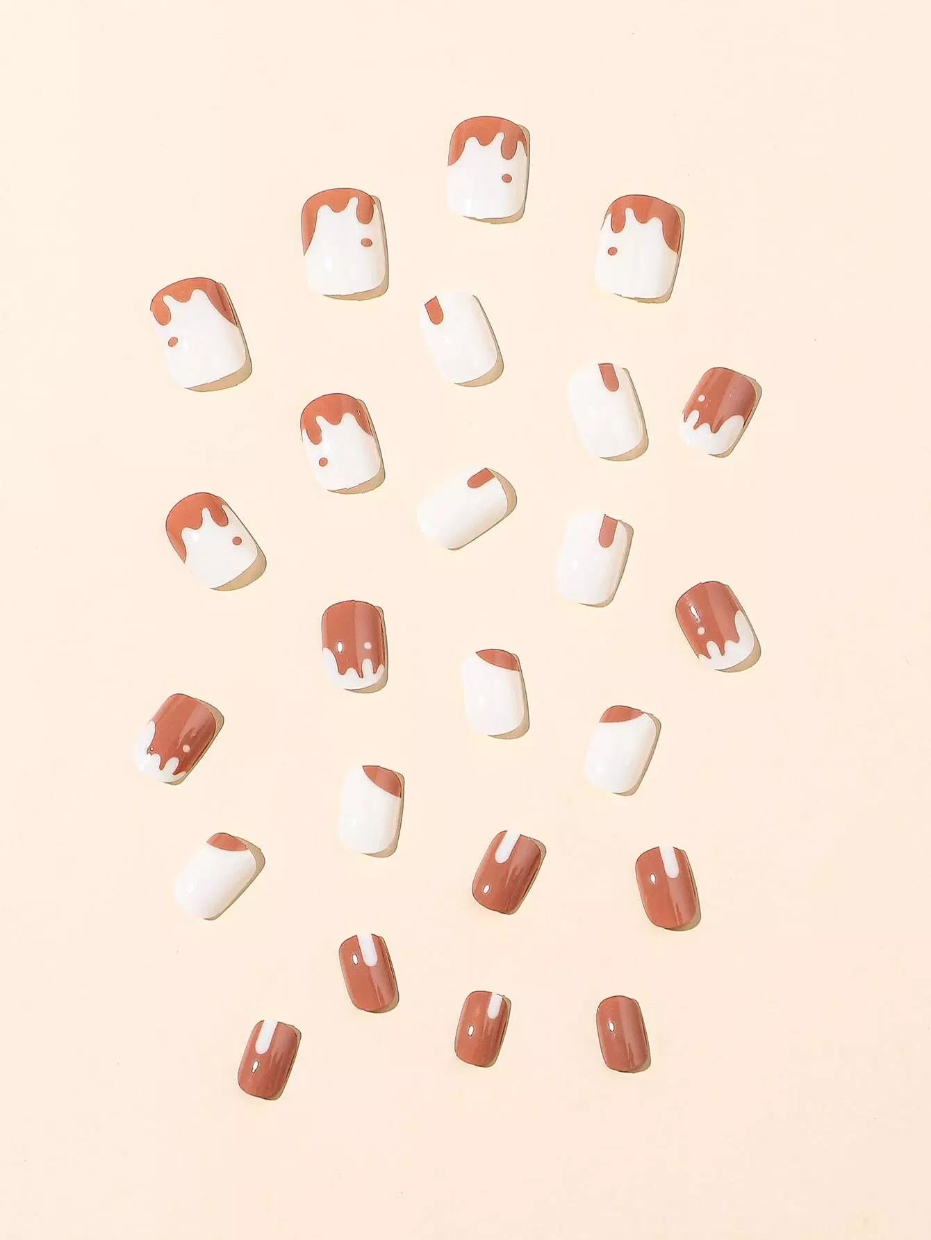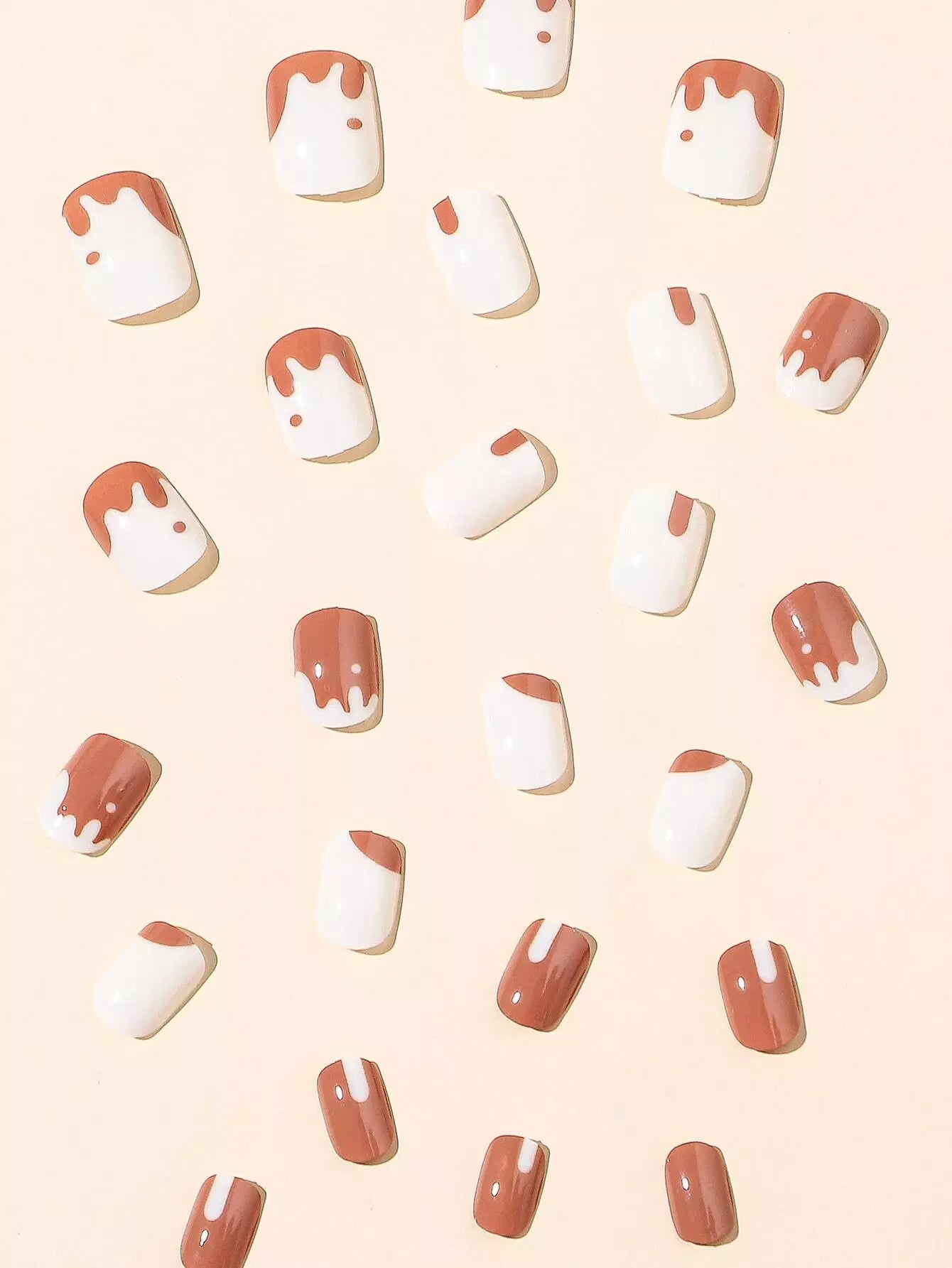 24 قطعة أظافر صناعية بطباعة كريمي و1 شريط لاصق و1 قطعة مبرد أظافر