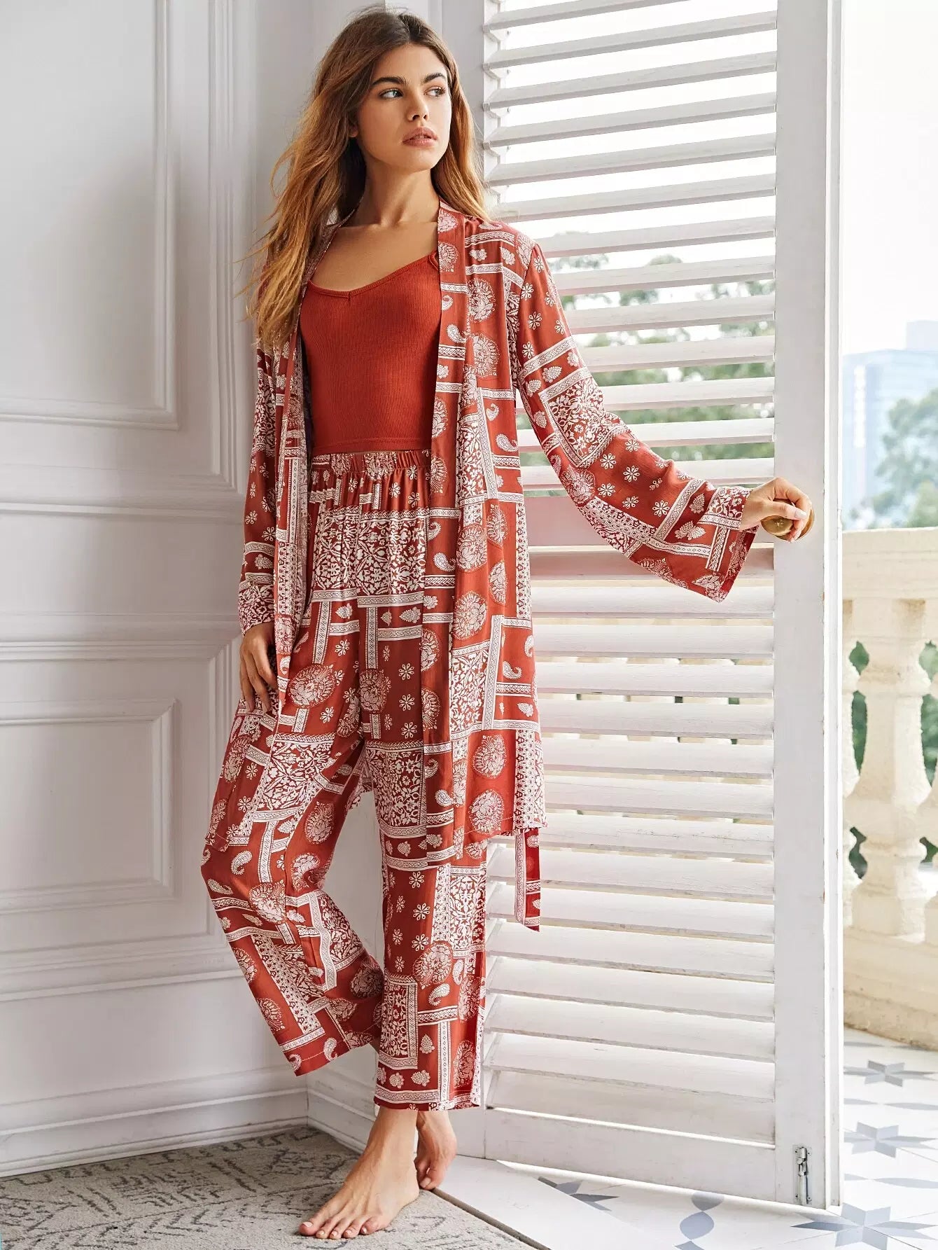 طقم روب طباعة وشاح 3 قطع بدون حزام