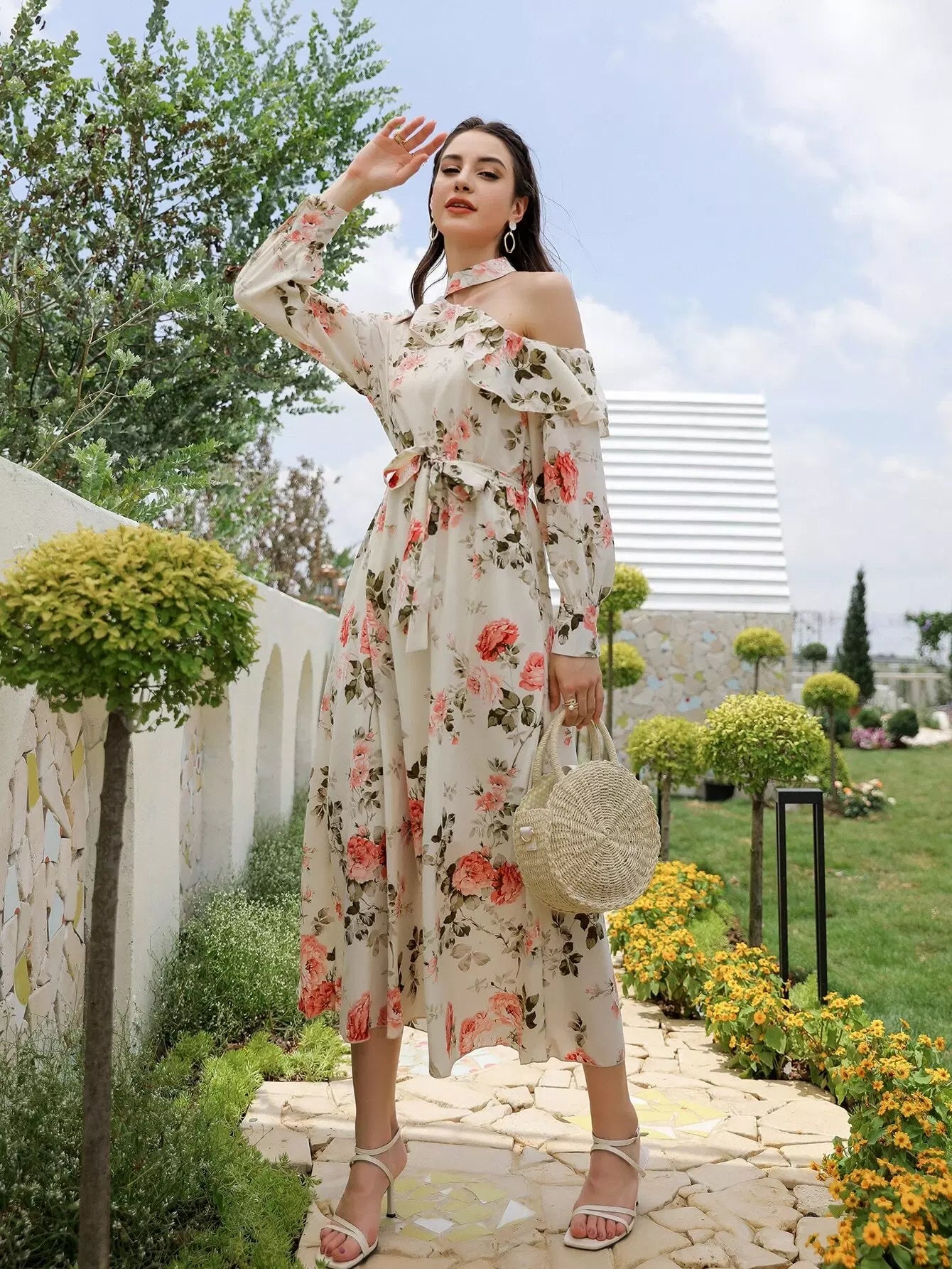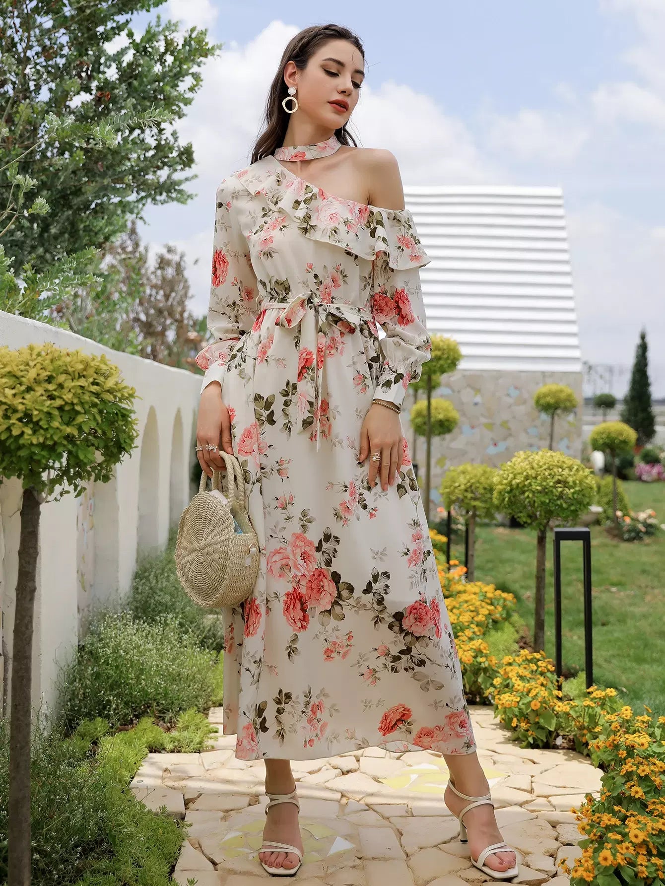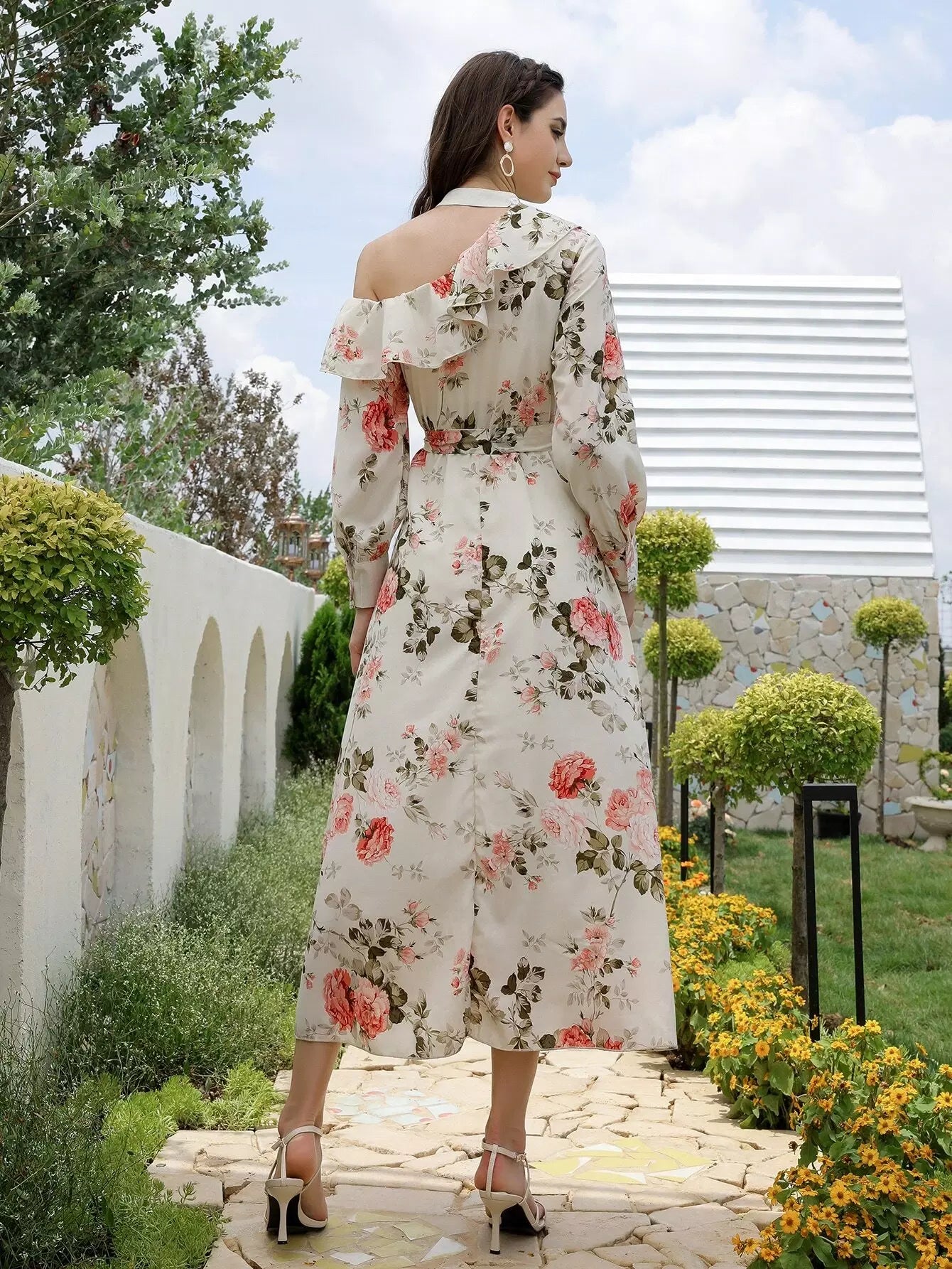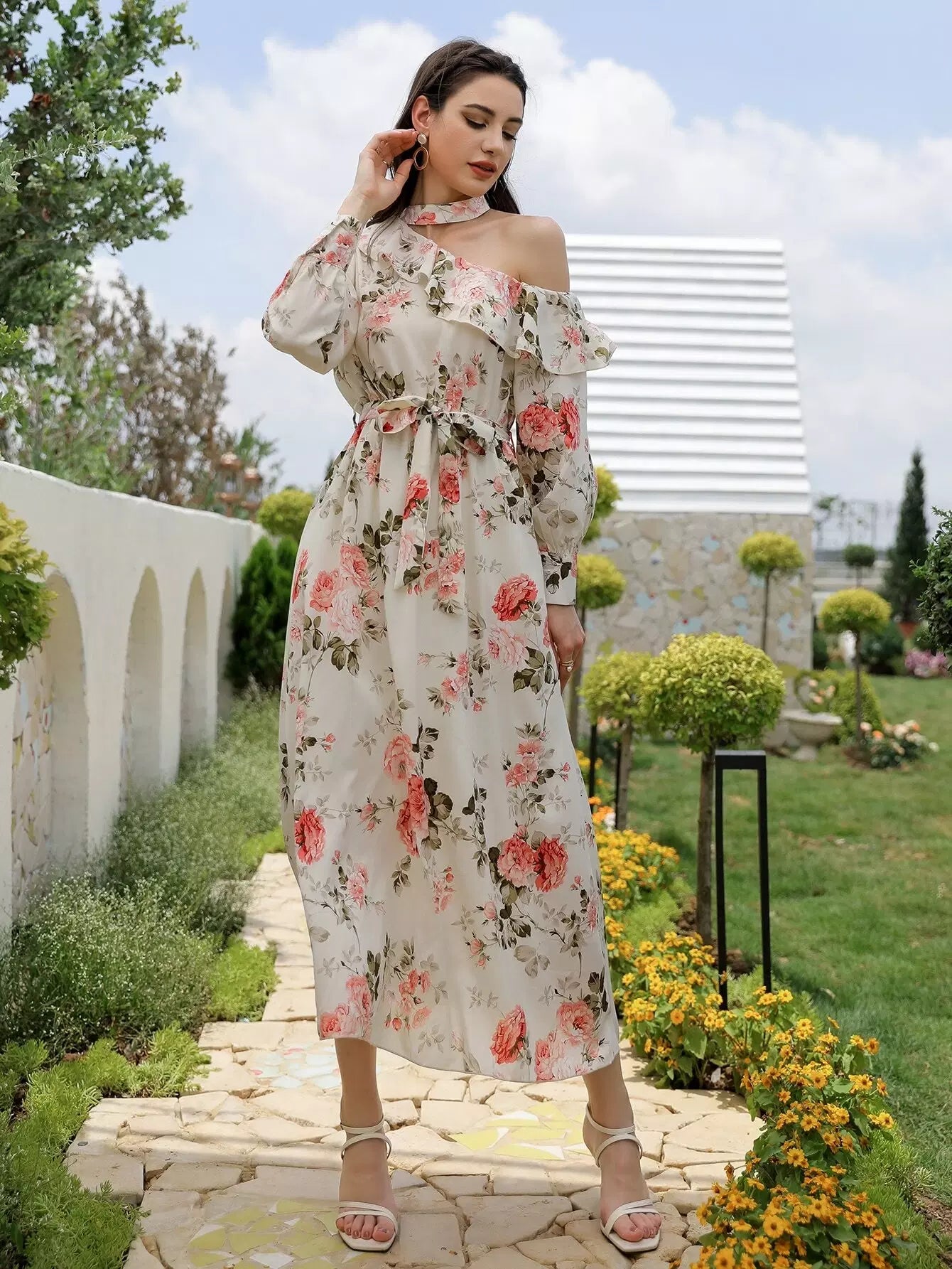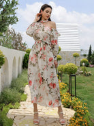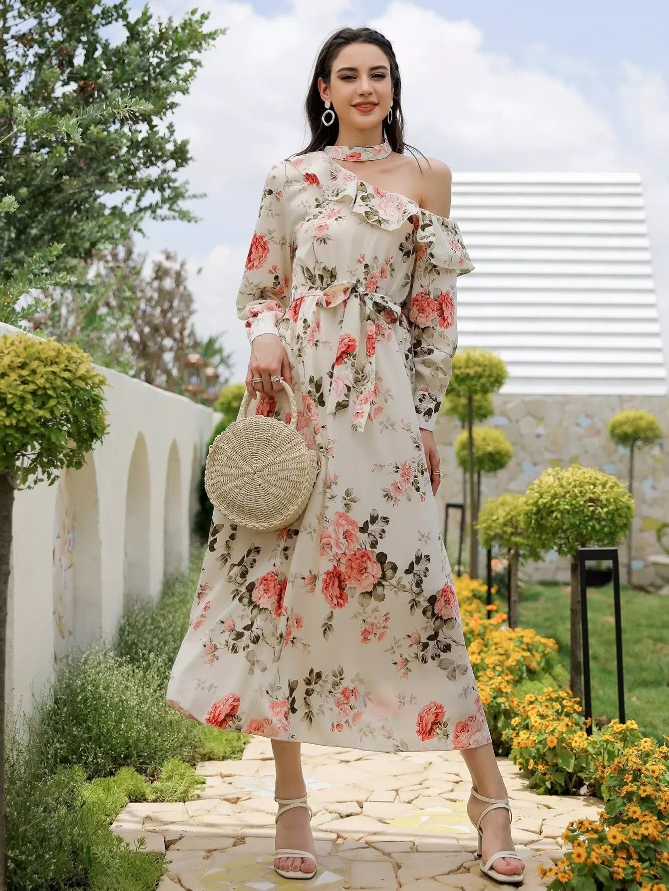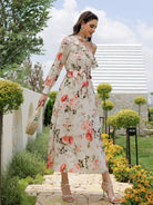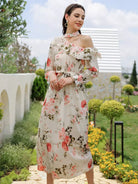 فستان برقبة غير متناظرة وطبعات زهور بدون حزام