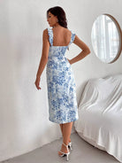فستان كُمي بطبعة زهور مطبوع فوقها بالكامل ومفتوح من الفخذين