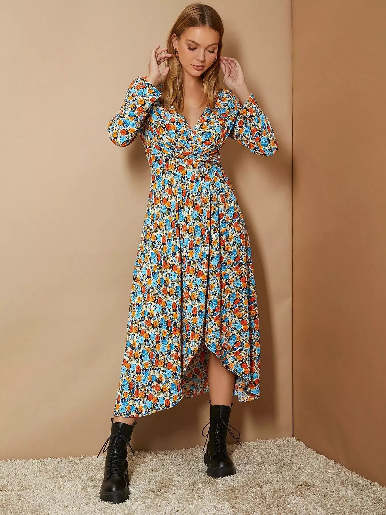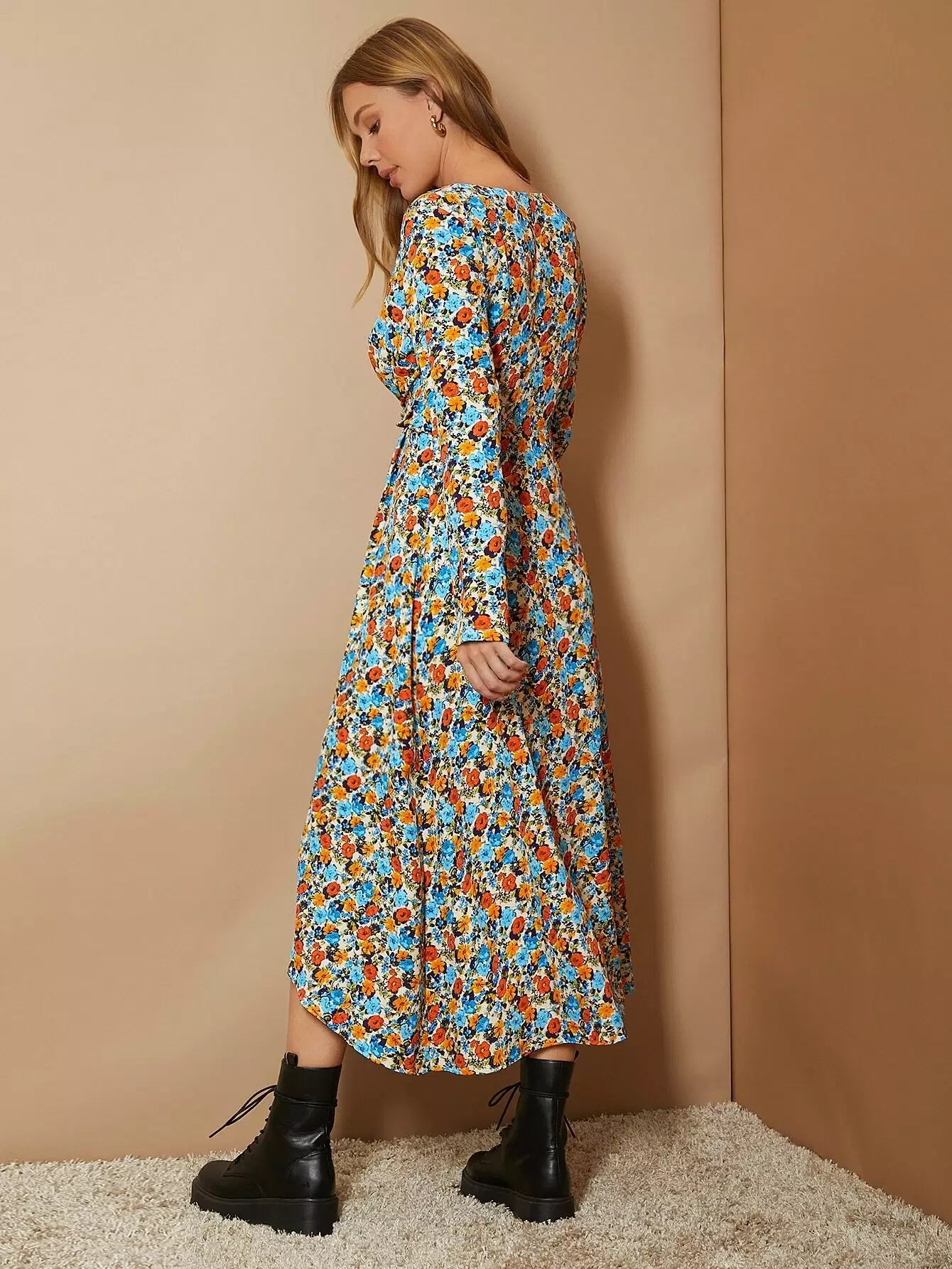 فستان ملفوف ملفوف من الأمام بطبعة زهور بالكامل
