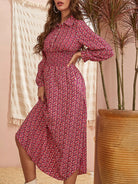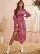 فستان بطبعة كاملة وأزرار نصفية وخصر مجعد