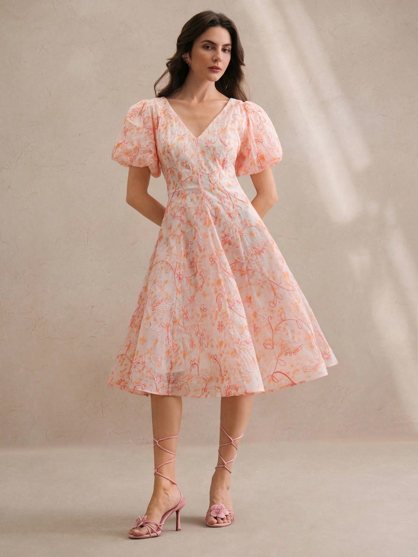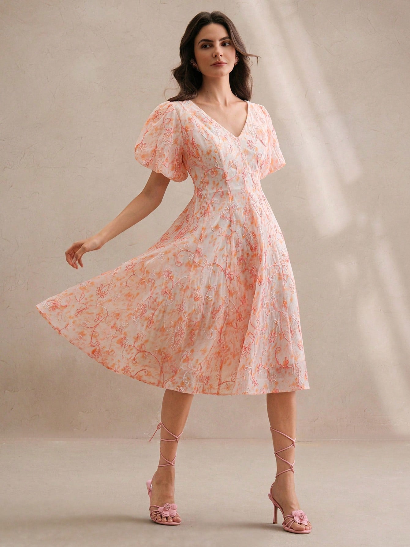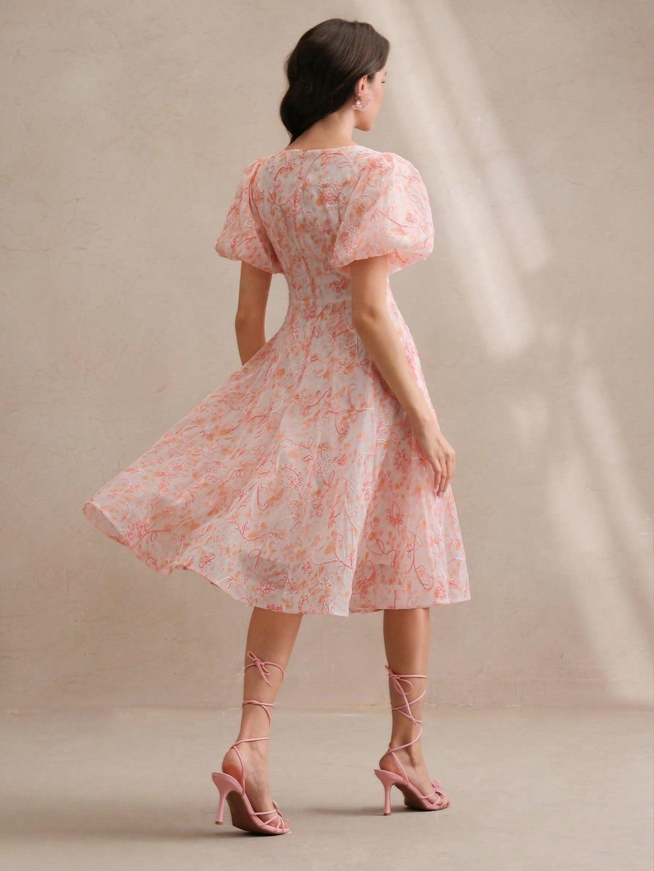 فستان أنيوستا النسائي ذو الخصر المحبوك والمطرز بالزهور الصغيرة باللون الأخضر