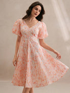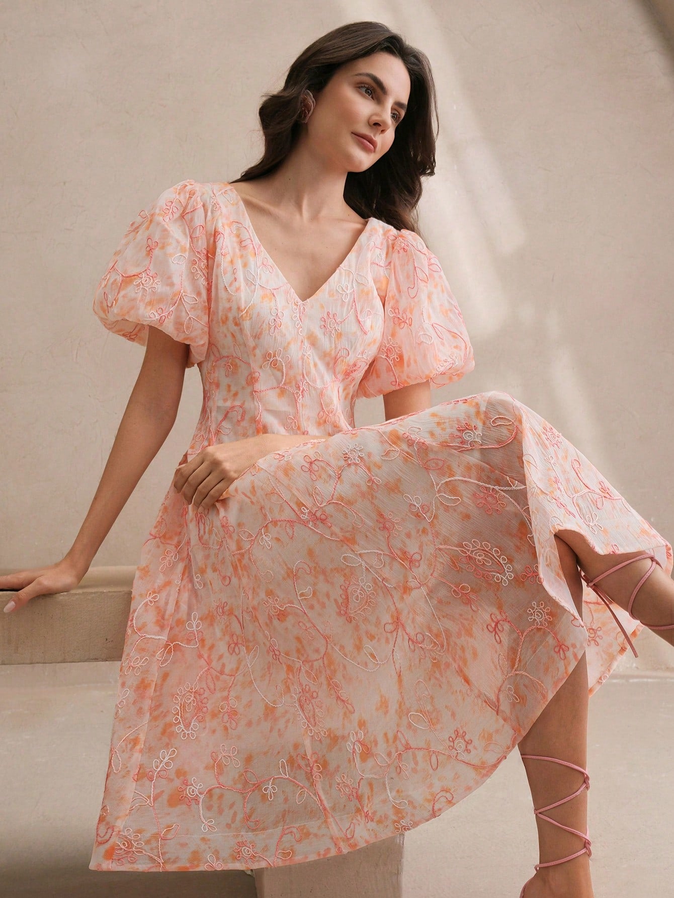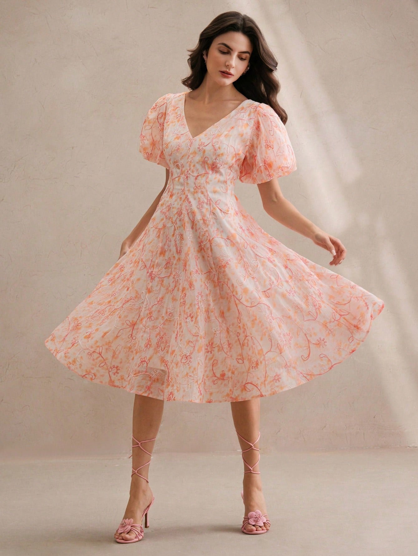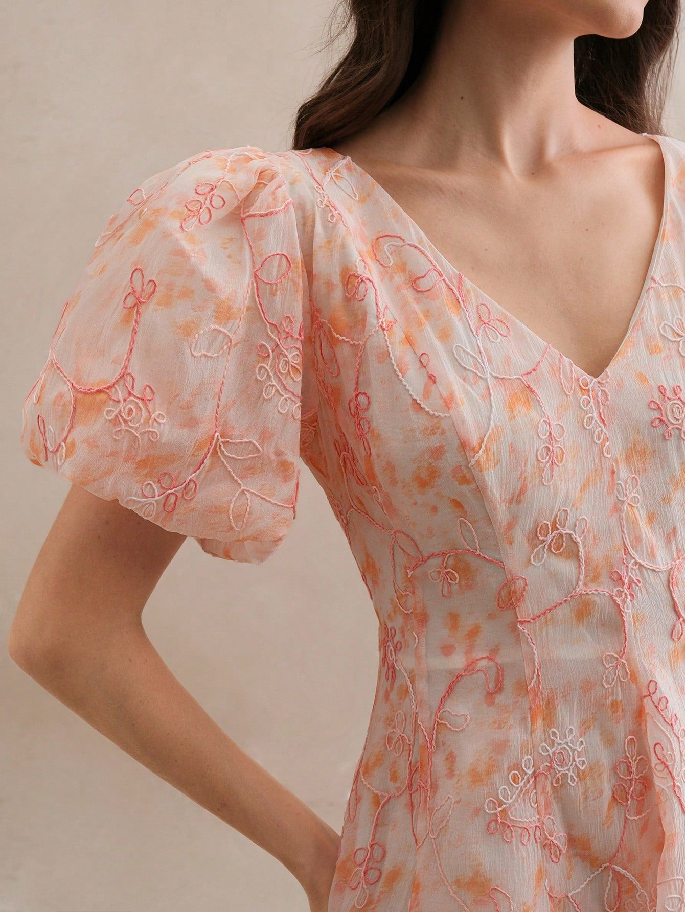فستان أنيوستا النسائي ذو الخصر المحبوك والمطرز بالزهور الصغيرة باللون الأخضر