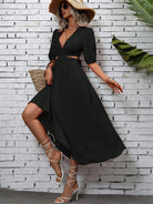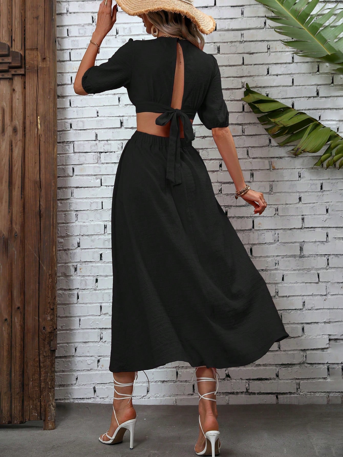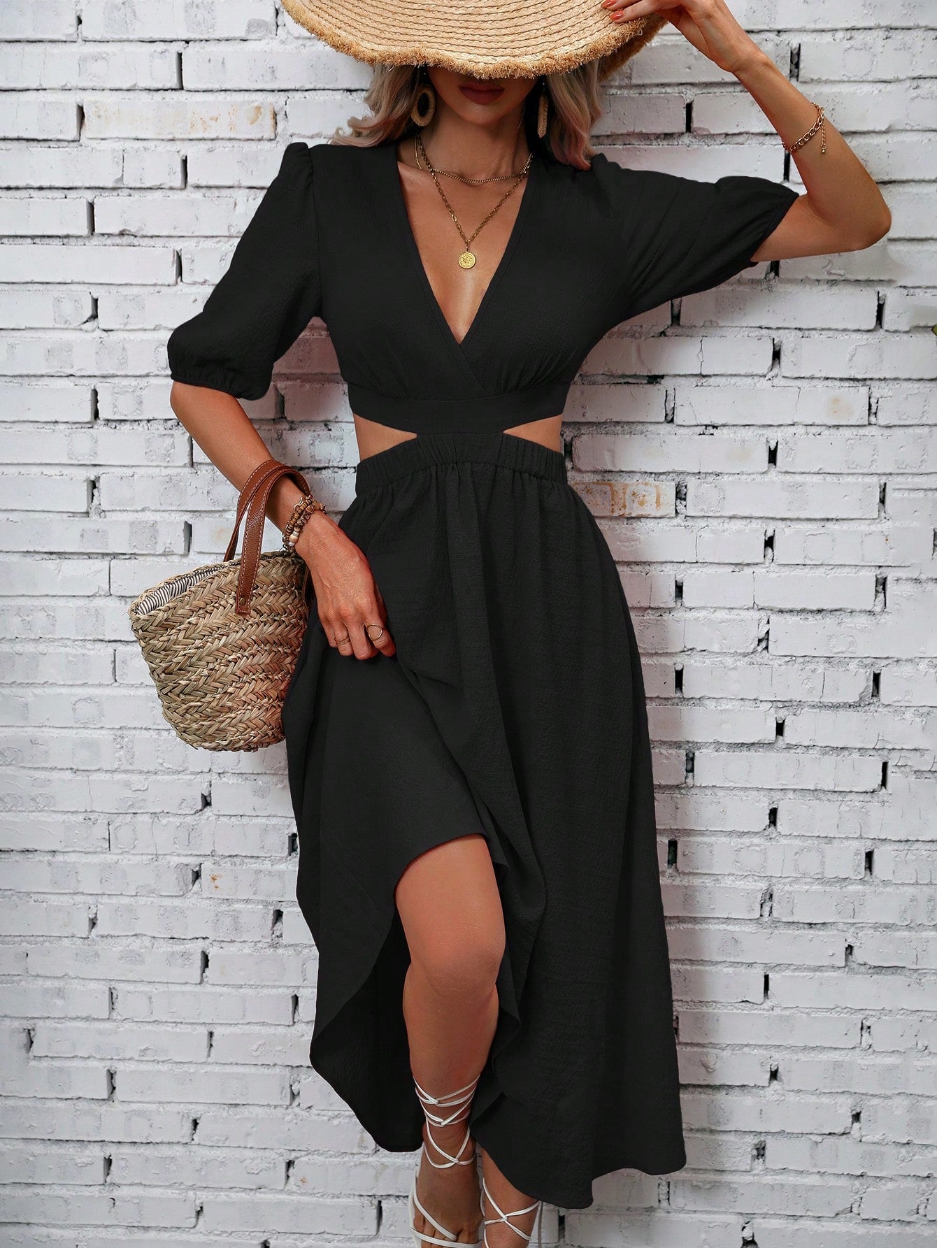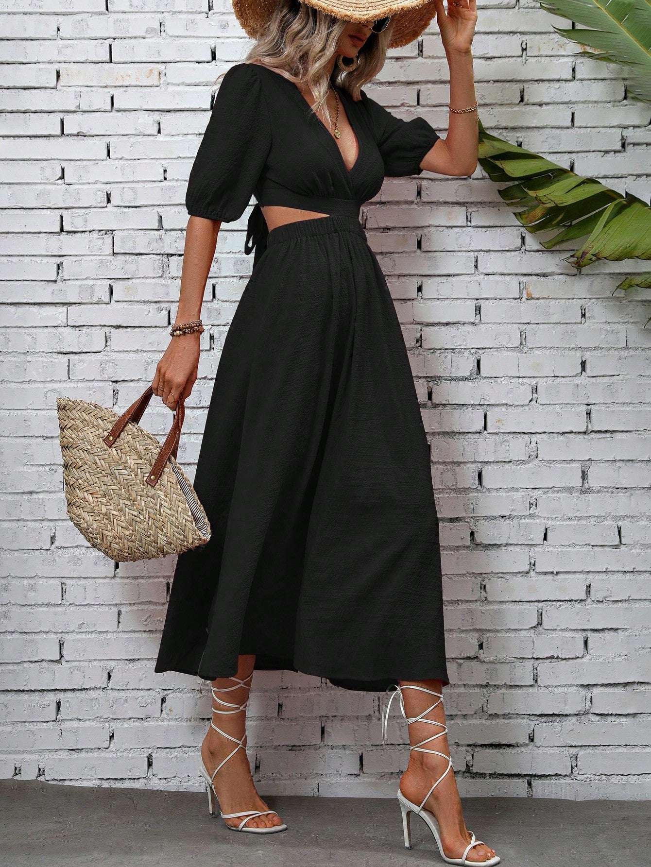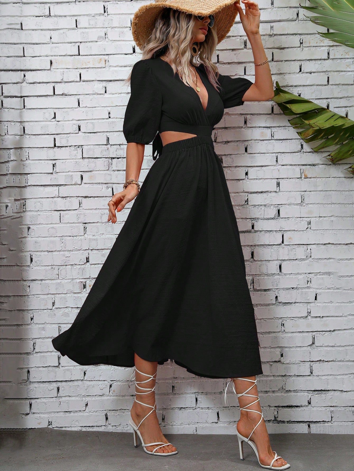 Breezaya Plunging Neck Cut Out Waist Puff Sleeve Dress Maxi Women Outfit