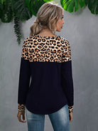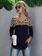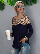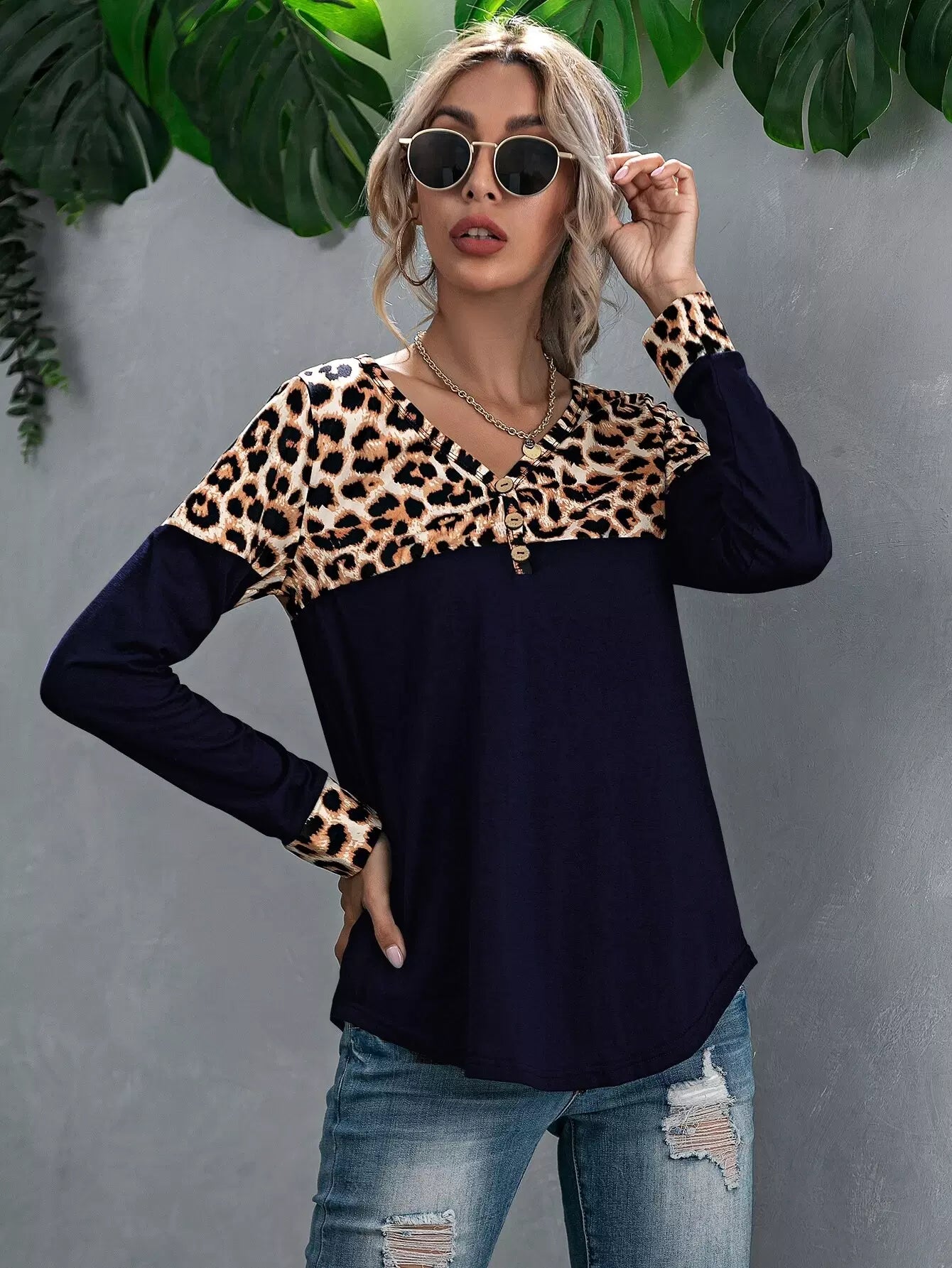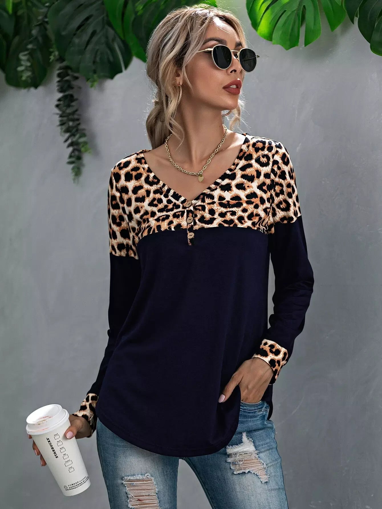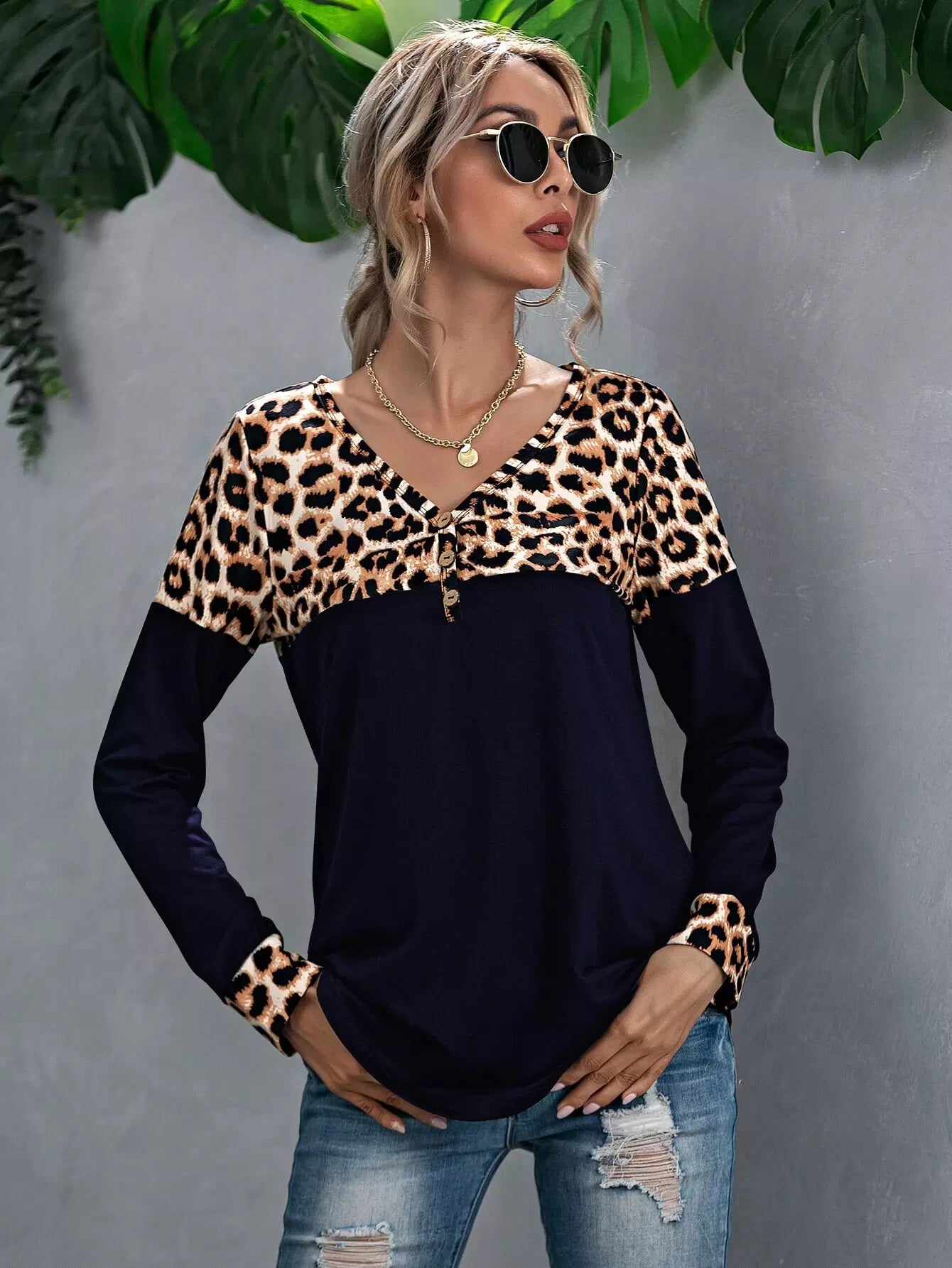 تي شيرت بأزرار أمامية بأزرار بلون جلد النمر بلون مغاير