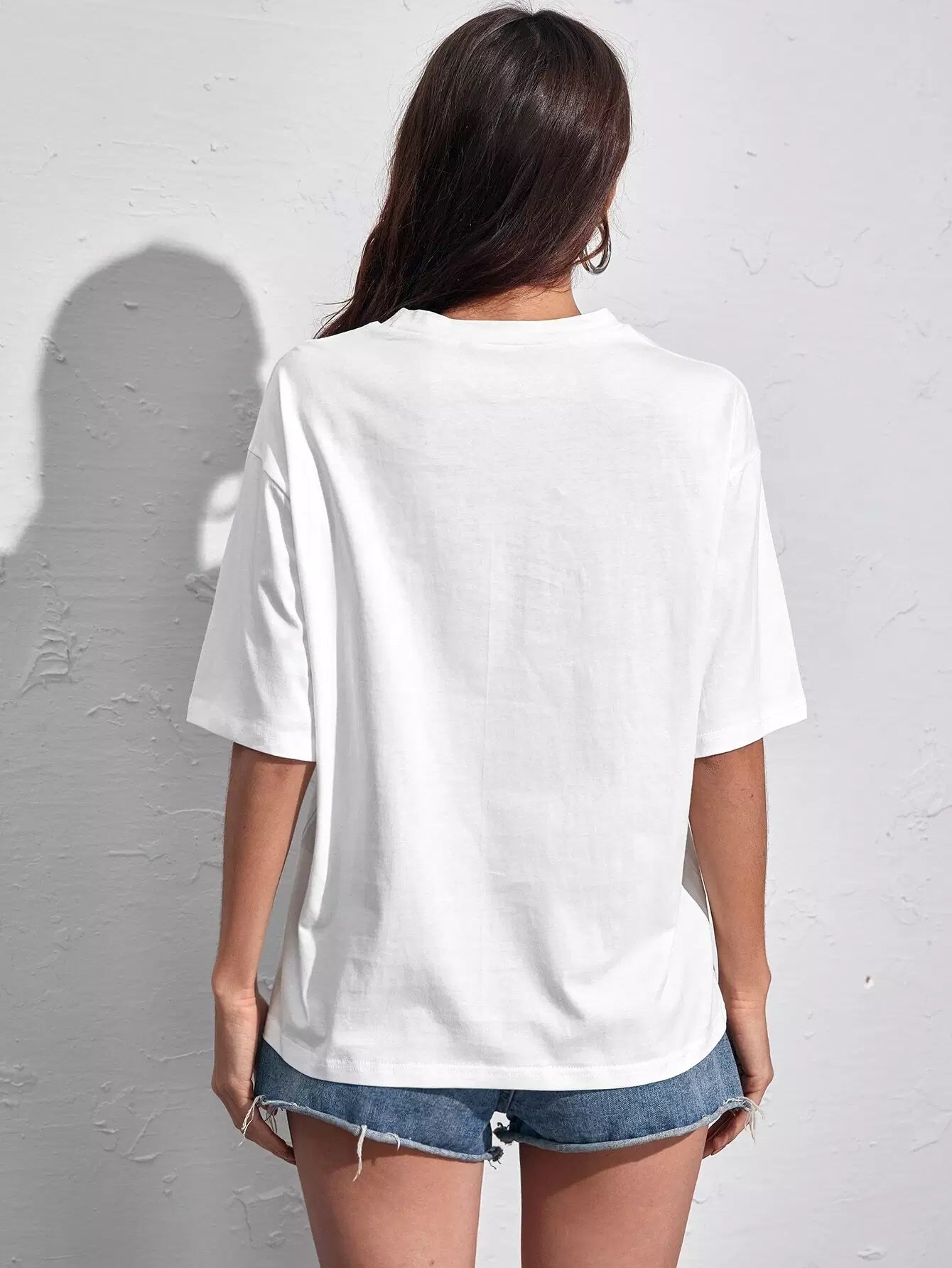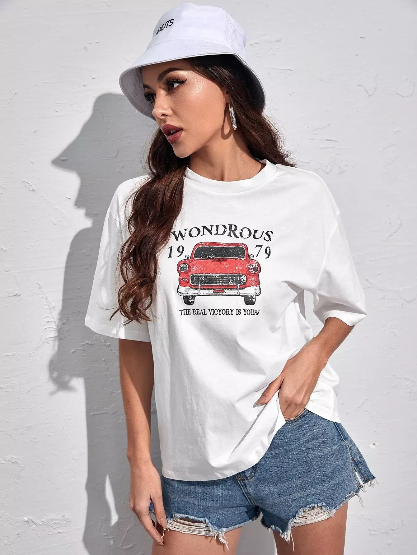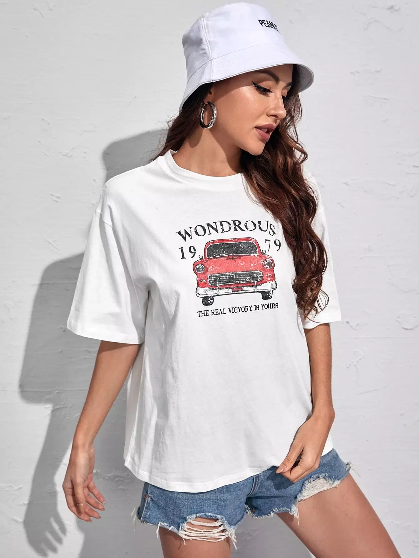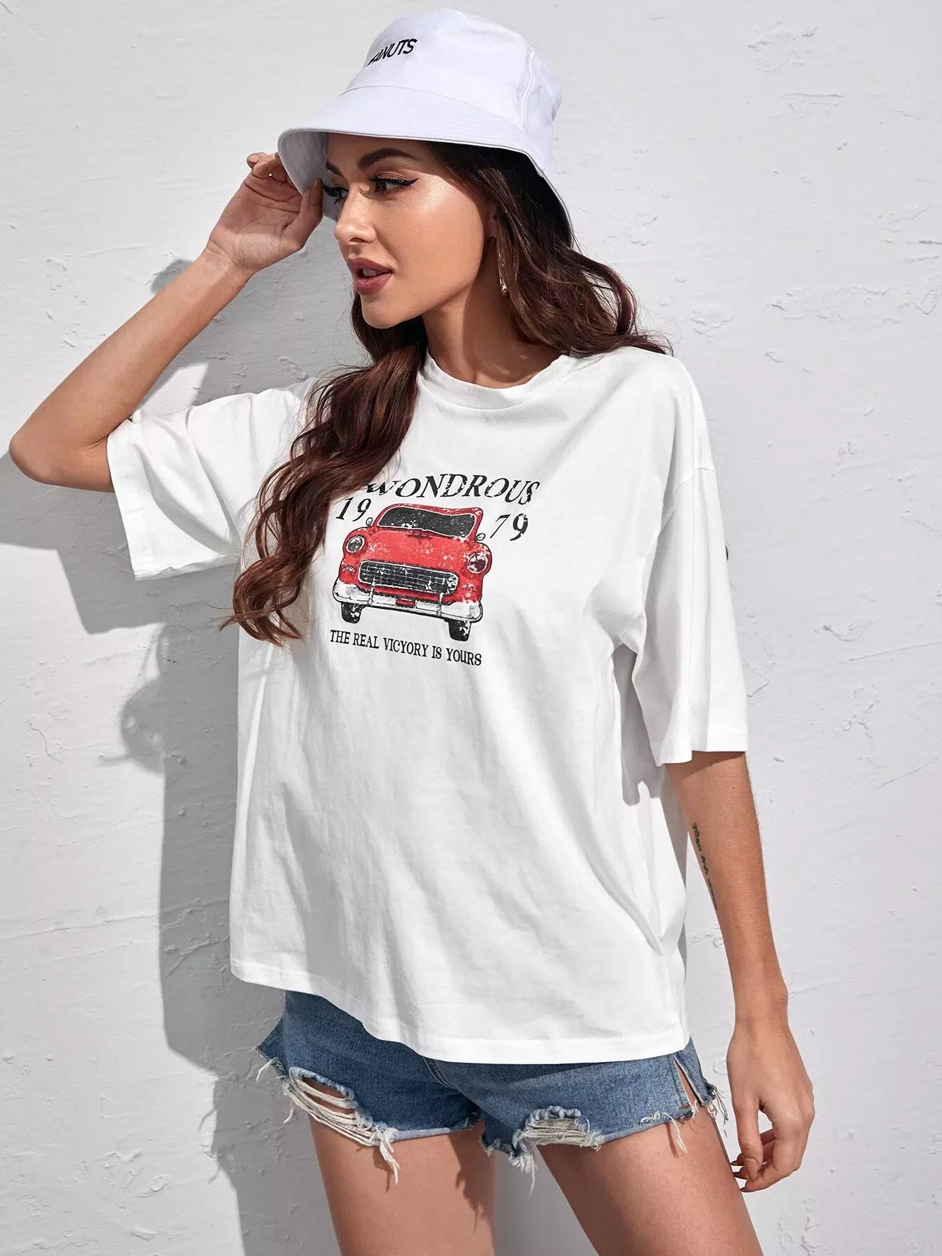 تي شيرت منسدل الكتف برسمة سيارة وشعار
