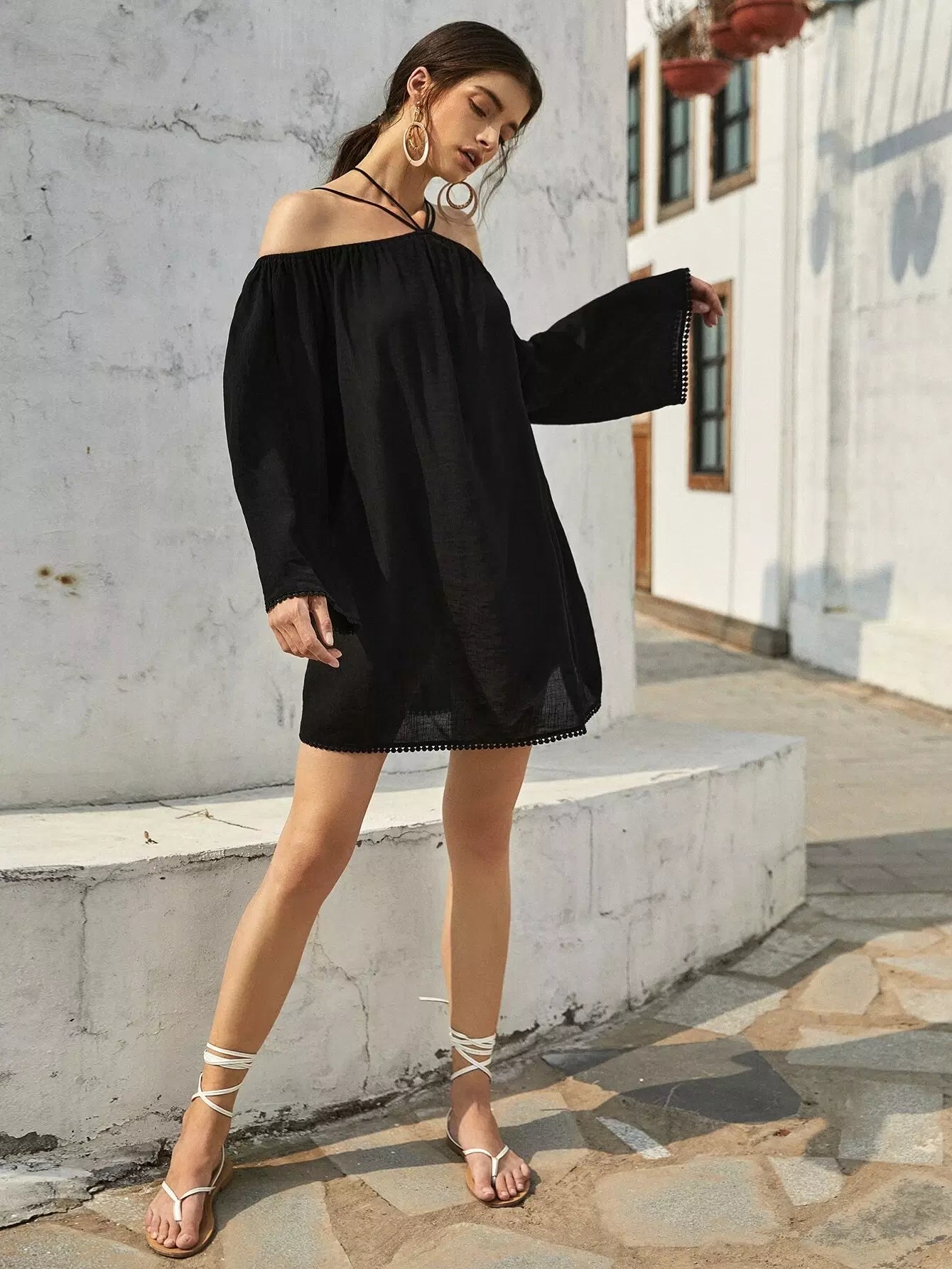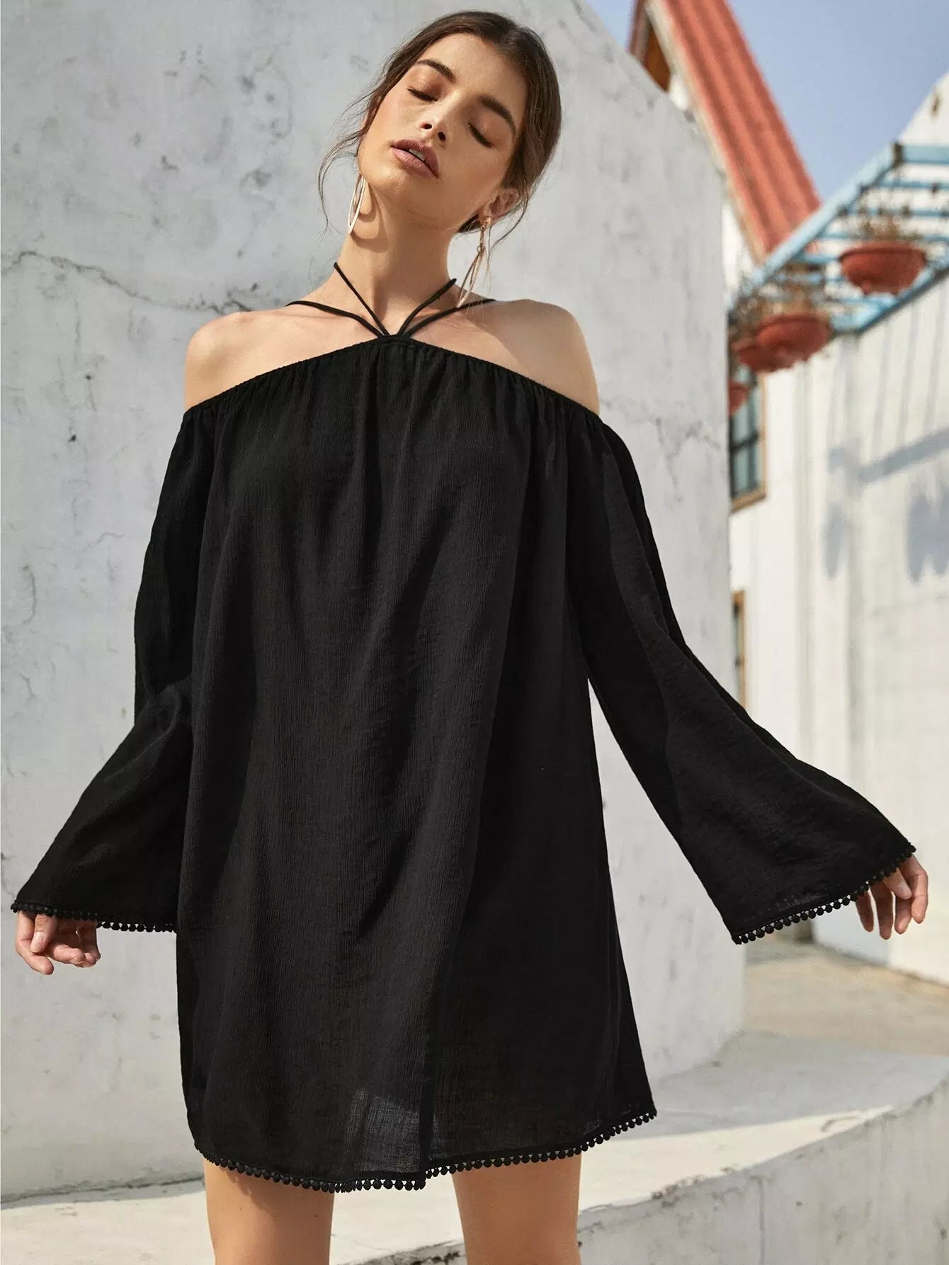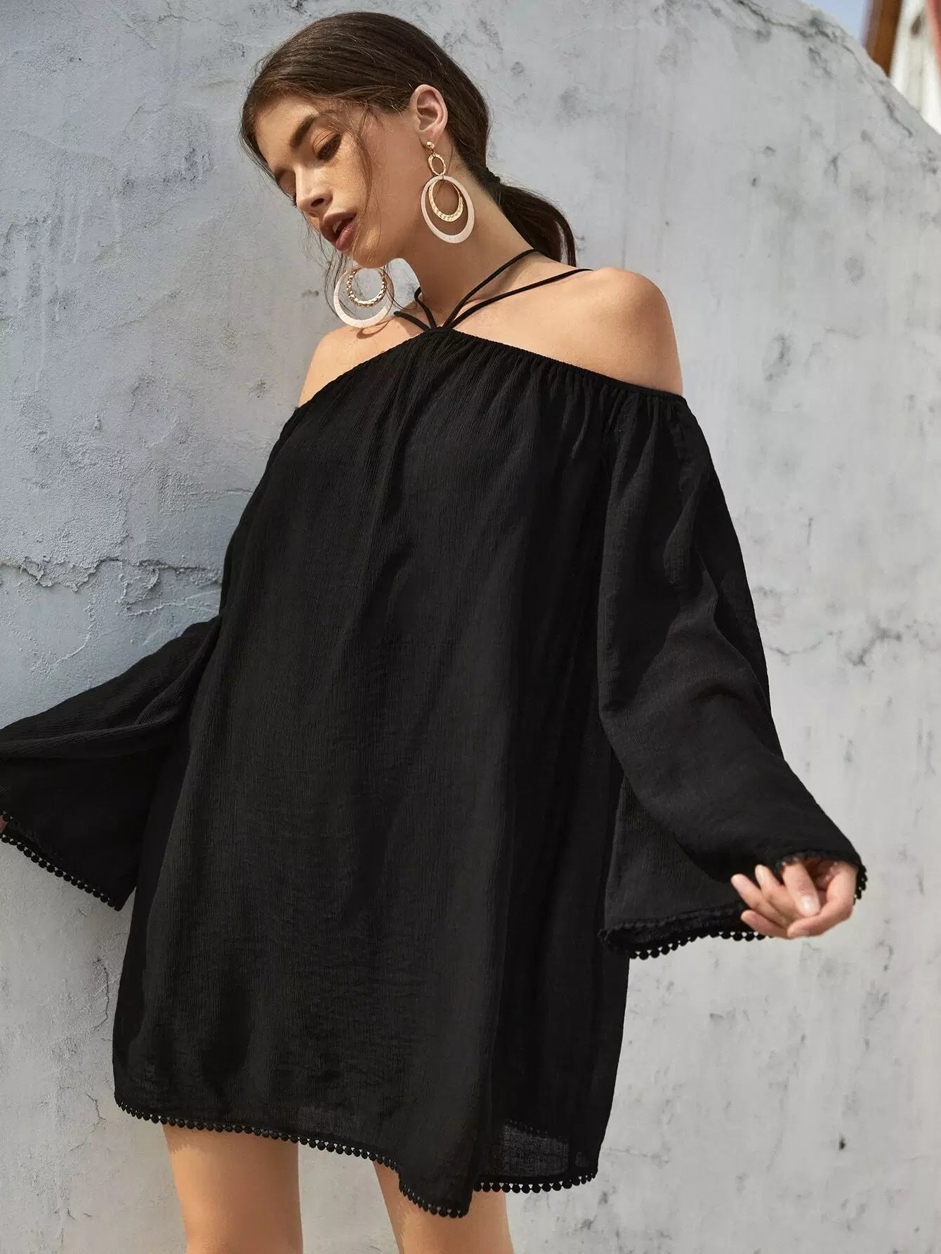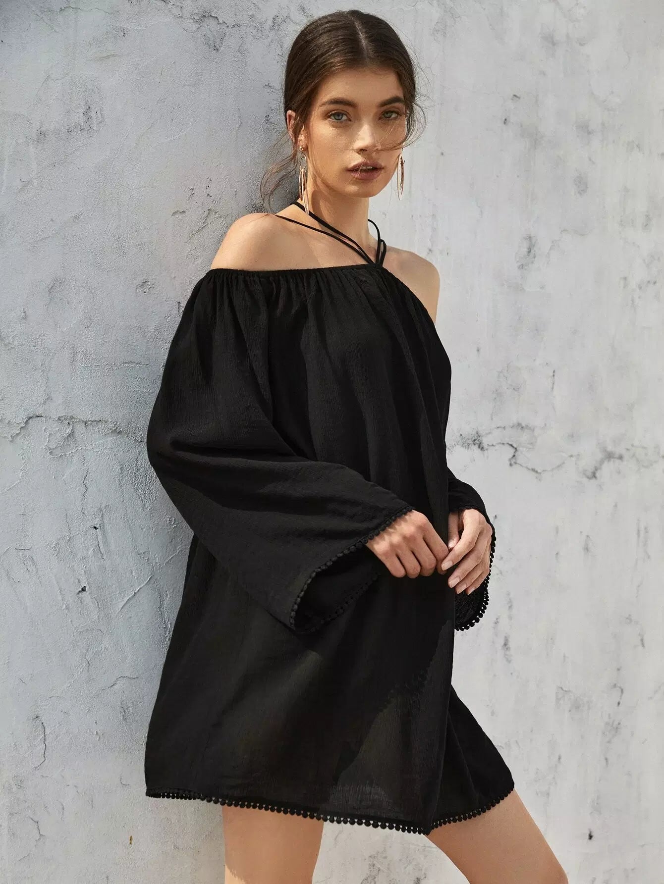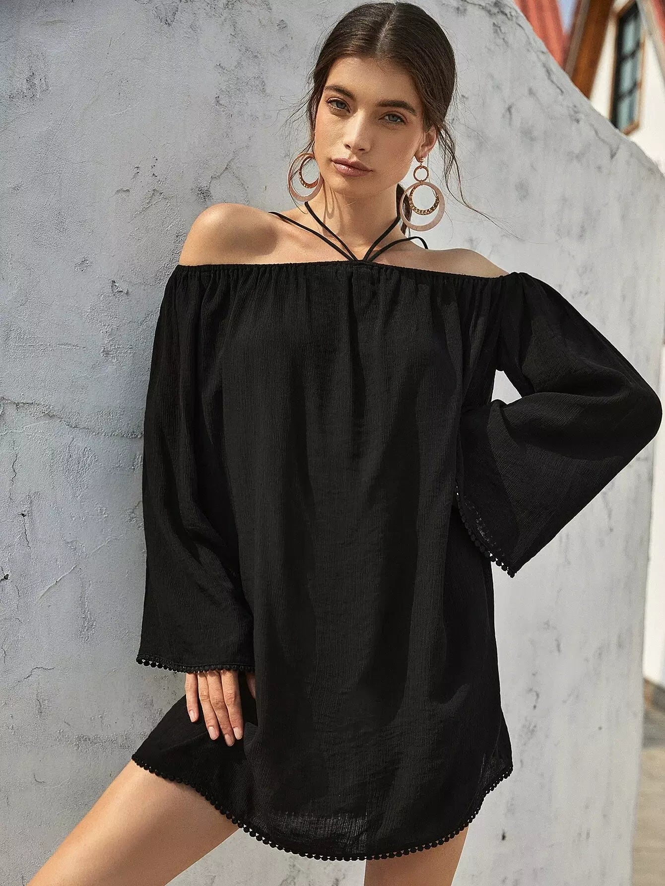 بلوزة بأكتاف باردة برباط من الدانتيل على الظهر برباط على الكتف البارد