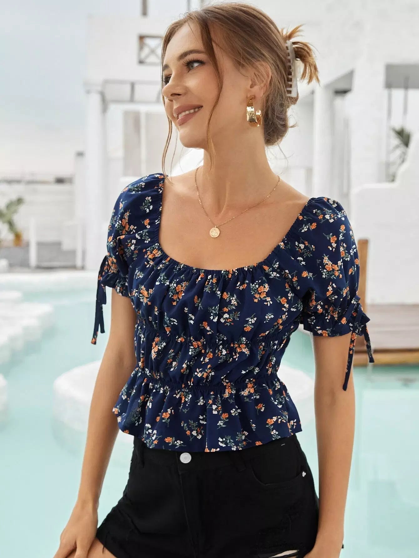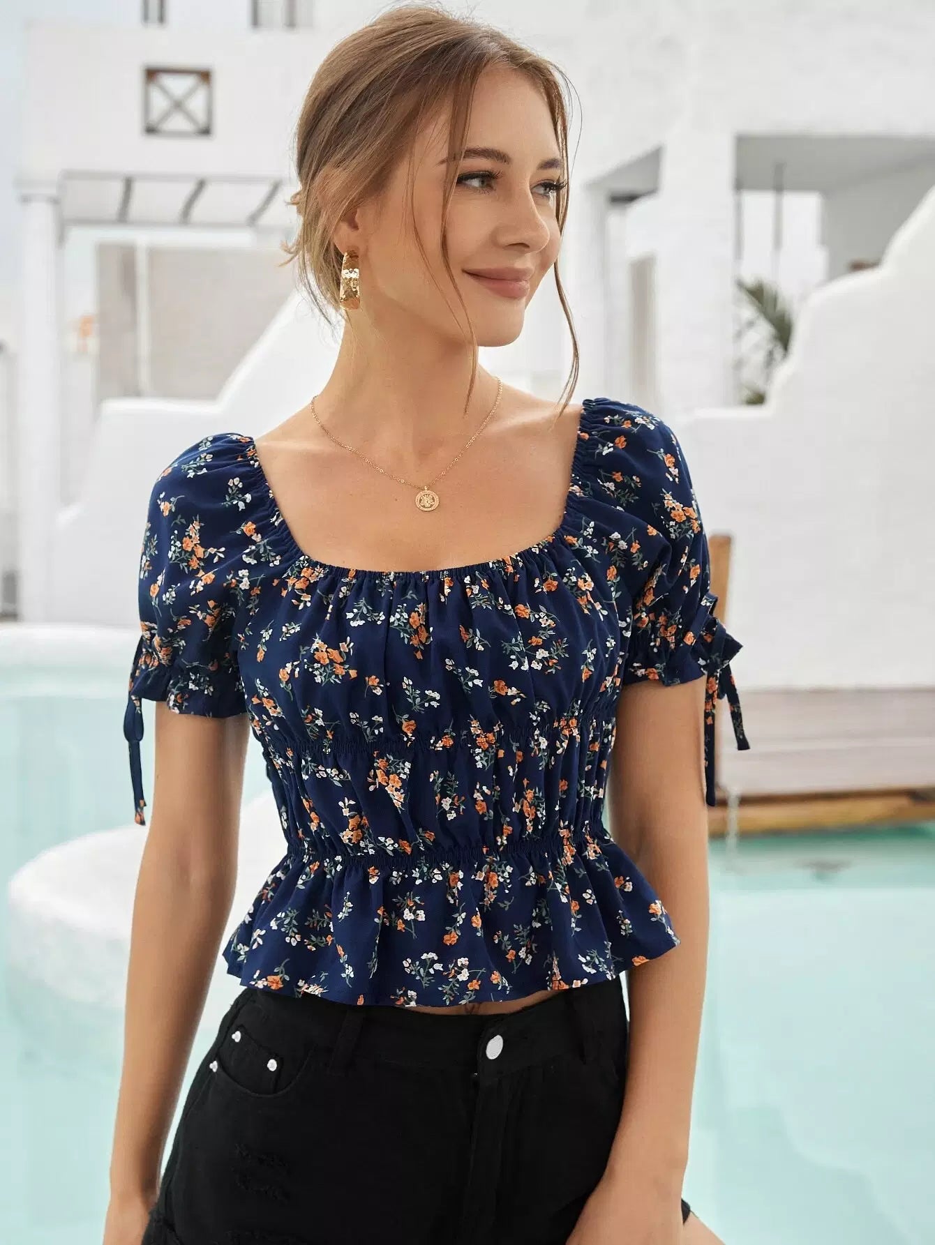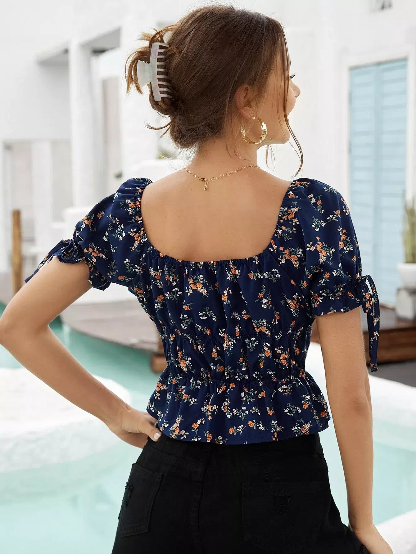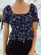 بلوزة ديتسي ذات عقدة زهرية ذات حافة كشكش مزينة بالورود