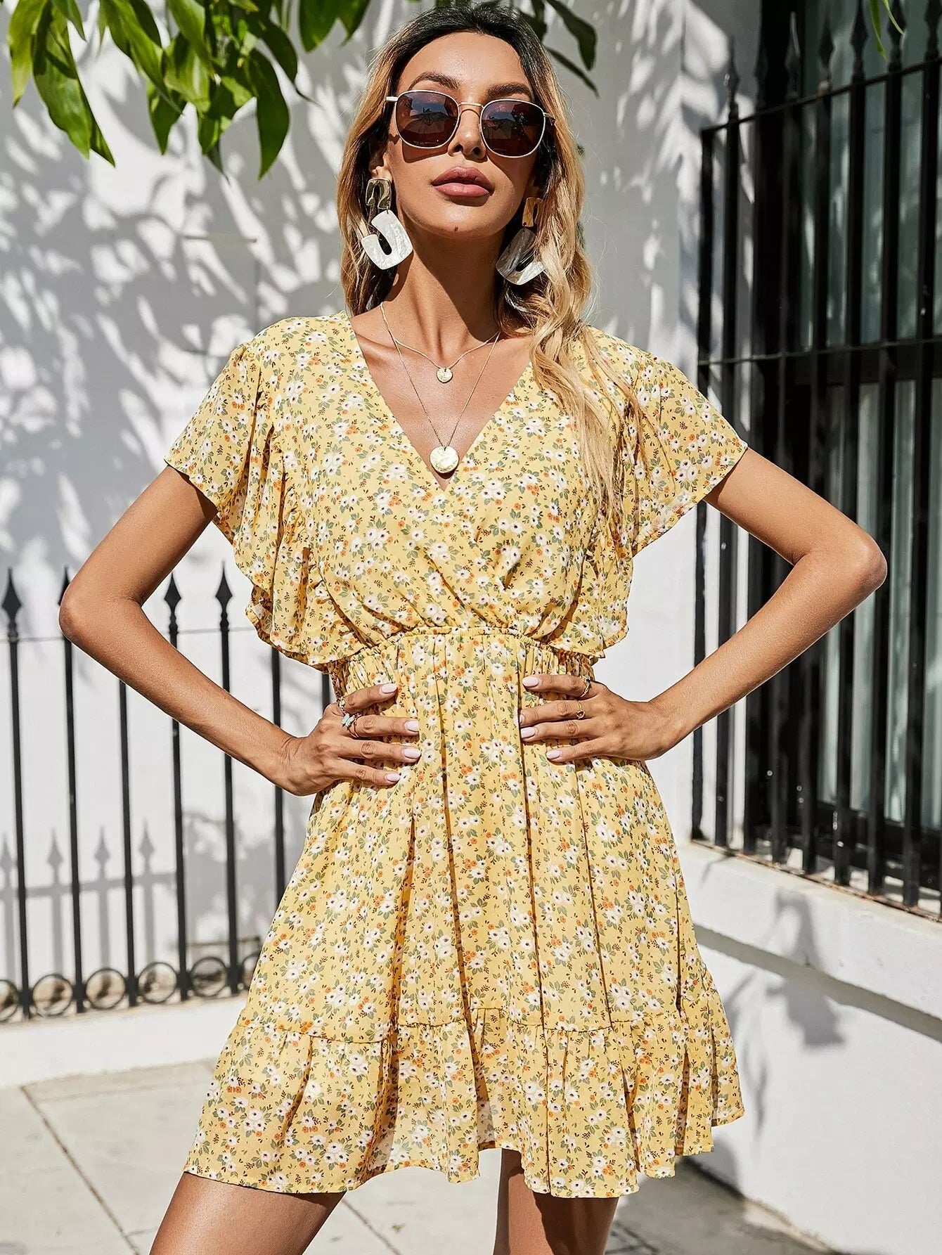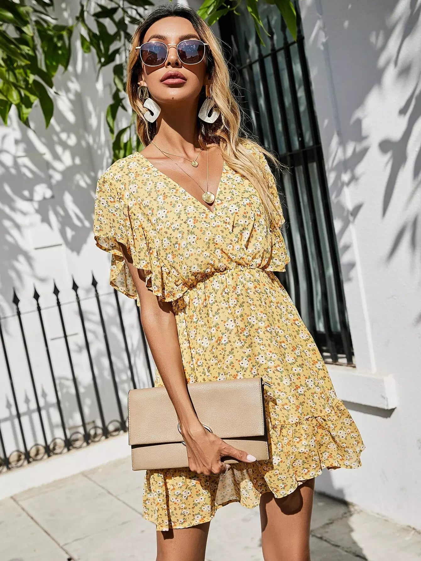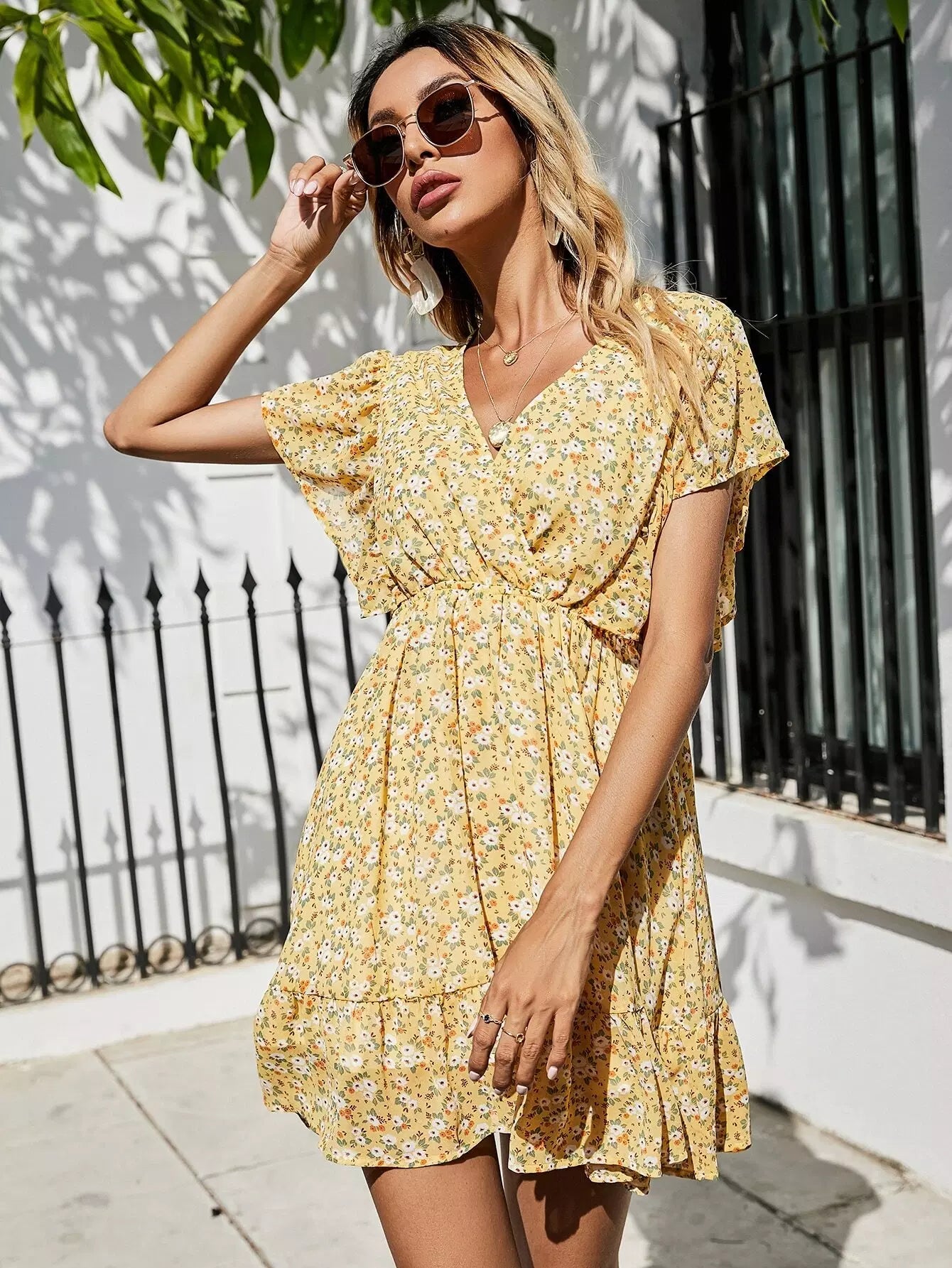 فستان ديتسي بطبعة زهور كشكش من الأمام بطبعة زهور