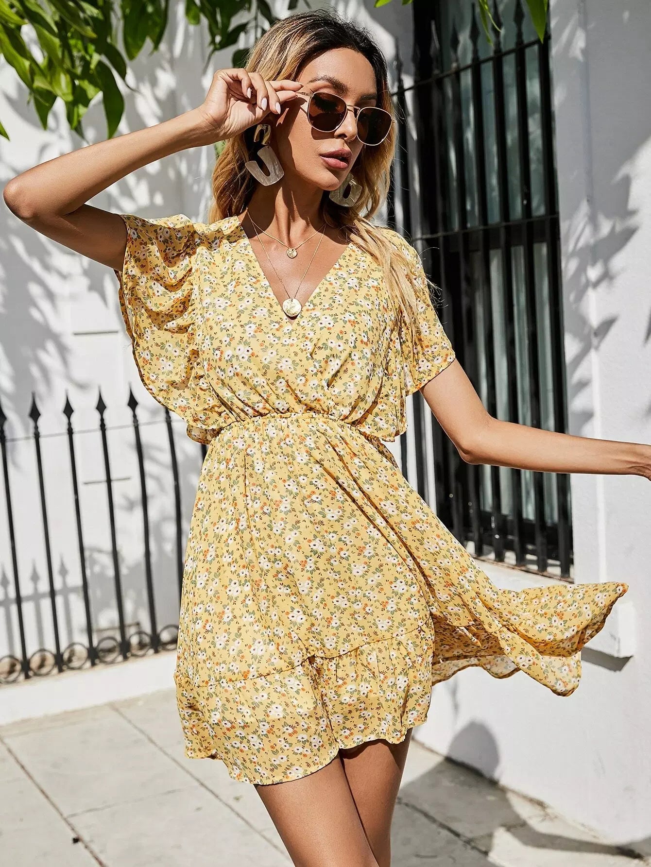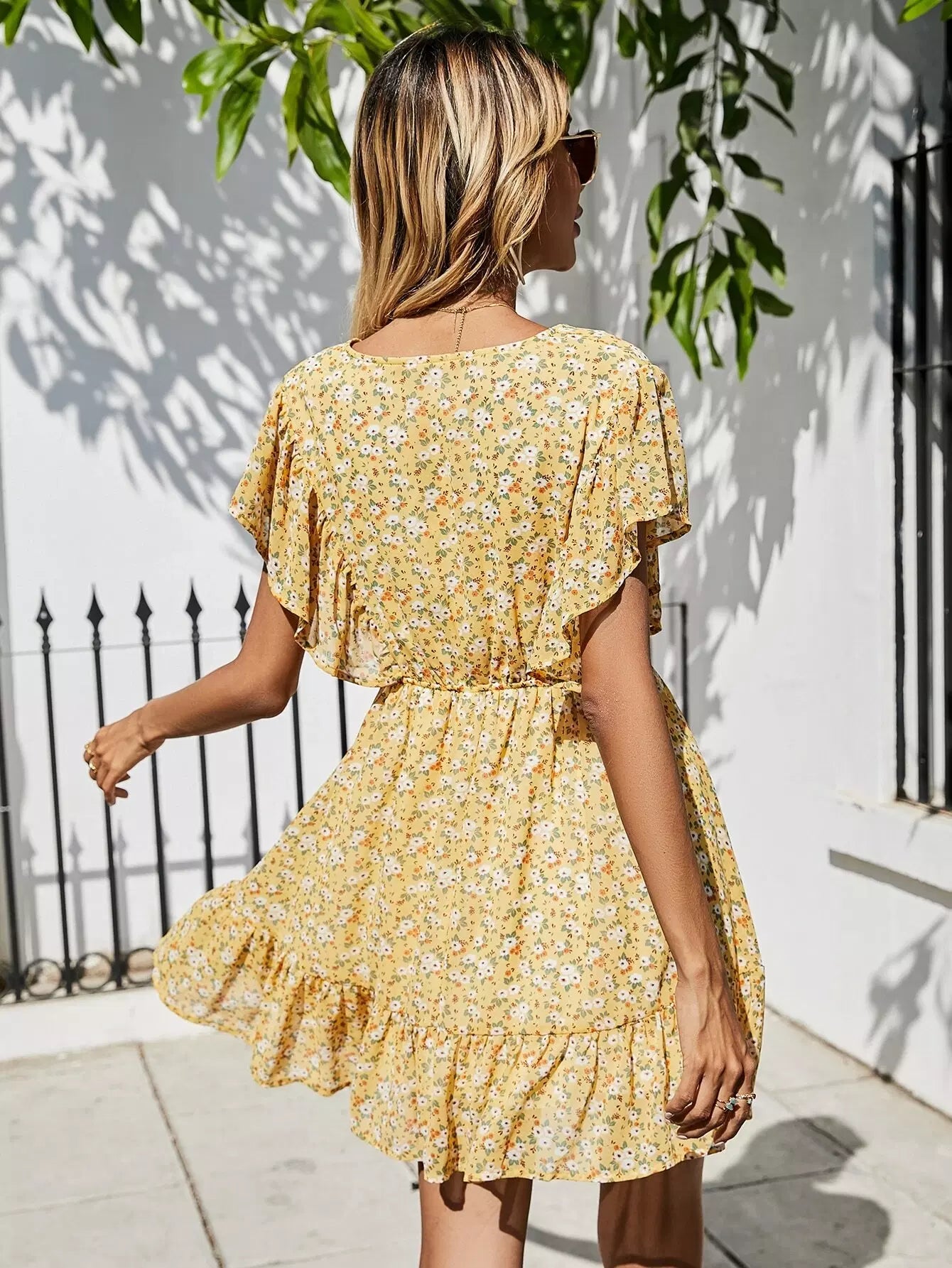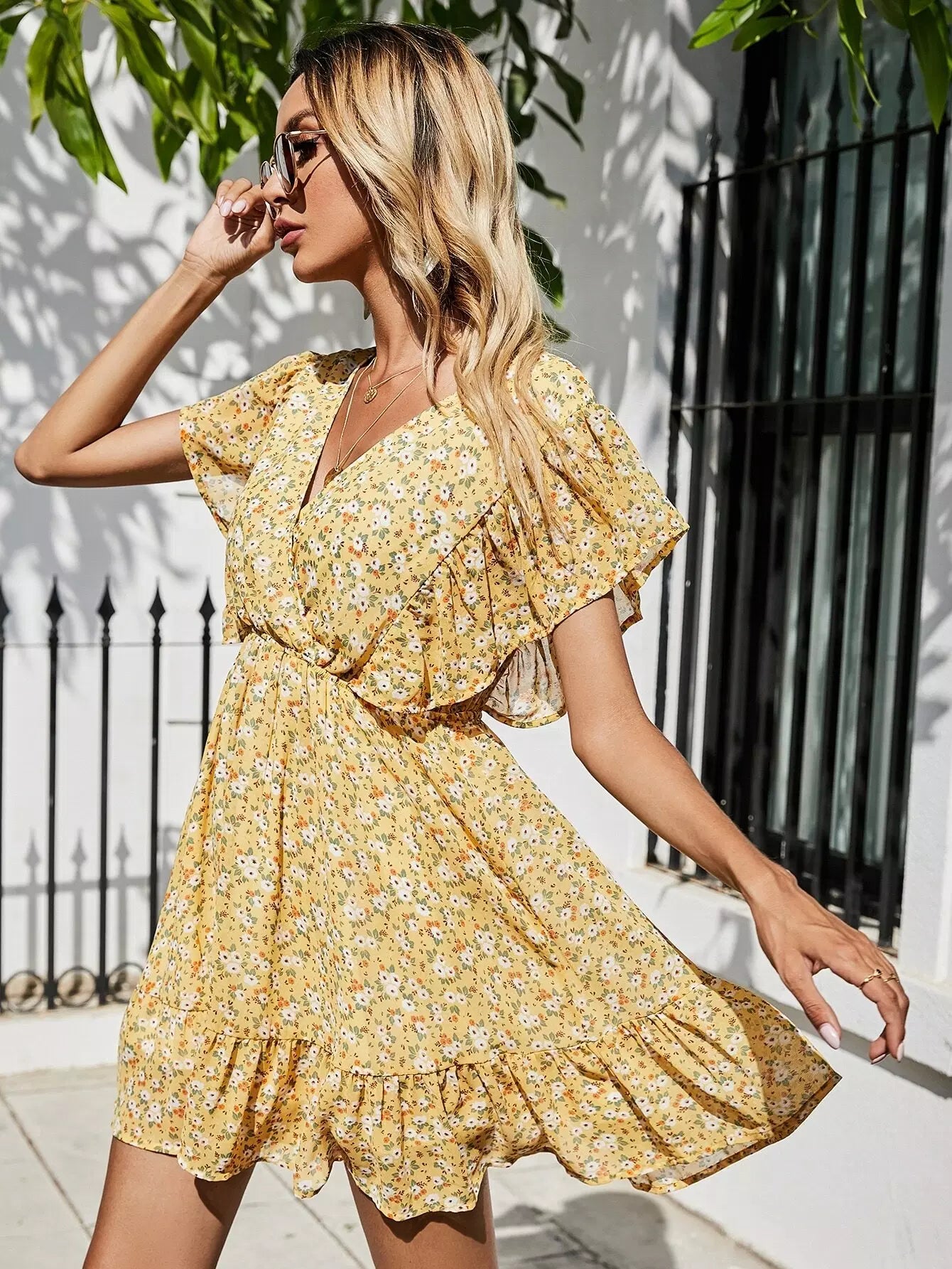 فستان ديتسي بطبعة زهور كشكش من الأمام بطبعة زهور