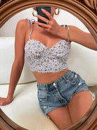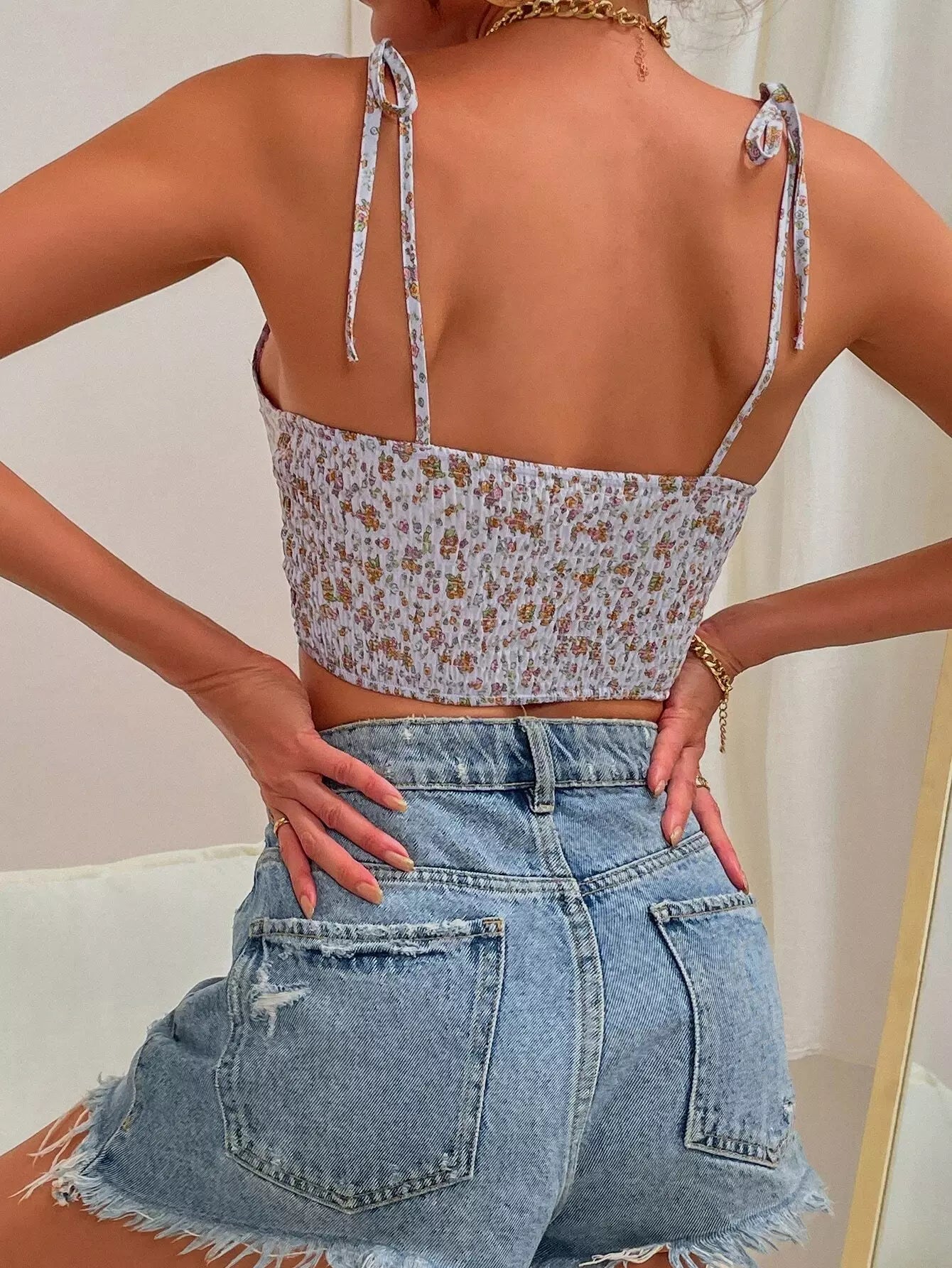 بلوزة قصيرة بطبعة زهور صغيرة مع ربطة على الكتف وظهر مجعد