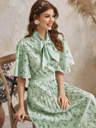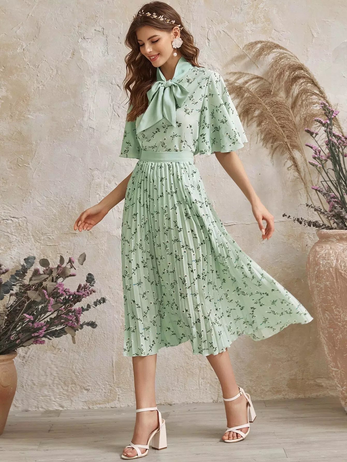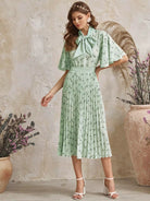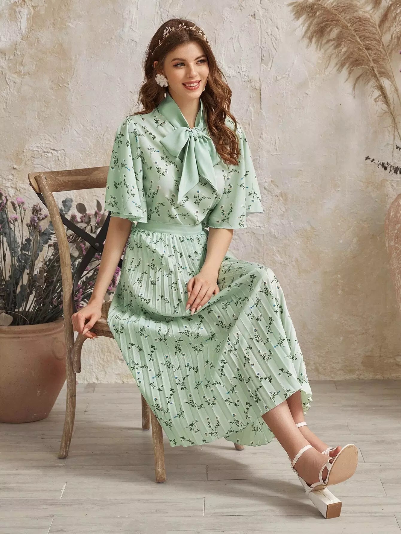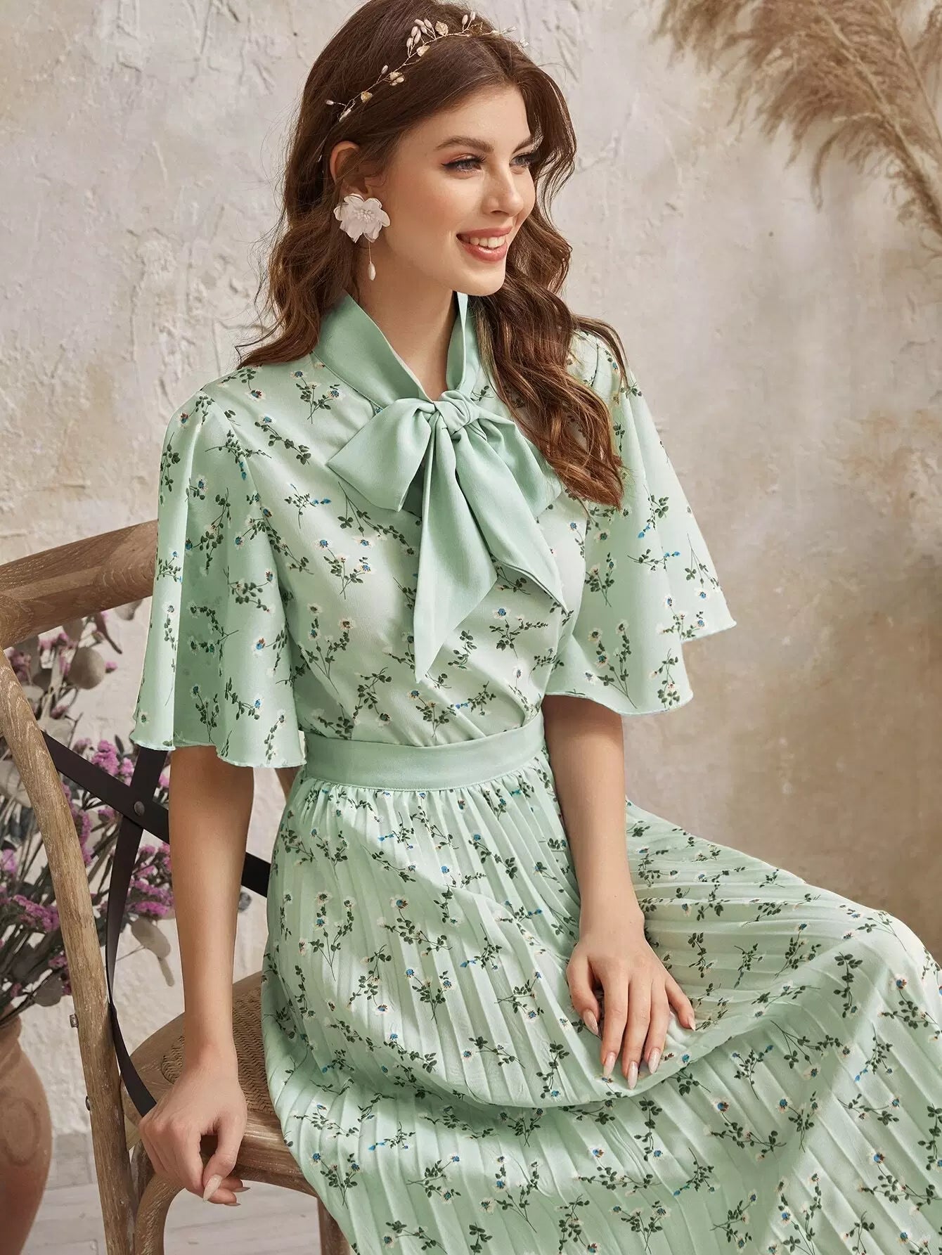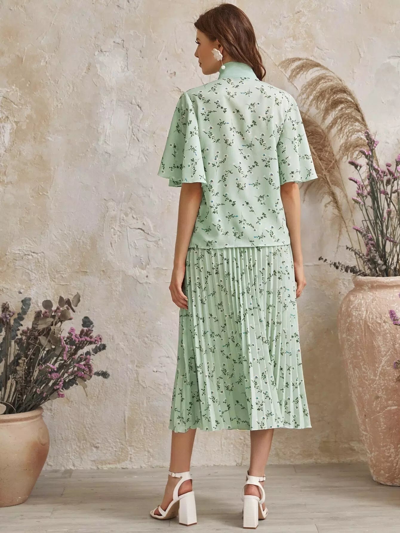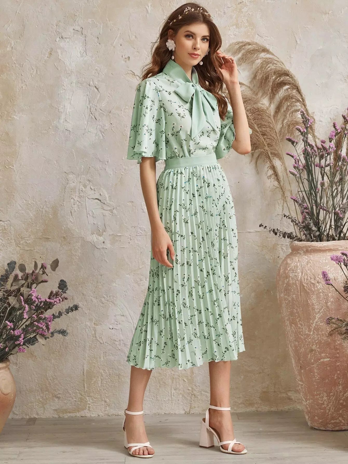 طقم بلوزة بأكمام مرفرفة بربطة عنق مزينة بالورود وتنورة بطيات