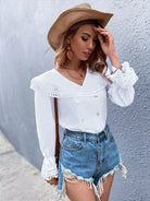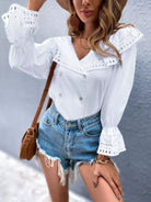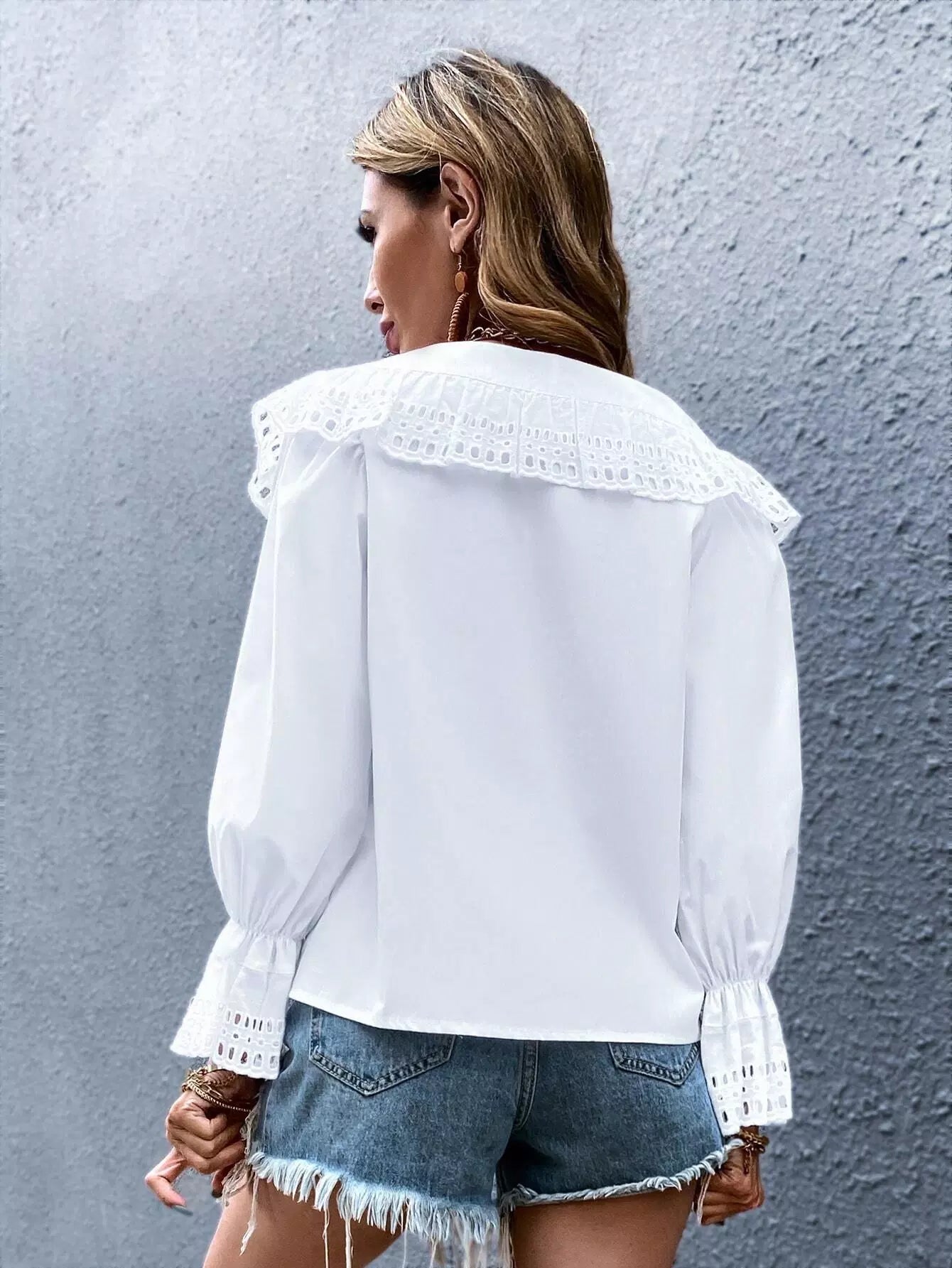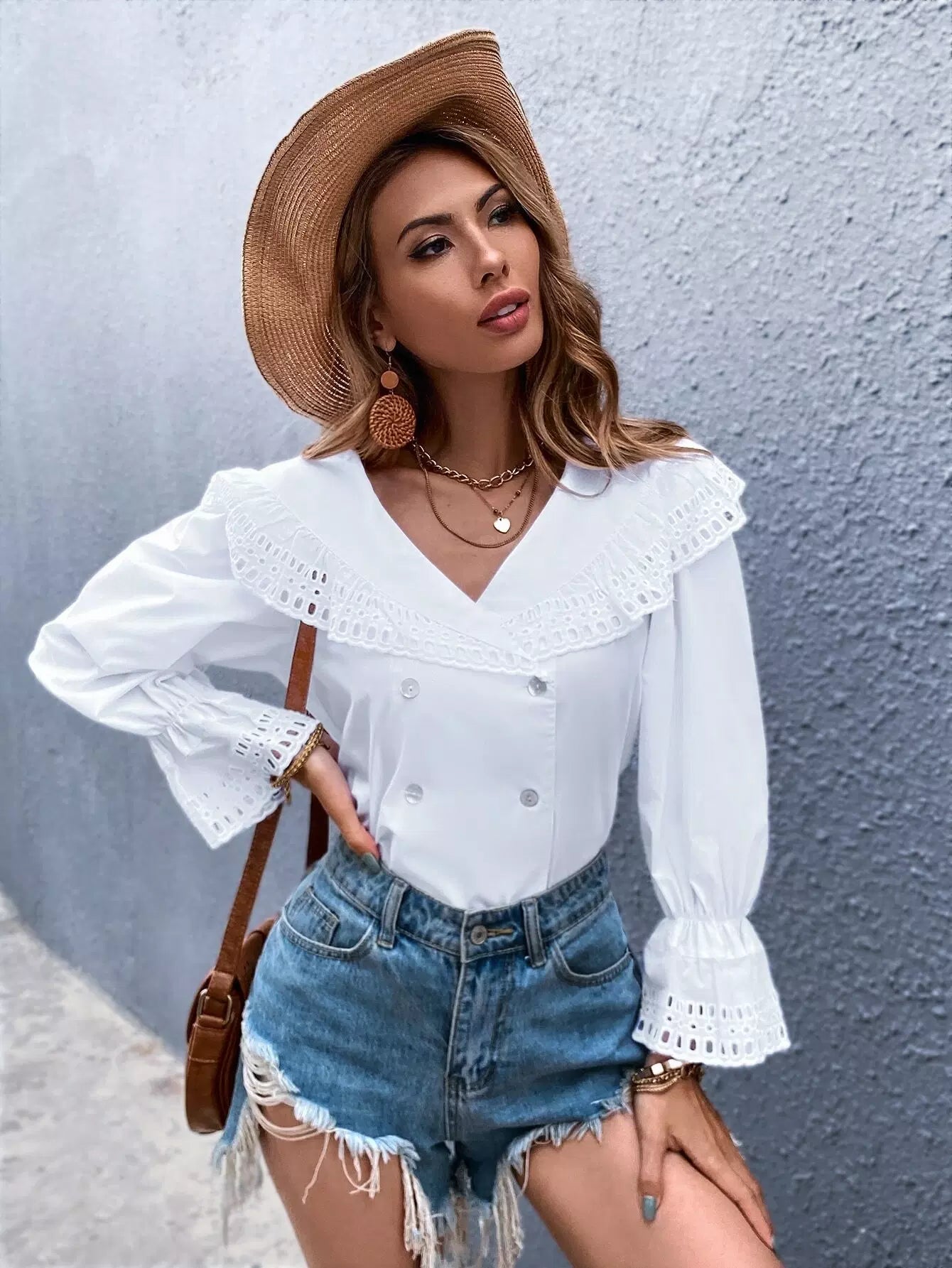 للنساء - بلوزة ذات ياقة بحارة مطرزة بفتحات وأزرار مزدوجة