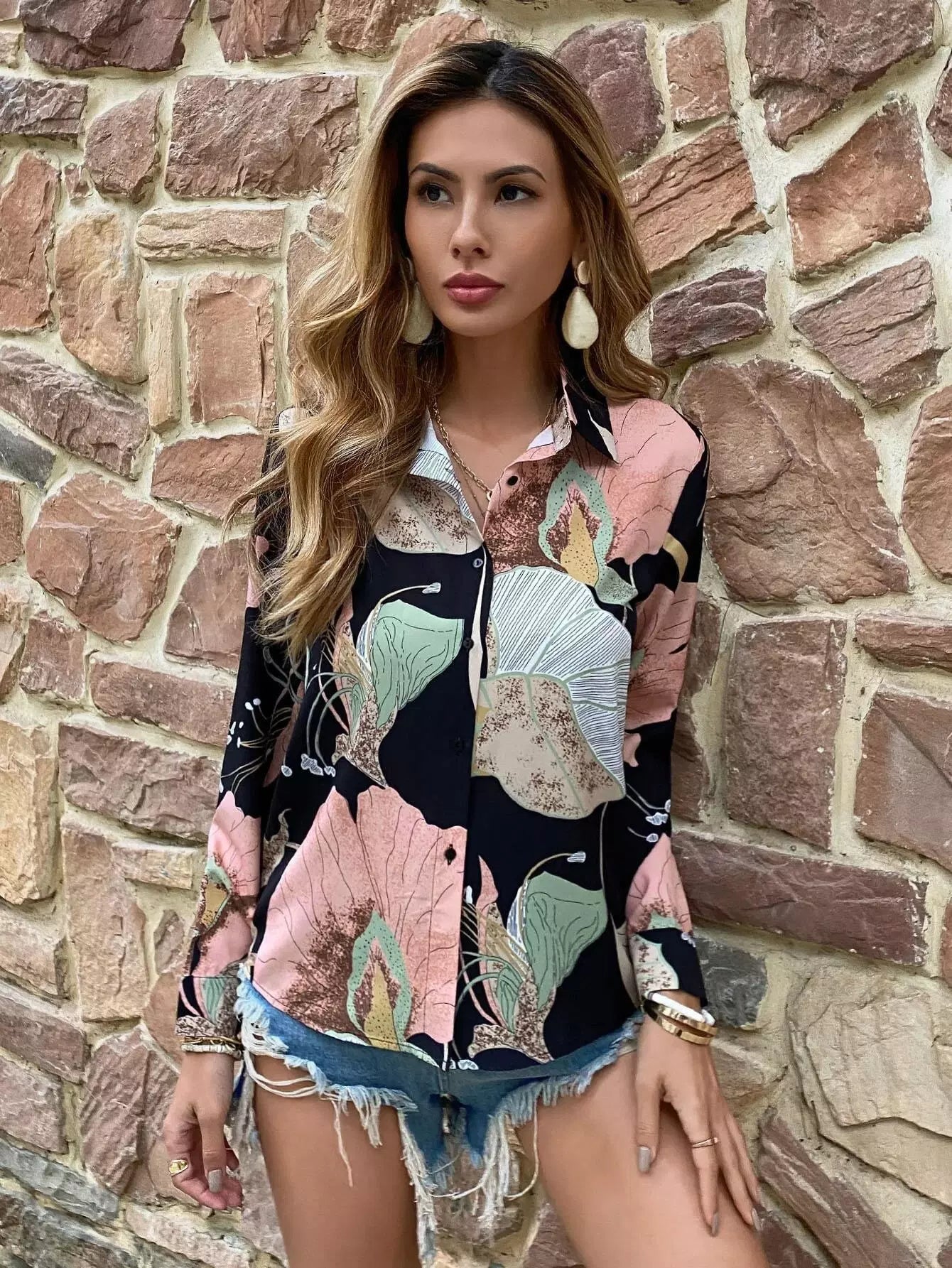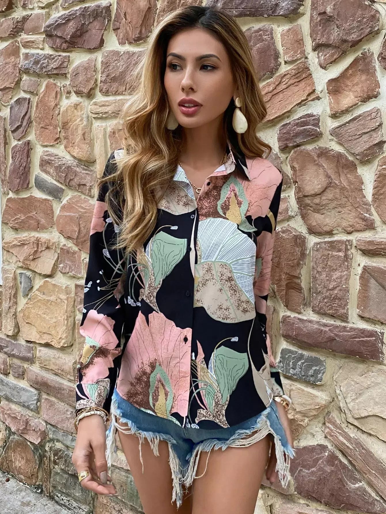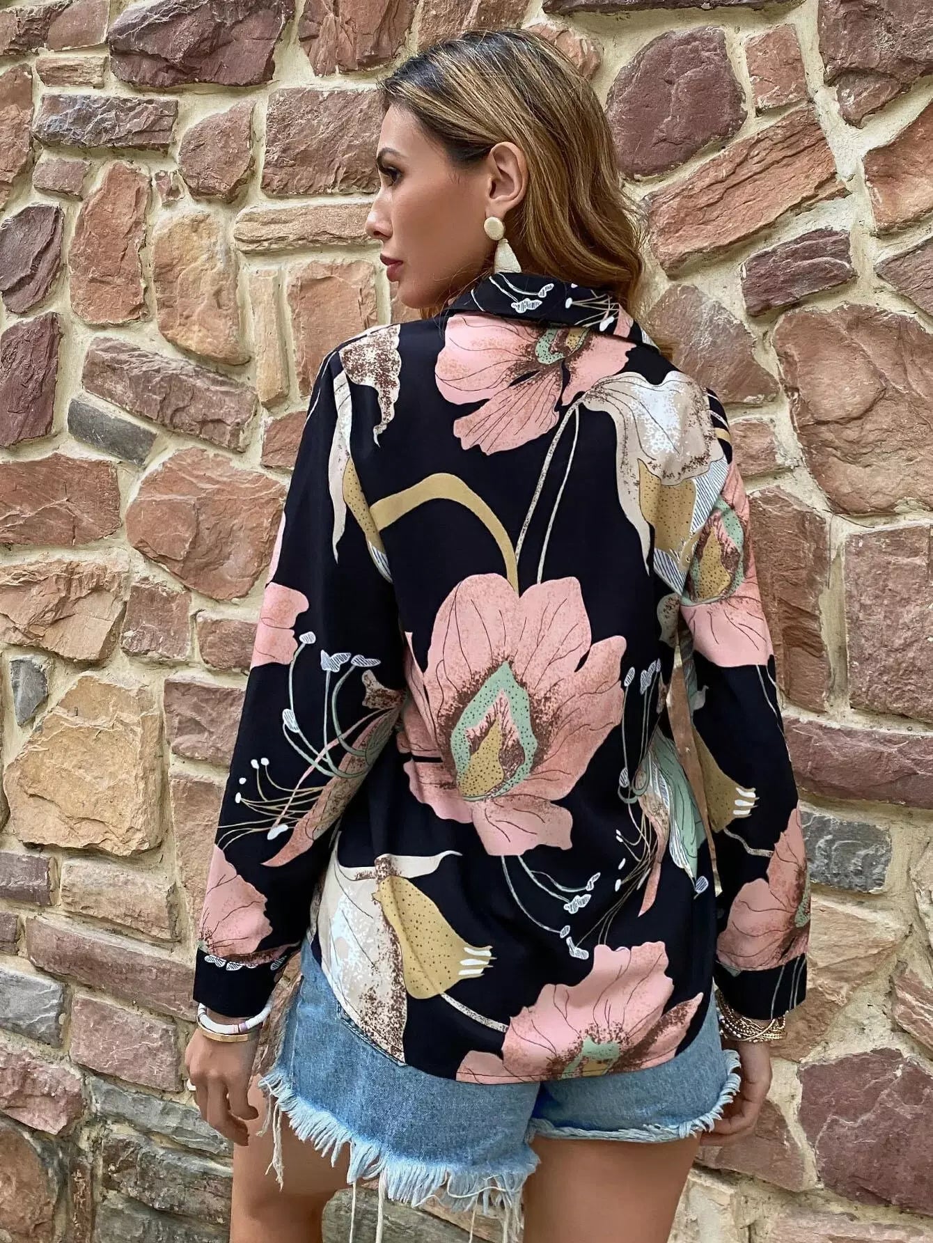 قميص بطبعة أزرار أمامية بأزرار مطبوعة بالزهور