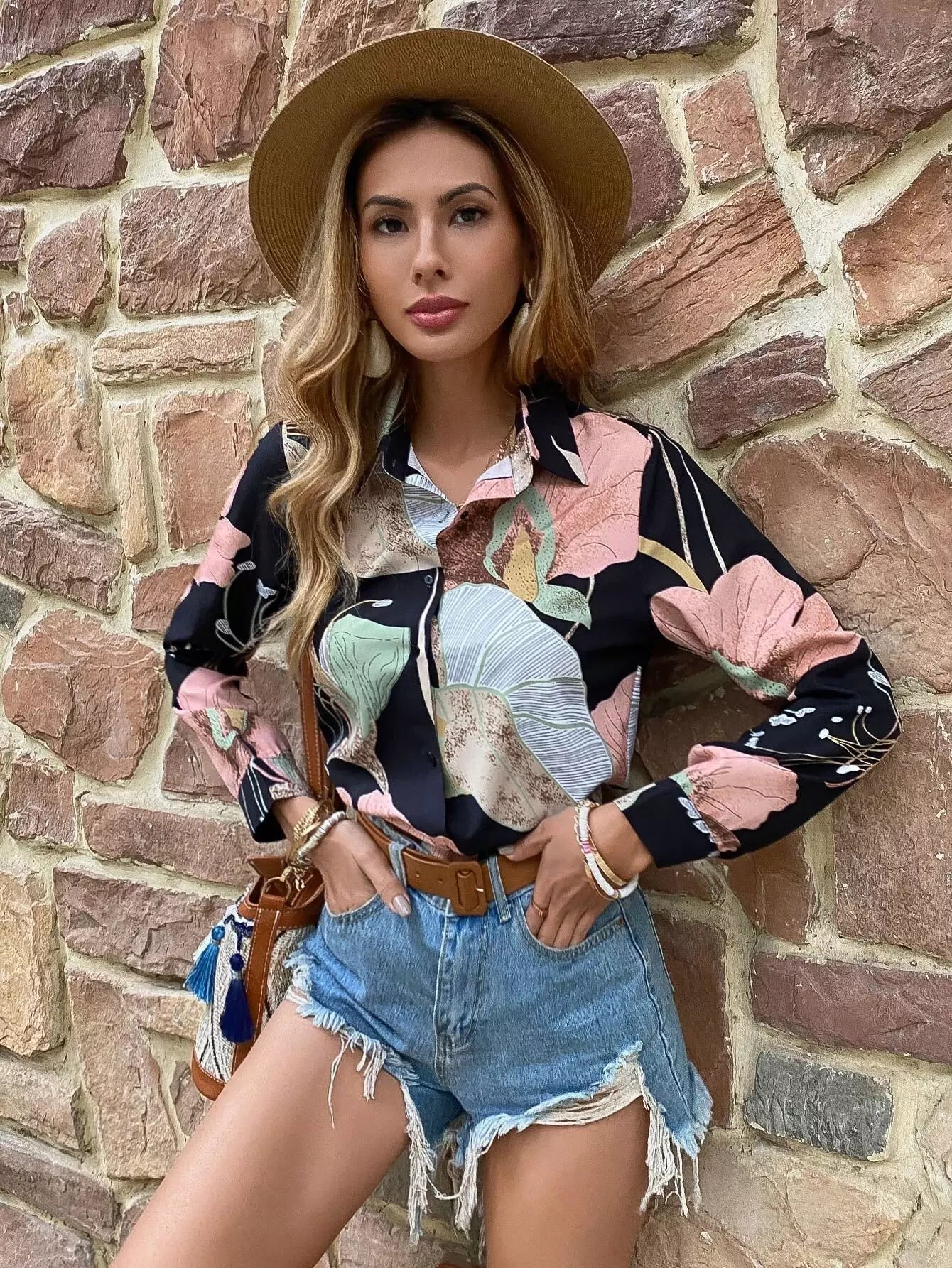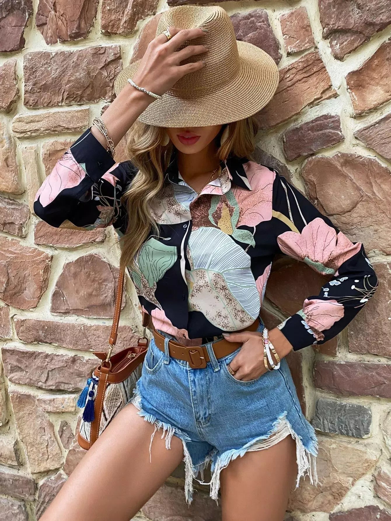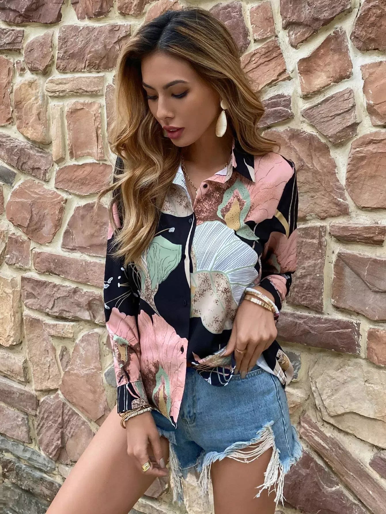 قميص بطبعة أزرار أمامية بأزرار مطبوعة بالزهور