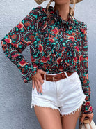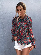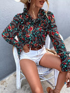 بلوزة بياقة زهرية مكشكشة برقبة مكشكشة بأزرار فوق الزهور