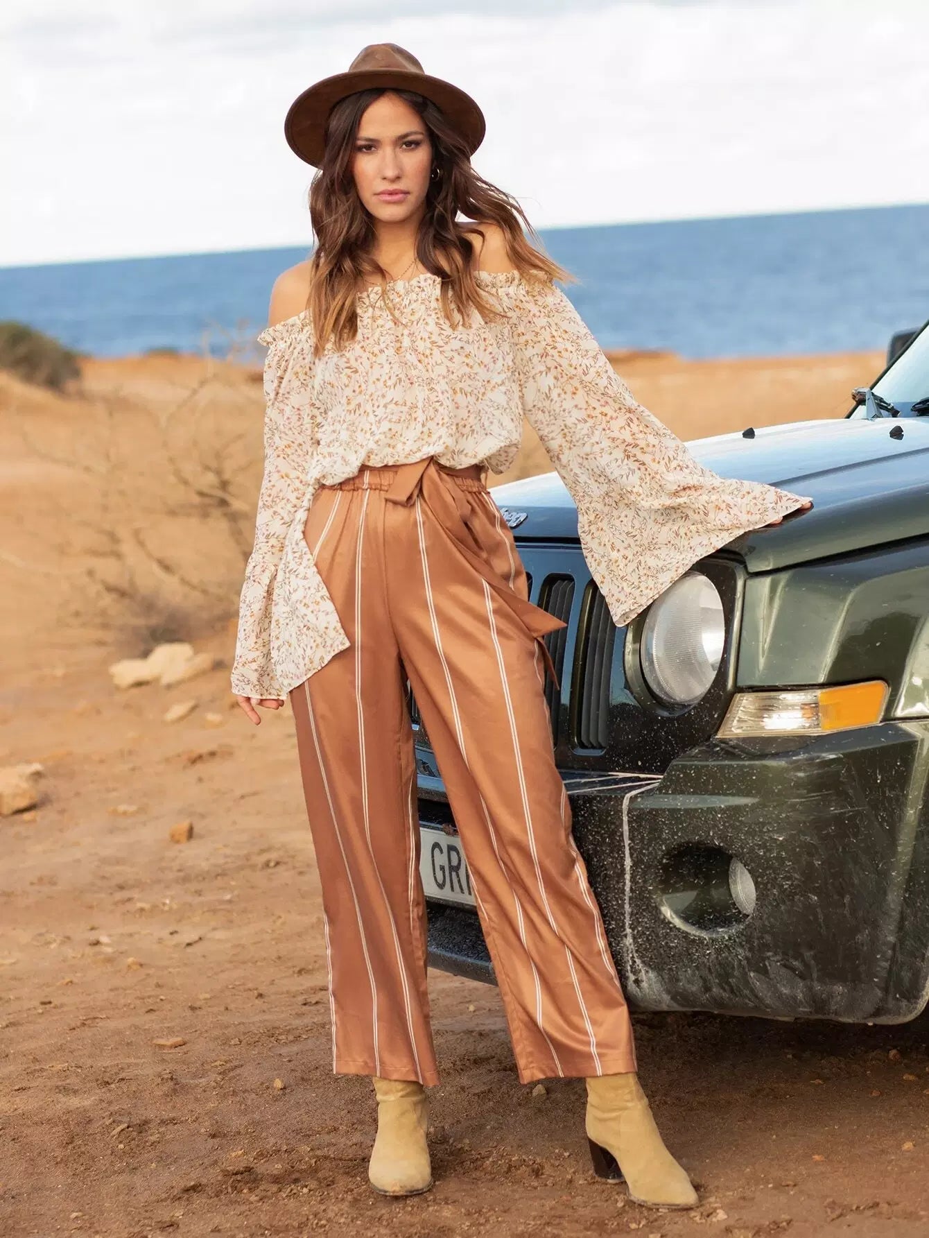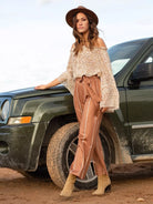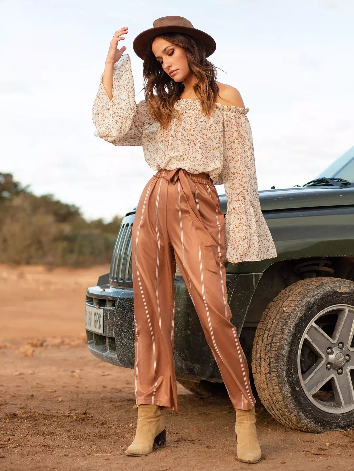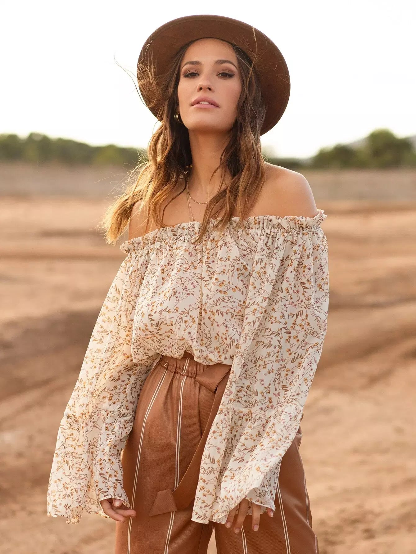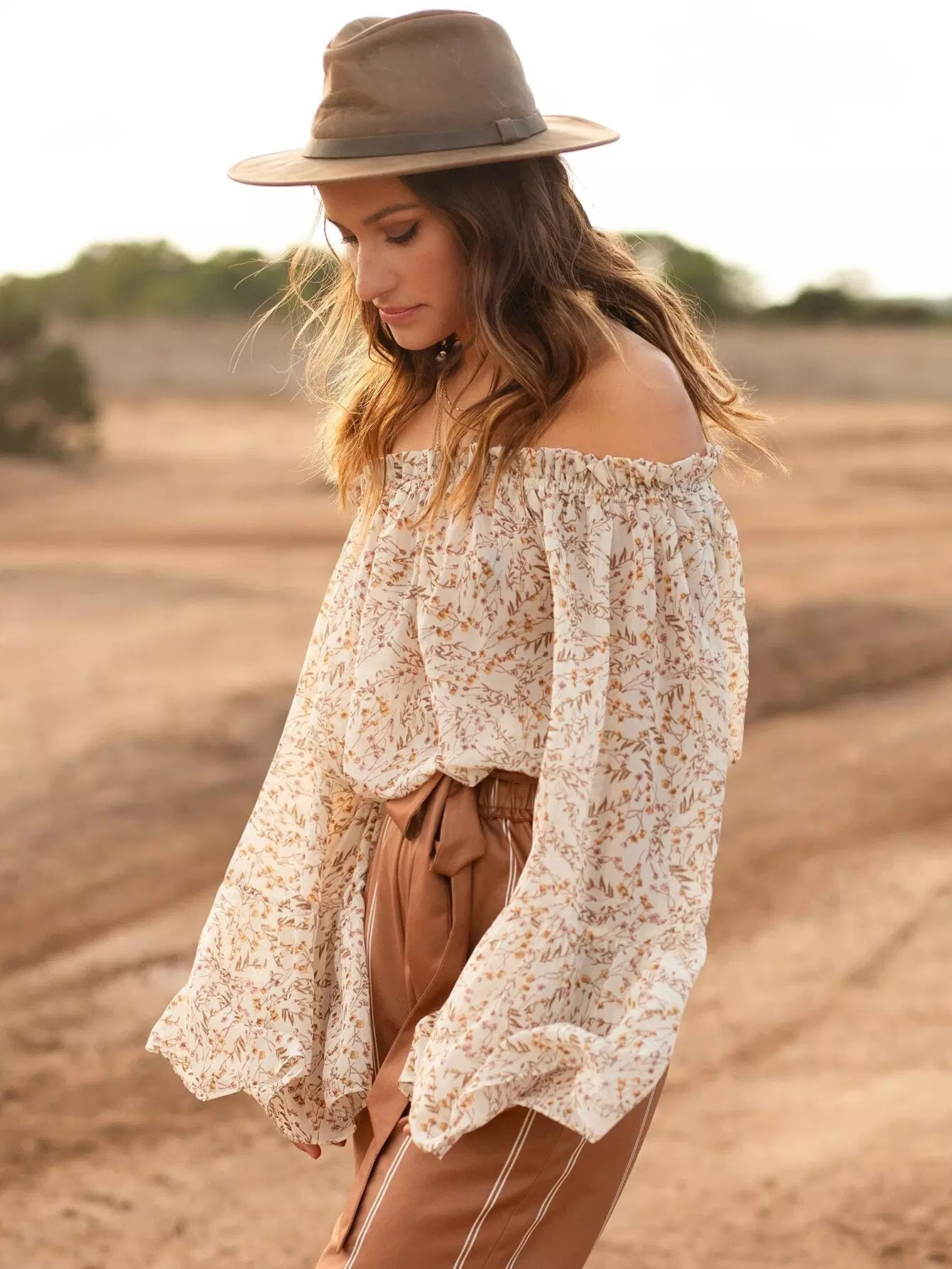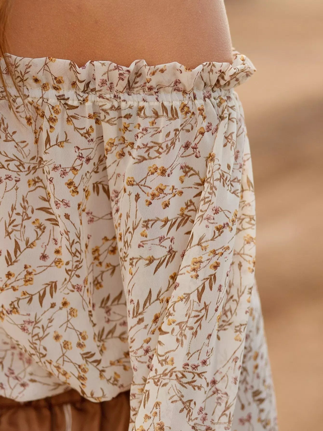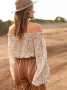 بلوزة مكشكشة مكشوفة الأكتاف مزينة بالورود