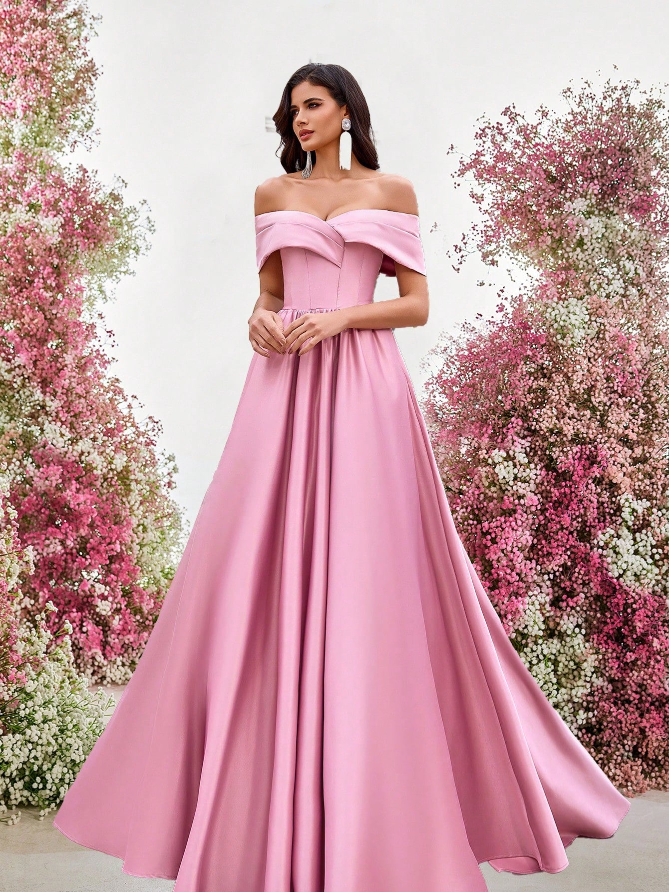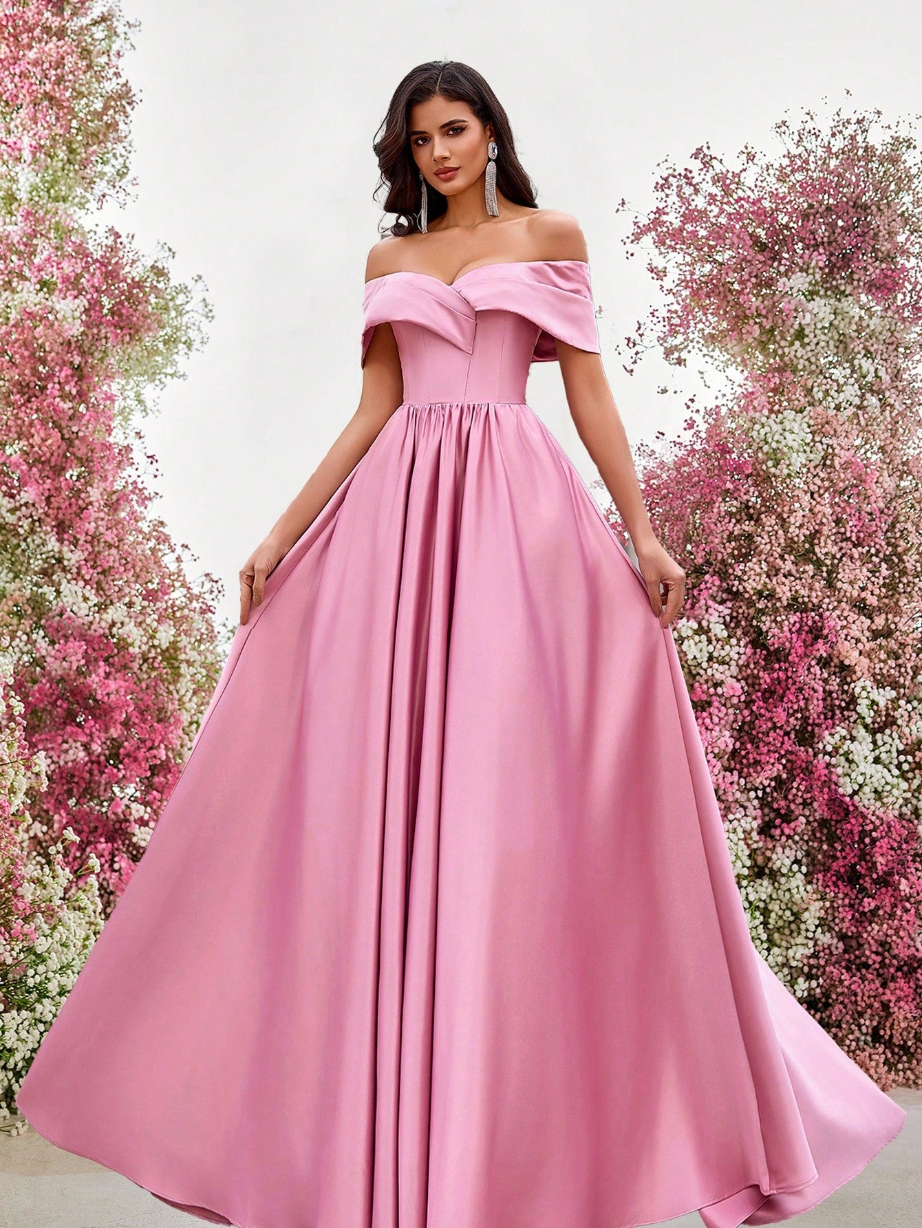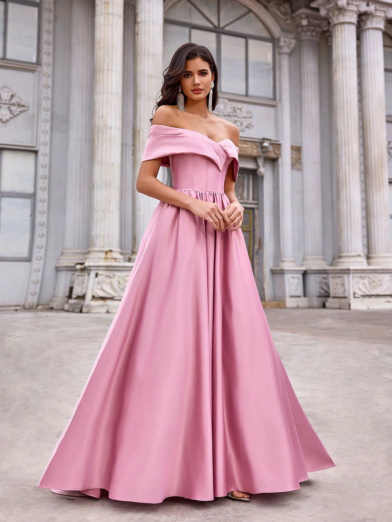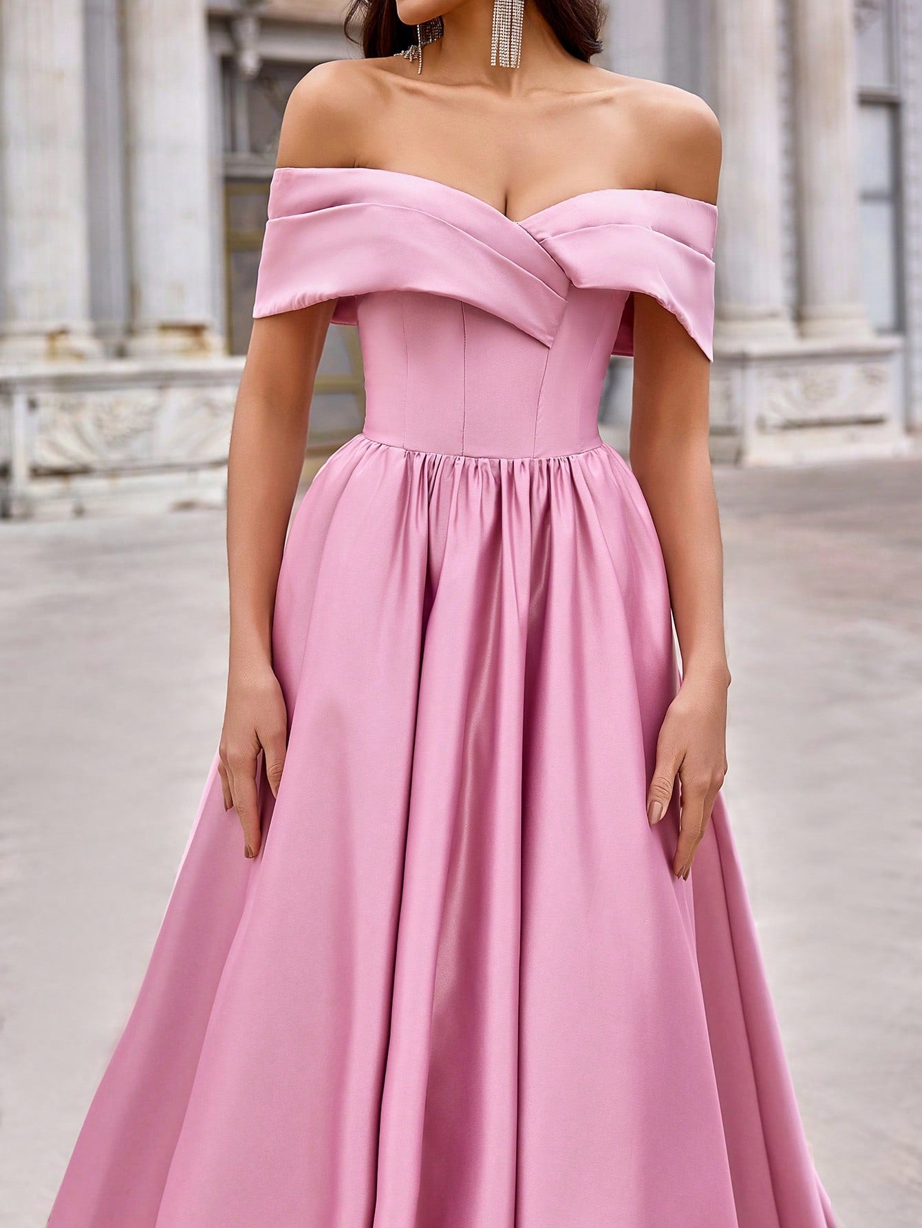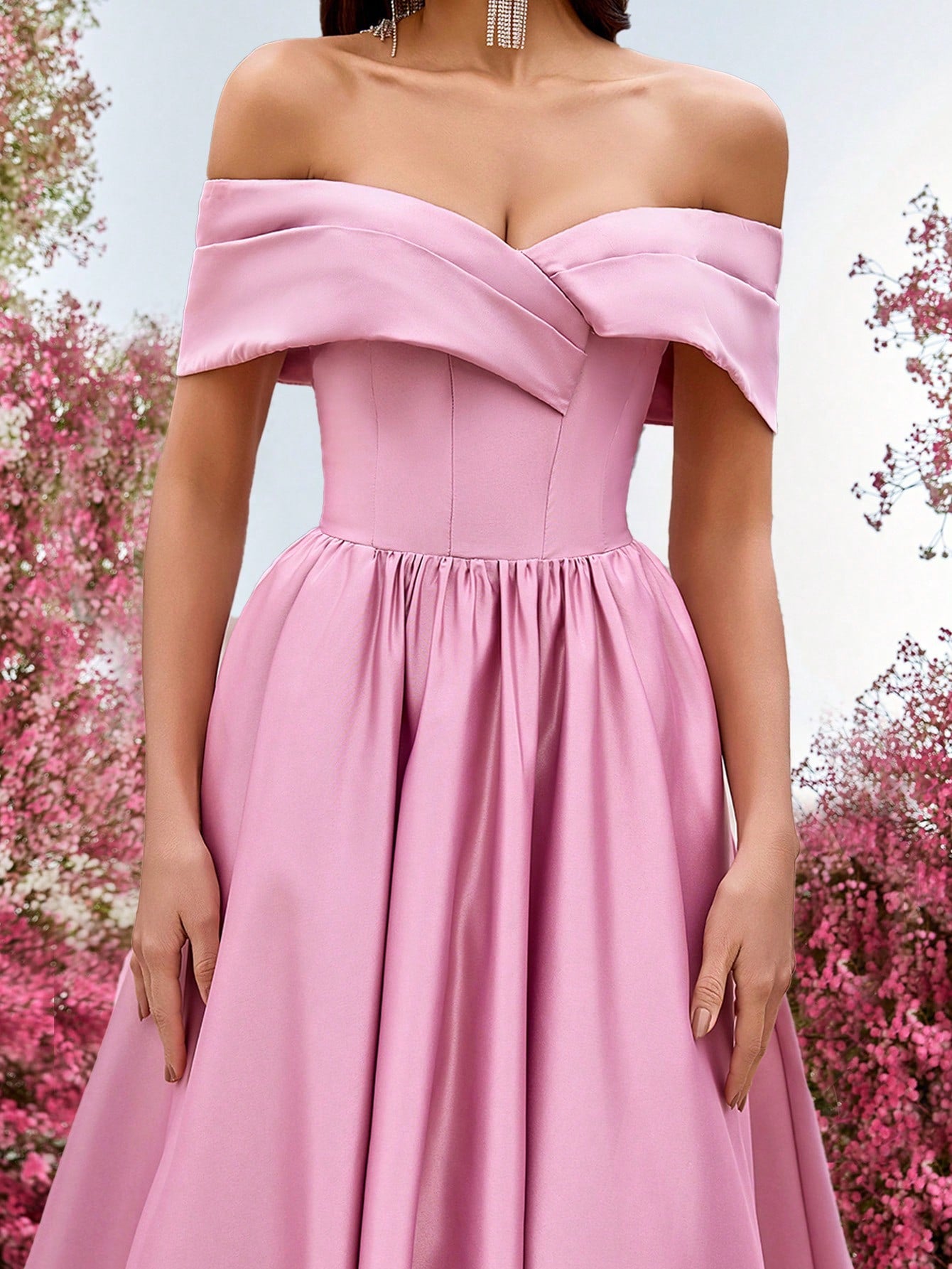 Glamrae Elegant, , Dignified, Fashionable, Pink, Satin, Off Shoulder, Waist, Low Waist A-Line Dress,