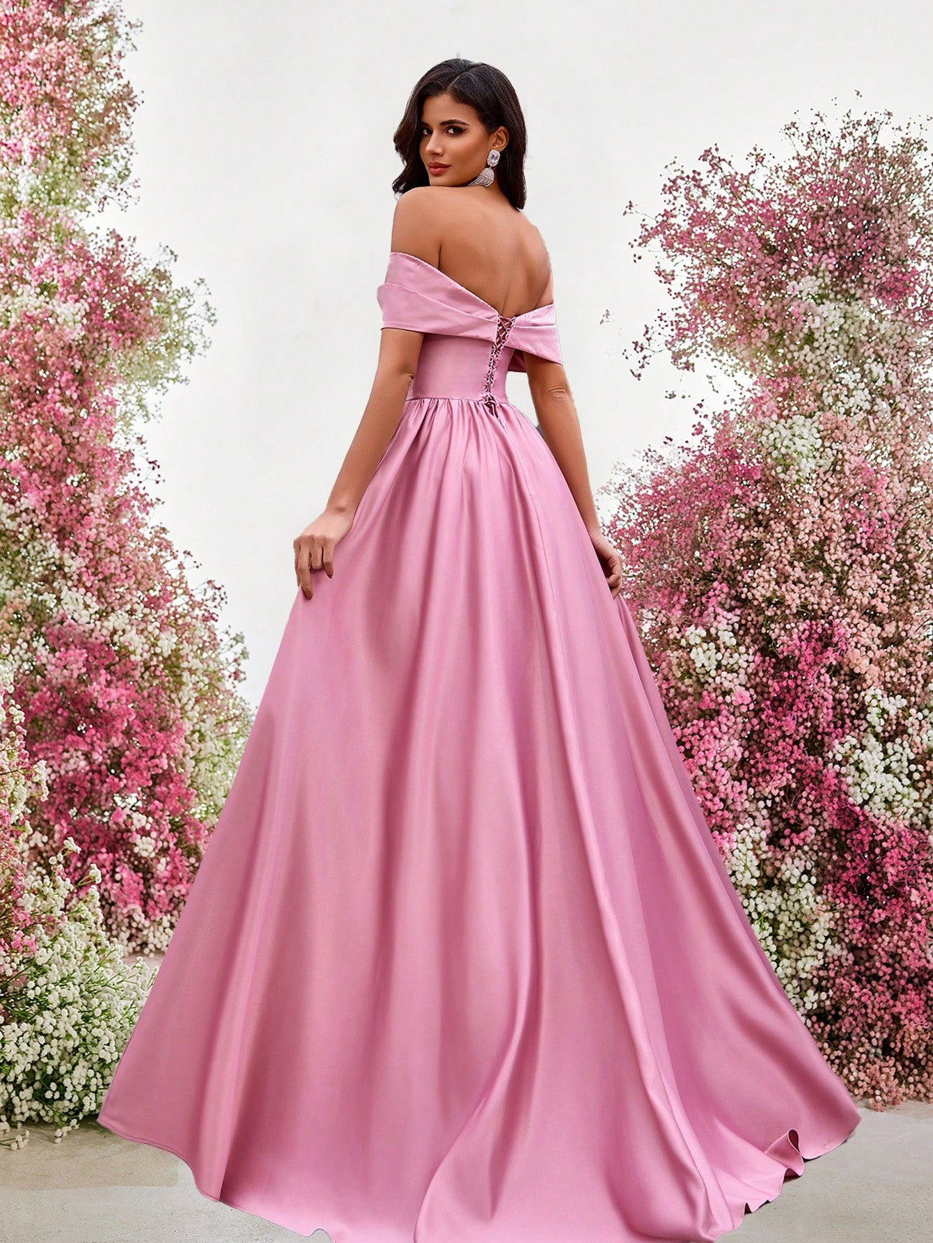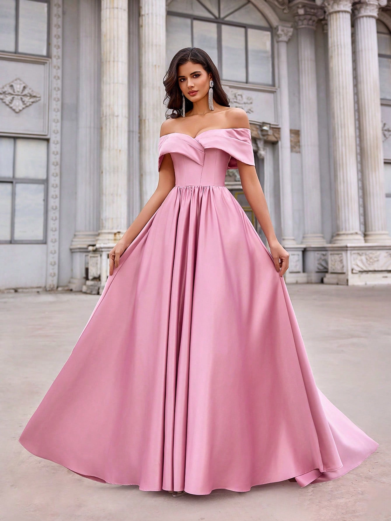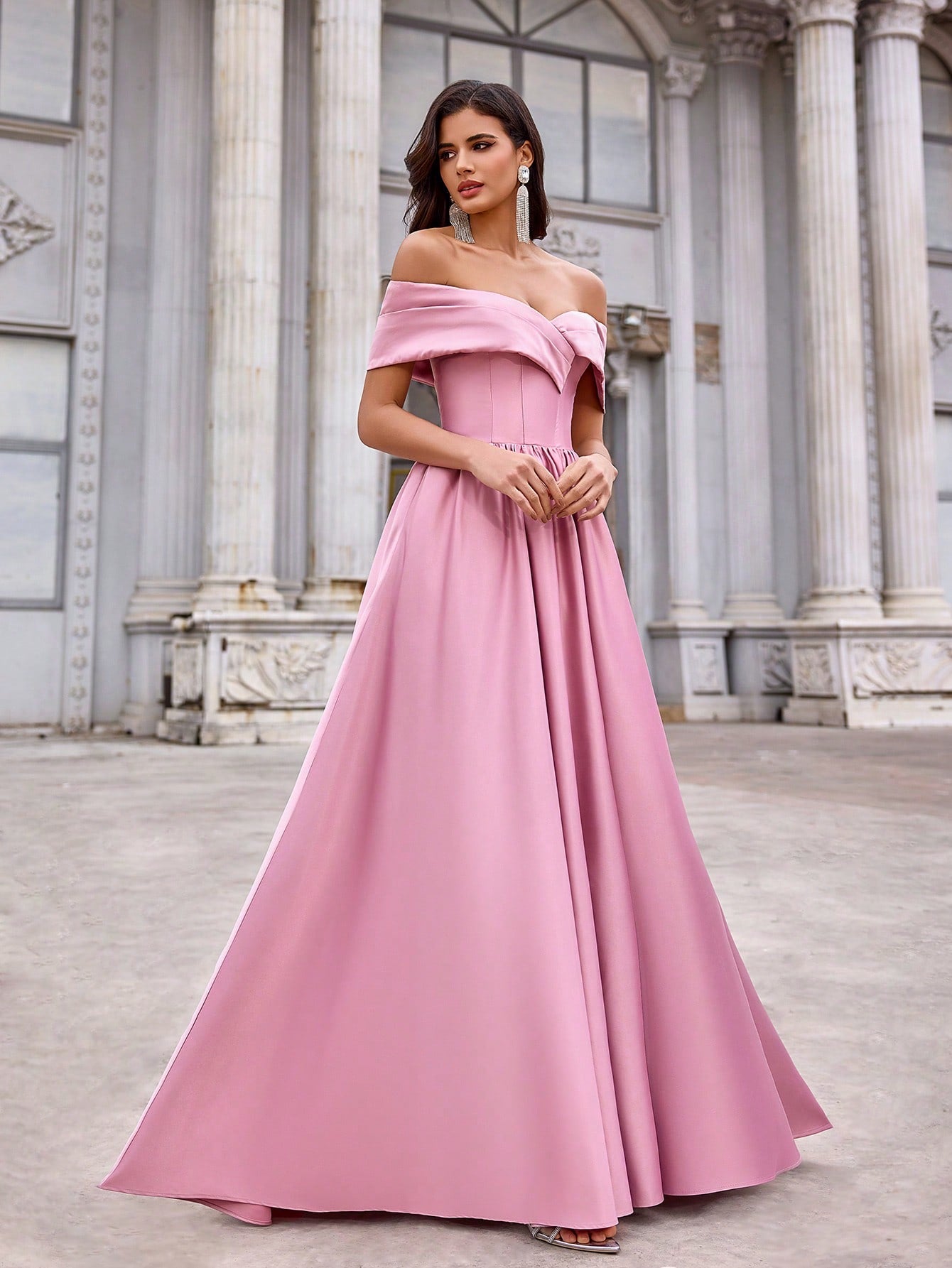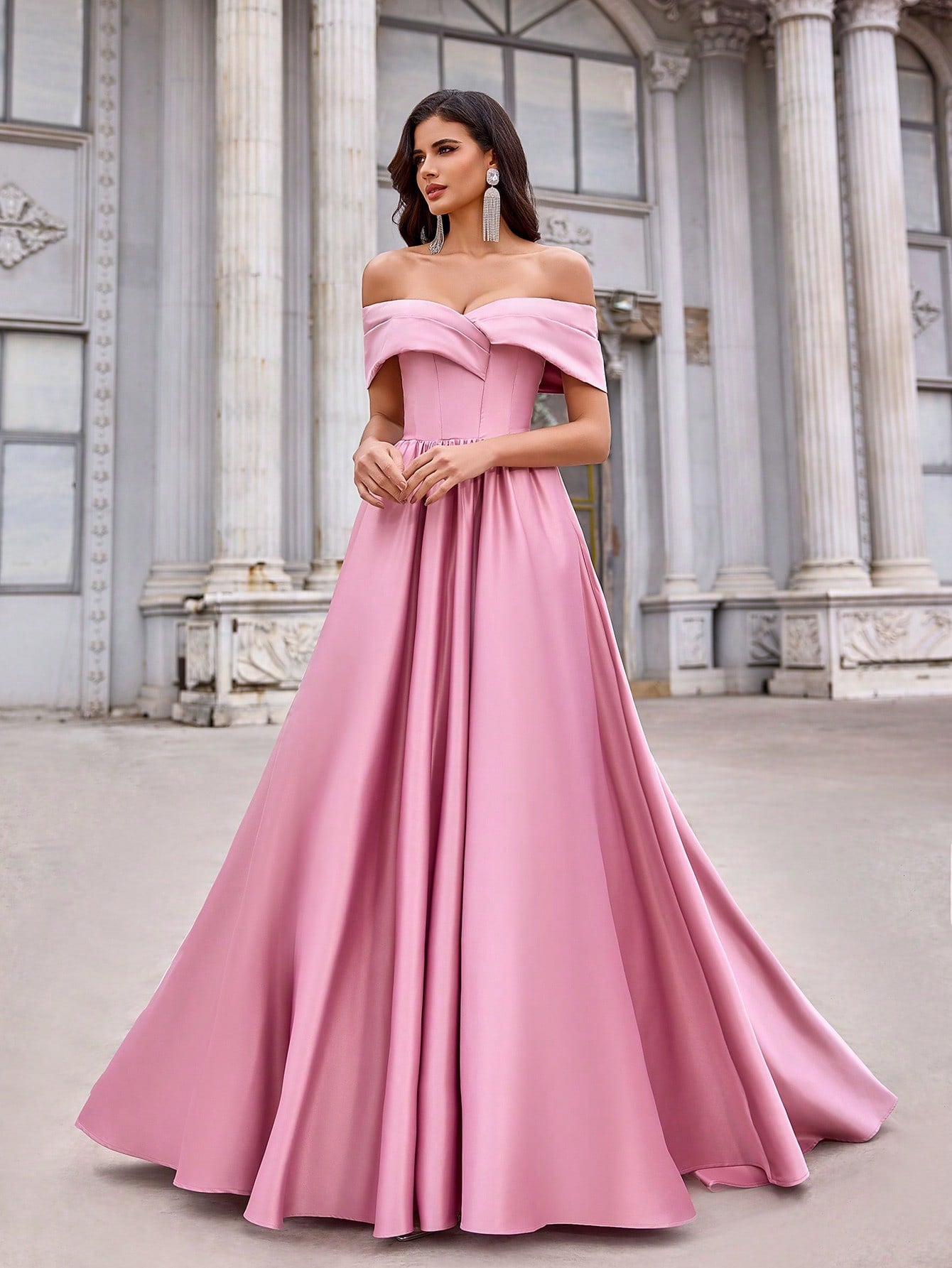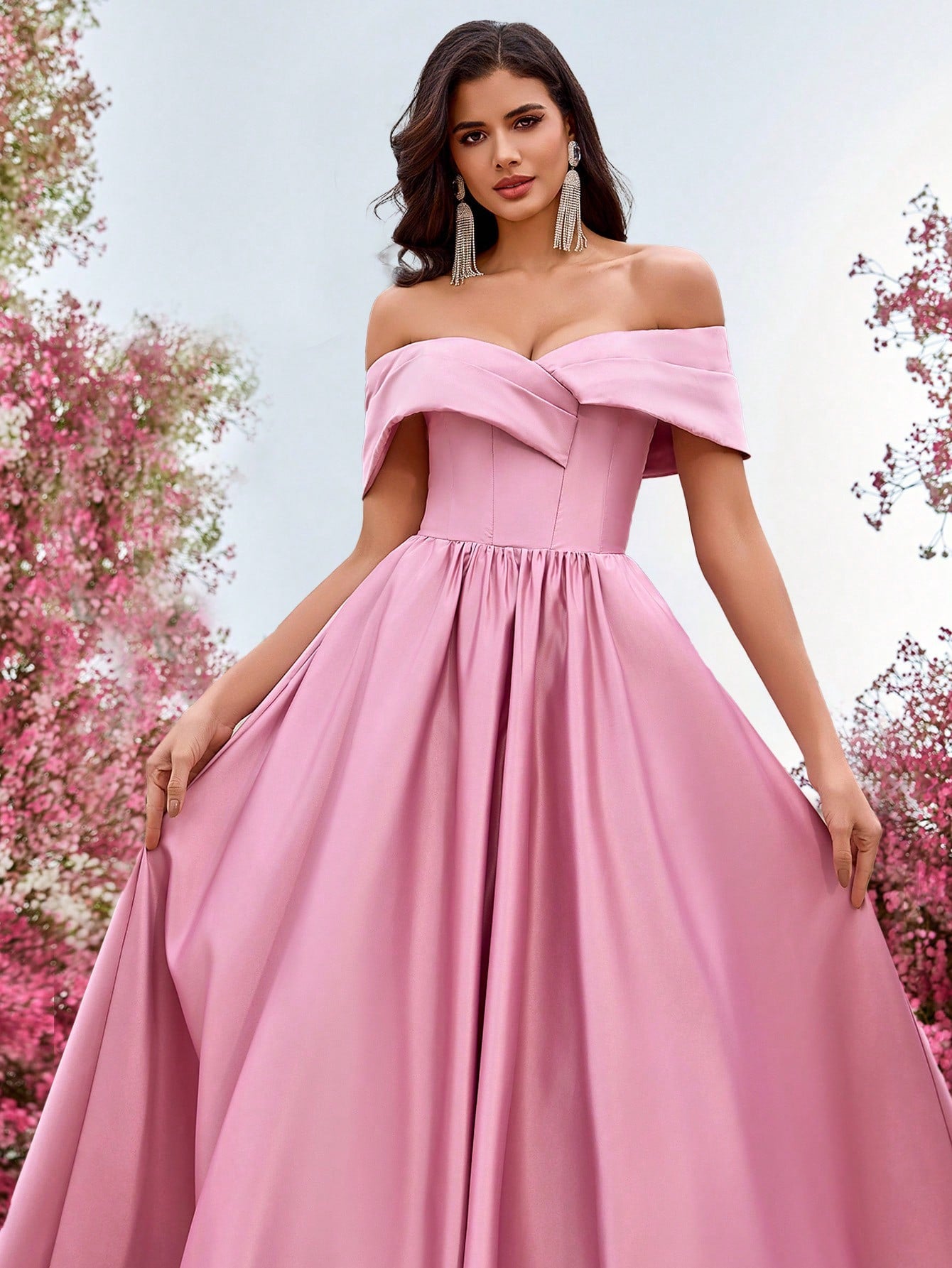 Glamrae Elegant, , Dignified, Fashionable, Pink, Satin, Off Shoulder, Waist, Low Waist A-Line Dress,