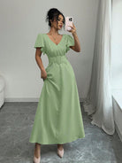 Gloray Gold V-Neck Ruffle Trim Tie Waist Pockets Casual Dress For Women