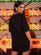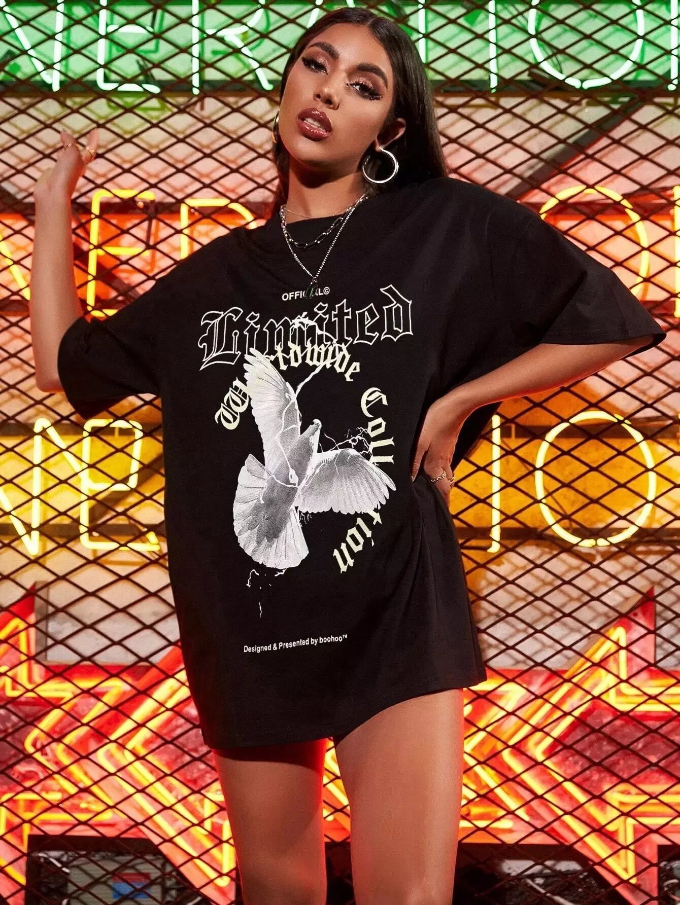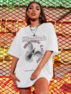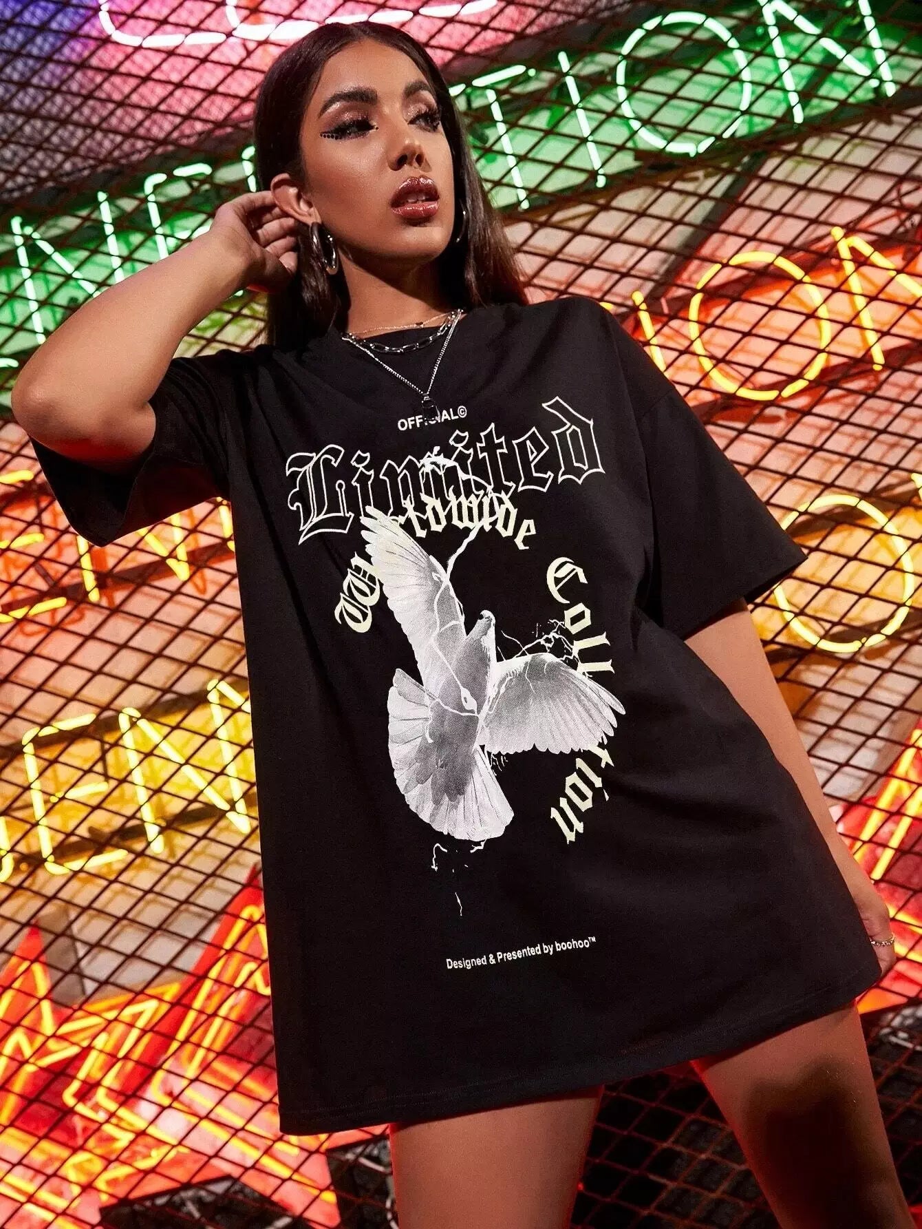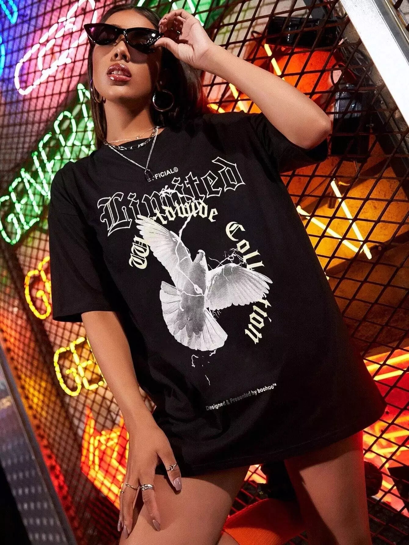 للنساء - تي شيرت كبير الحجم بكتف منسدل وطباعة حروف وحيوانات