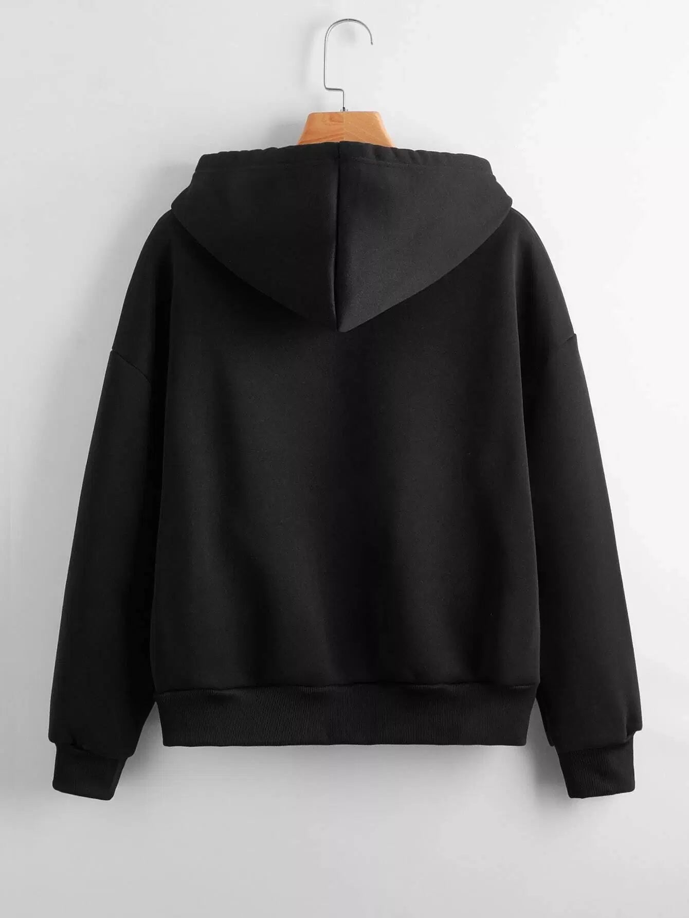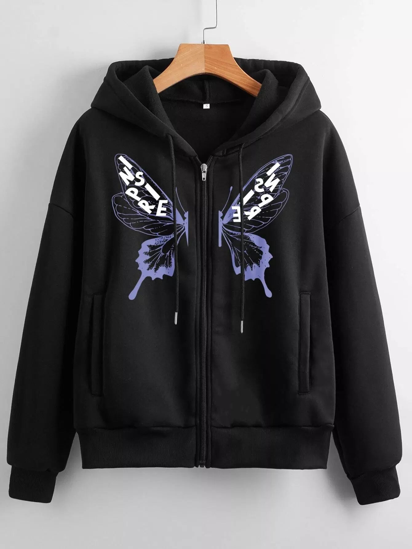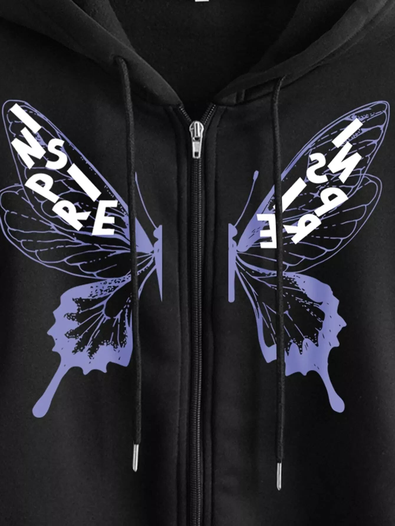هودي حراري مطبوع عليه حروف وفراشة مطبوع عليه حروف وفراشة بأربطة منسدلة على الكتف بسحاب