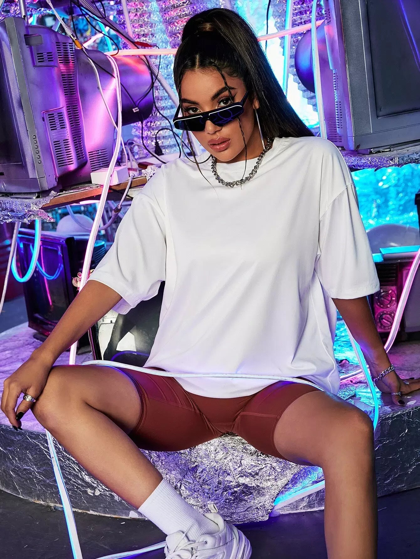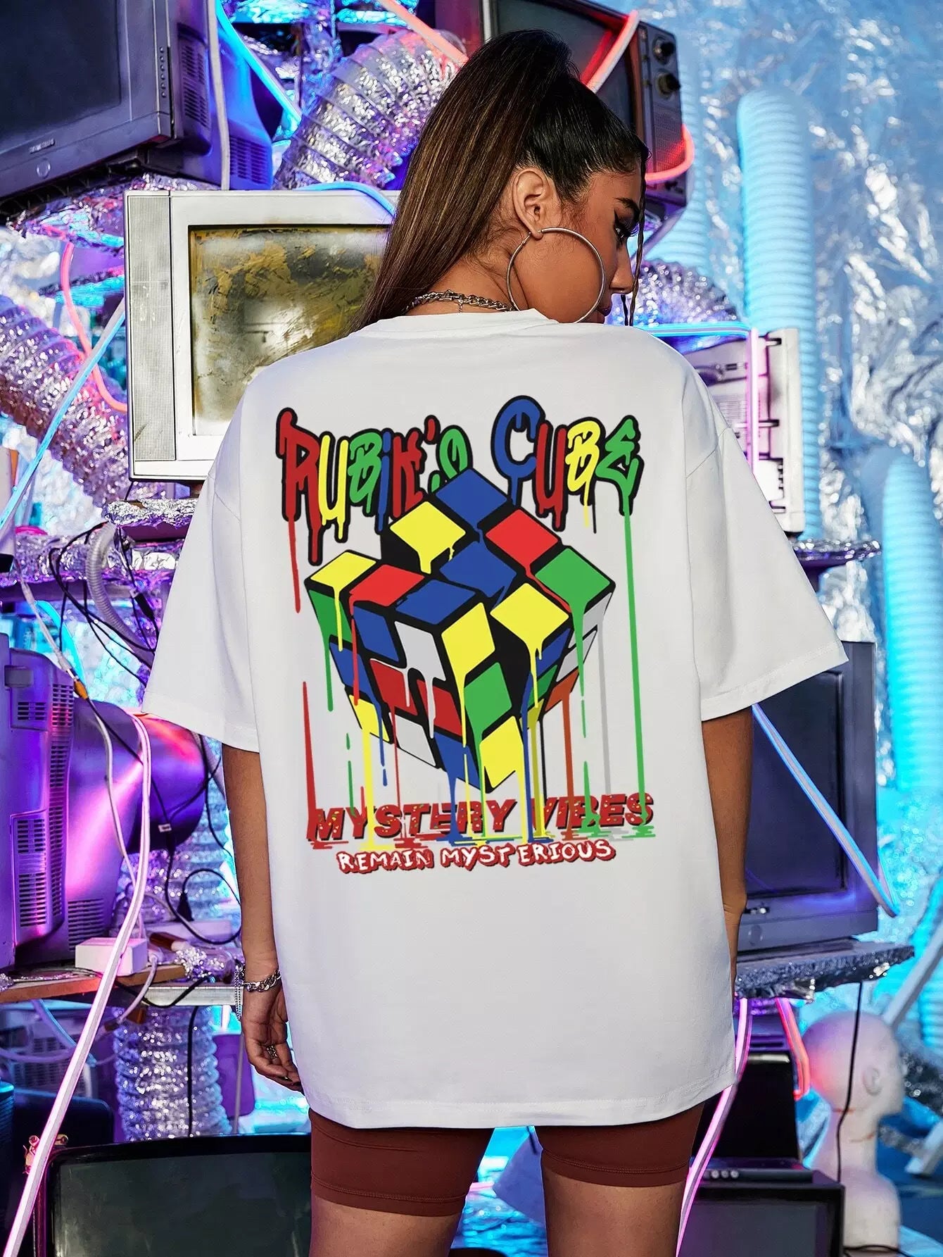 تي شيرت بكتف منسدل برسومات مكعب سحري وأحرف