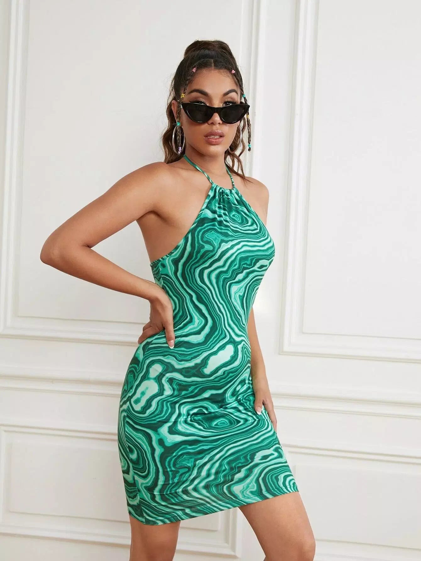 فستان رخامي مطبوع بطبعة رخامية برقبة رقبة رخامية