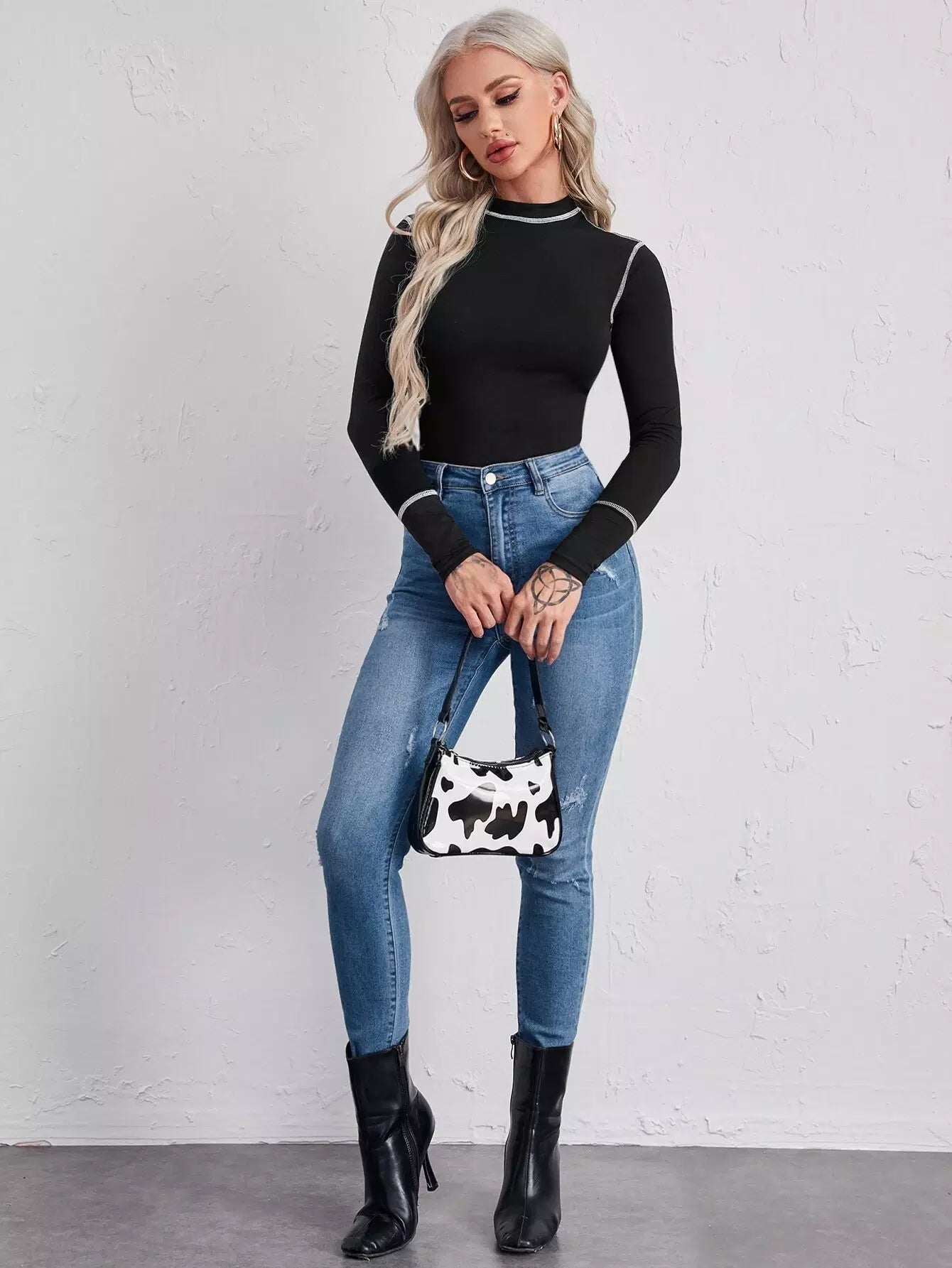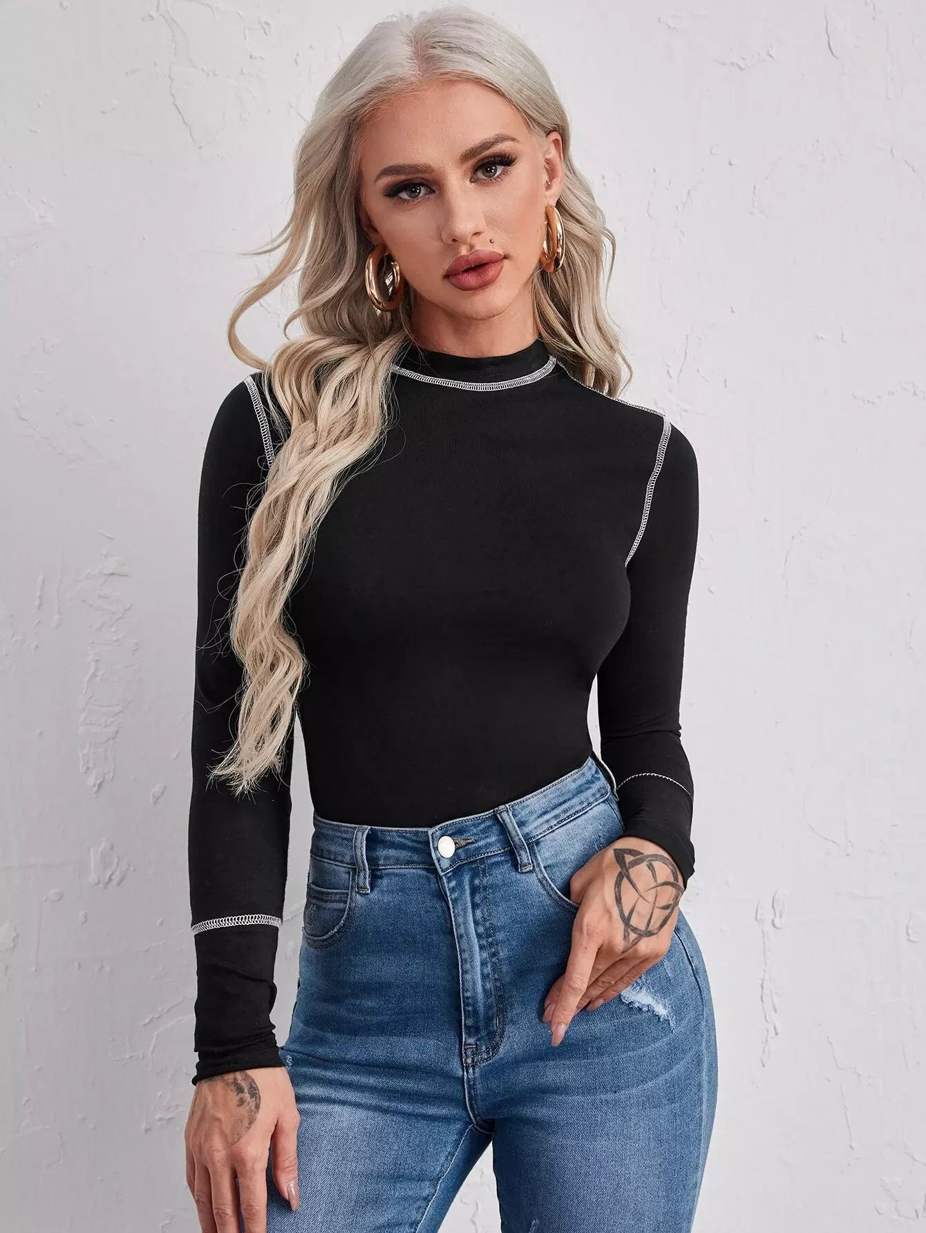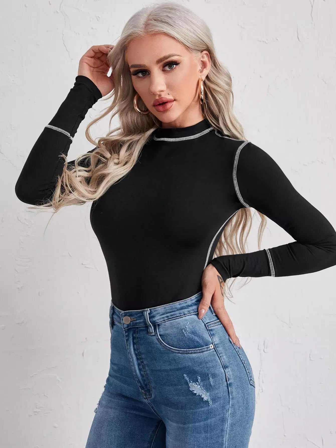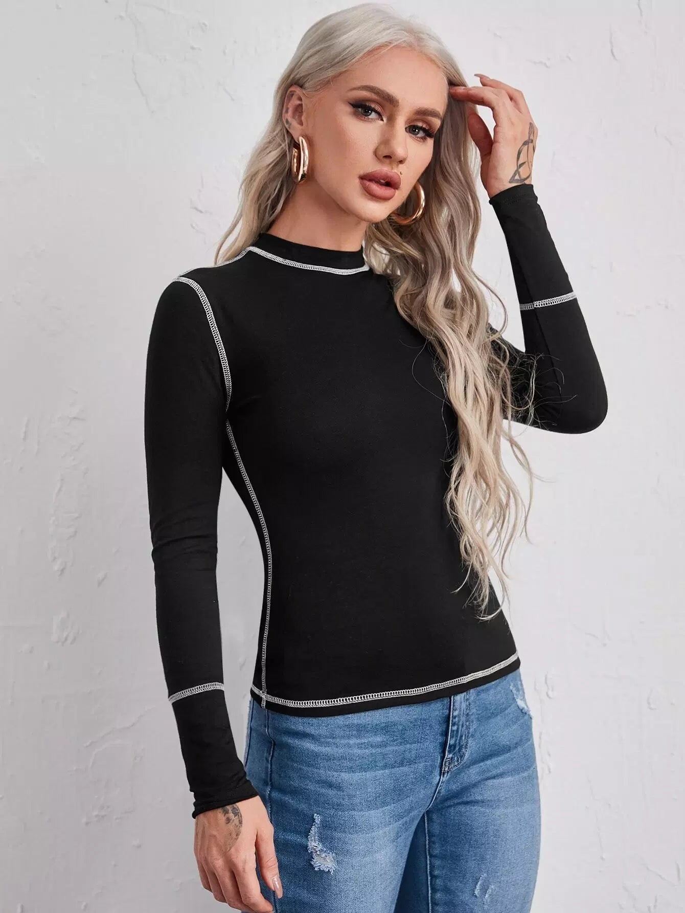 للنساء - تي شيرت برقبة وهمية وتفاصيل غرز متباينة