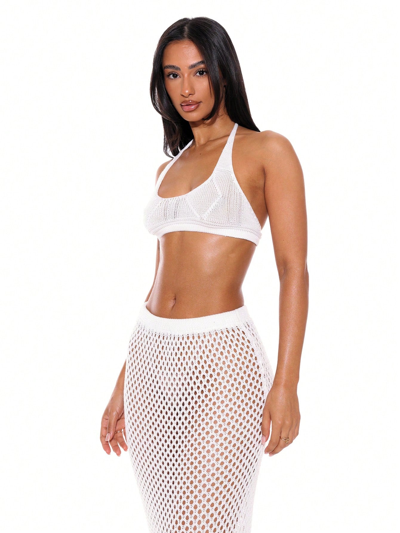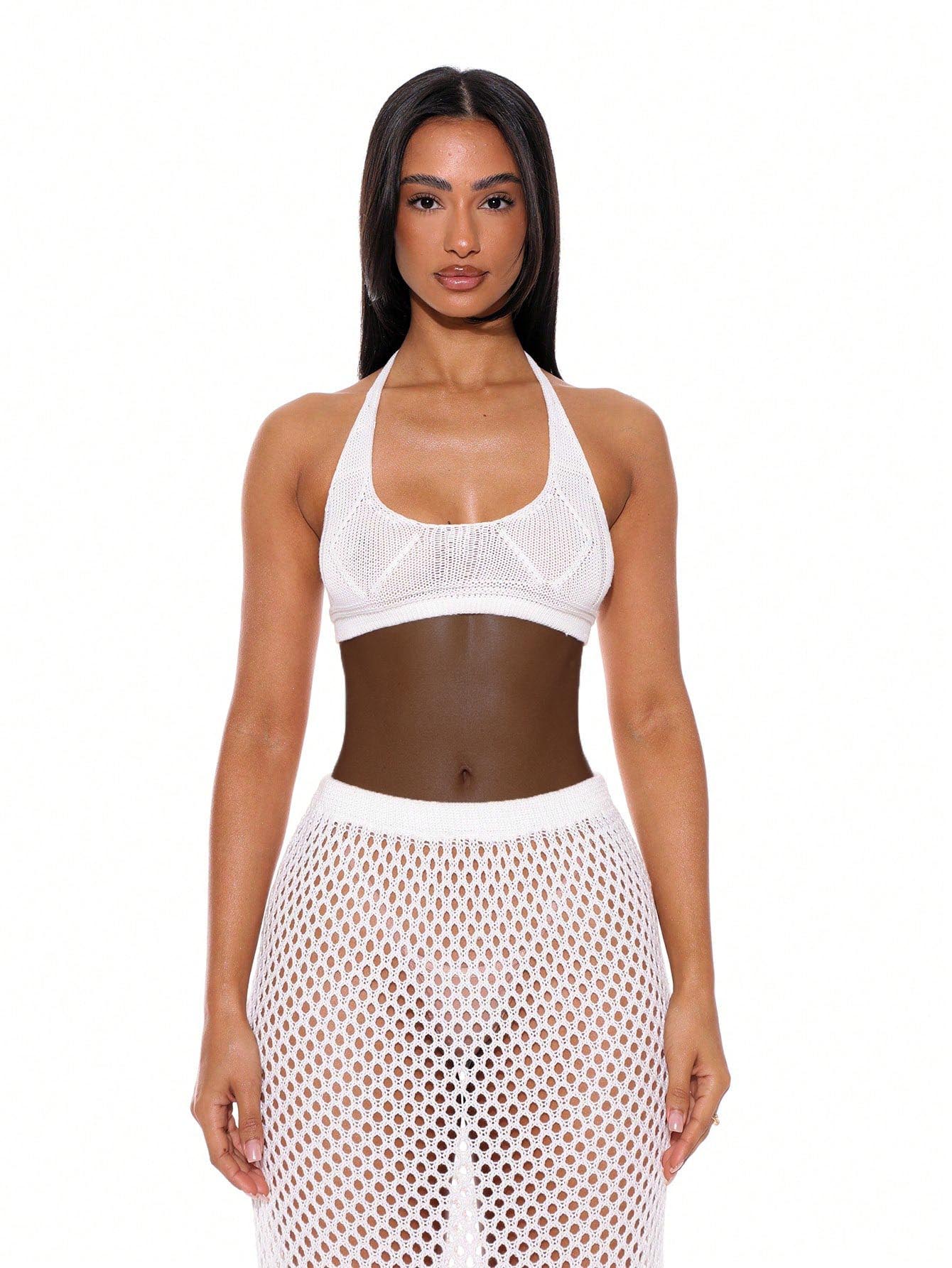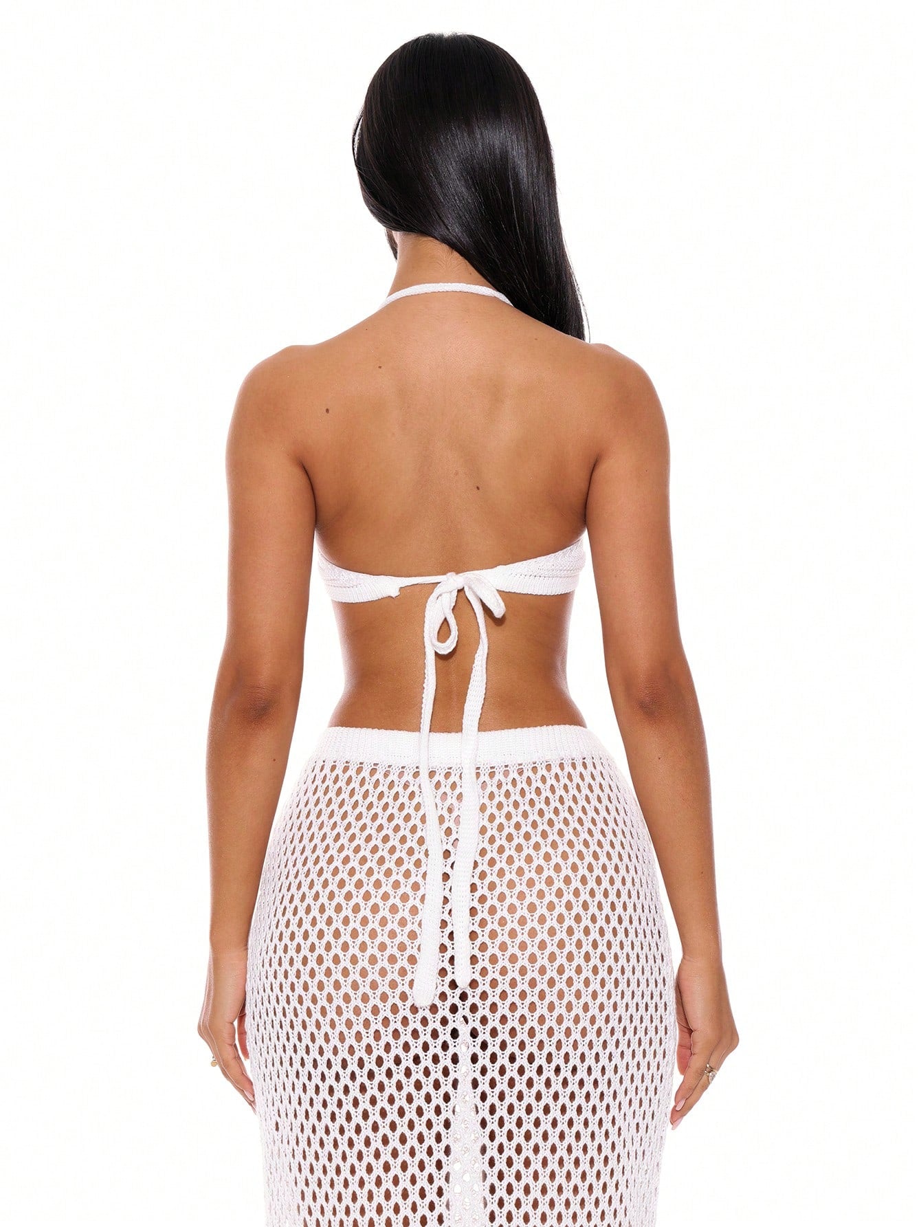 قميص قصير مثير للغاية من Musera Resort بفتحة رقبة على شكل هالتر ونمط أمامي منخفض بدون أكمام محبوك بالكروشيه