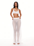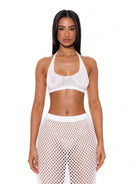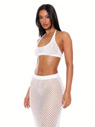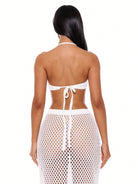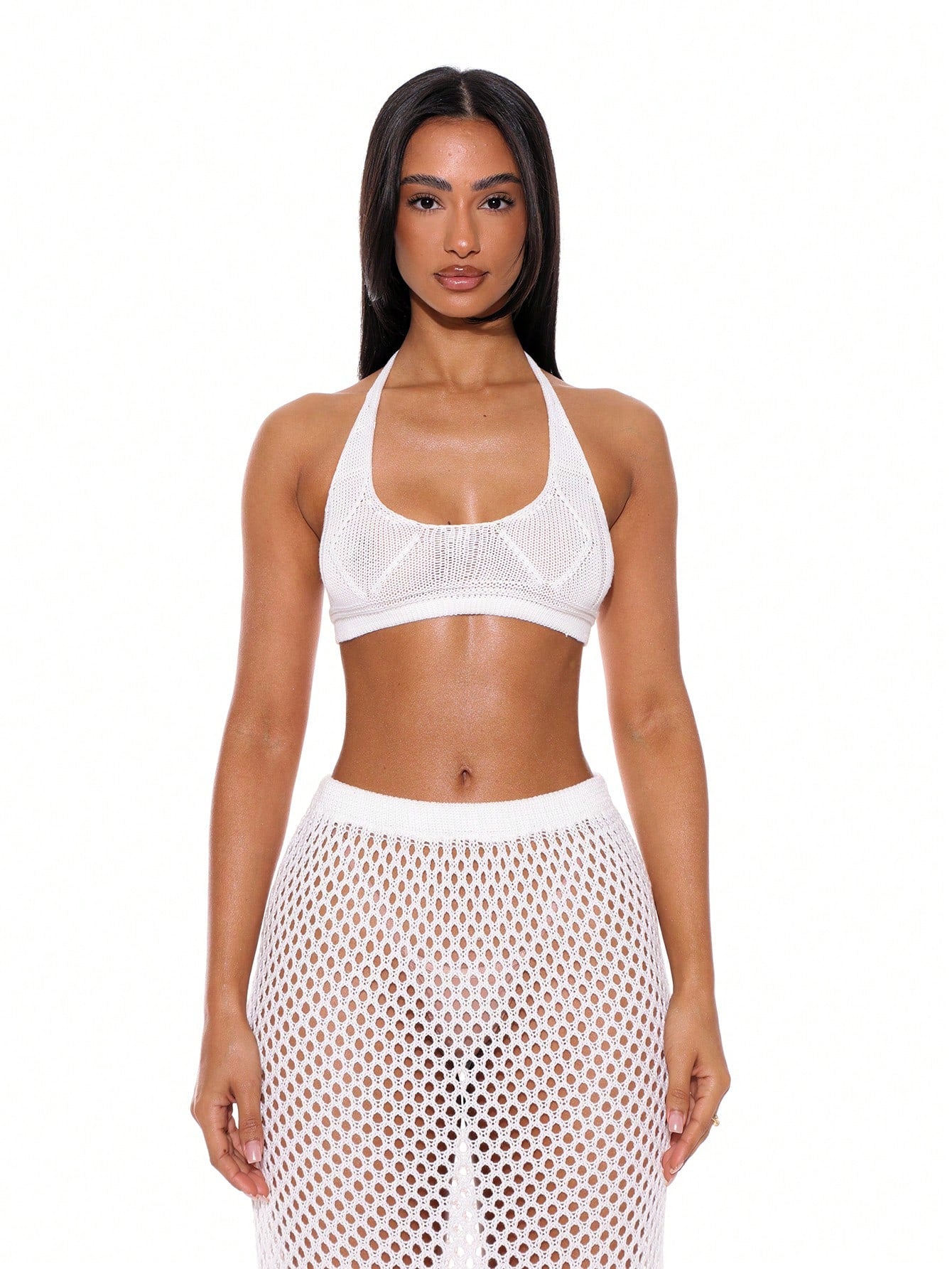 Musera Resort Halter Neck Low Scoop Front Pattern Crochet Knit Sleeveless Extreme Sexy Club Crop Top