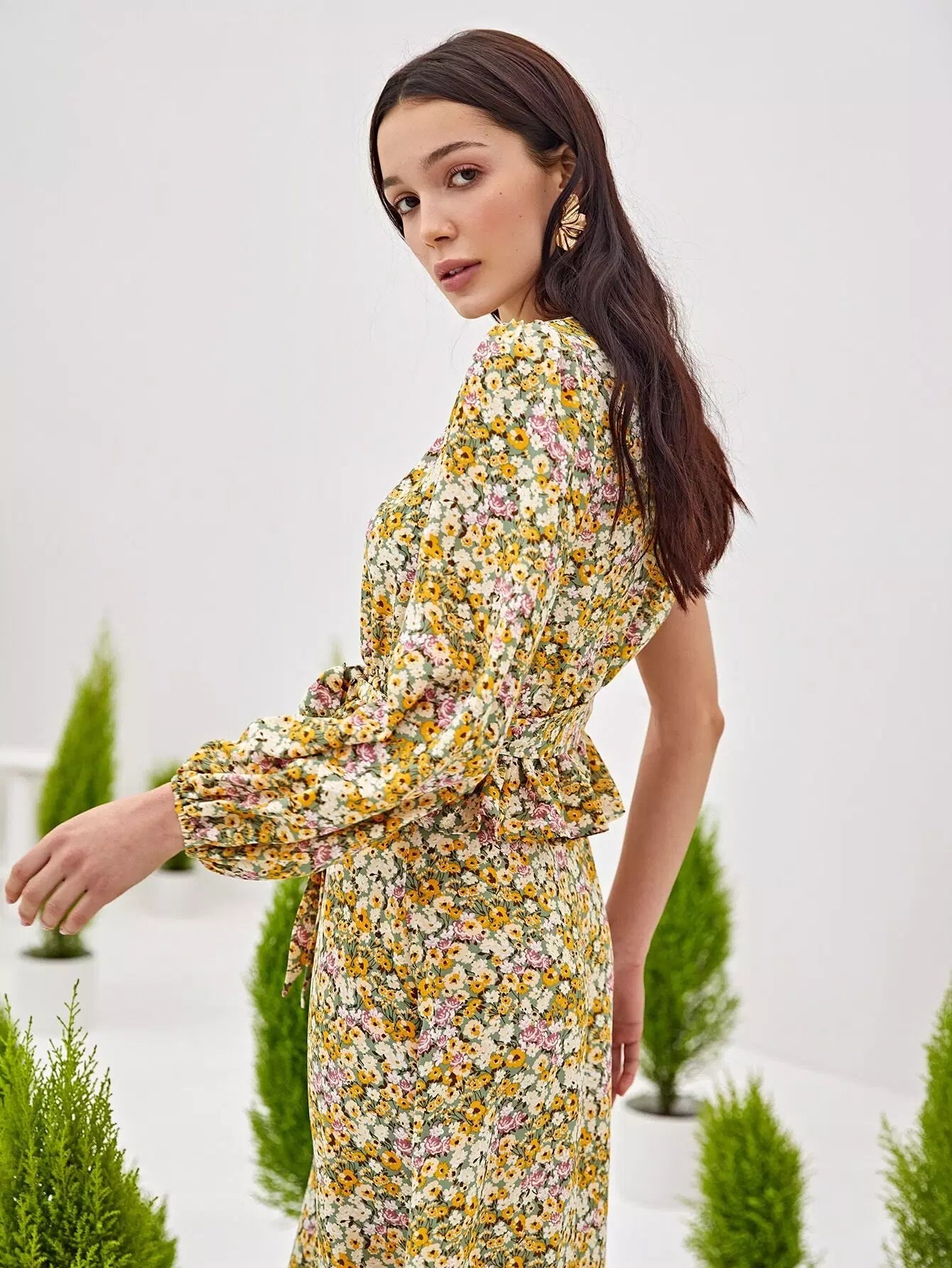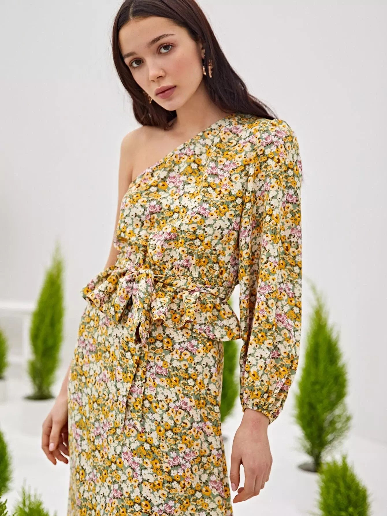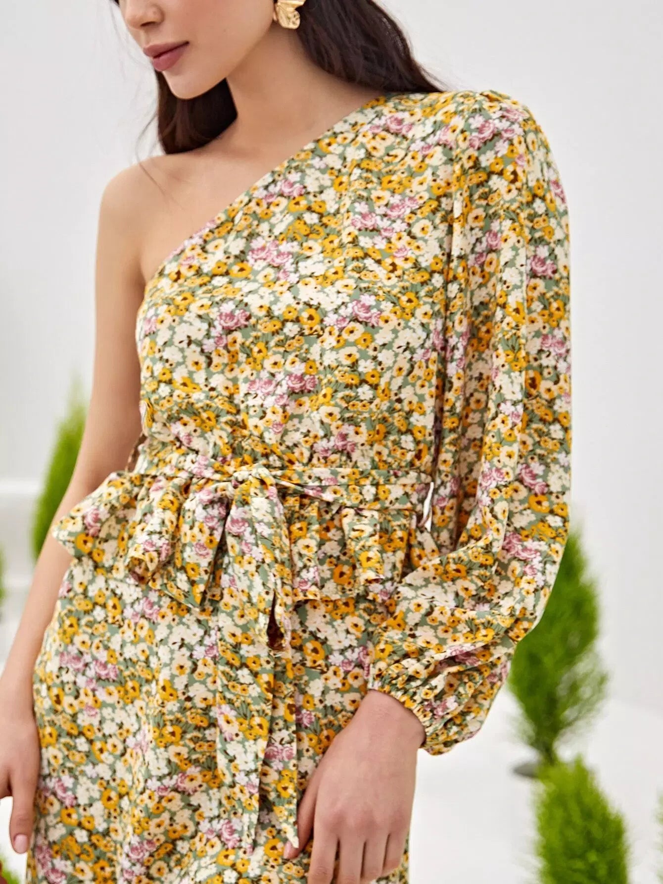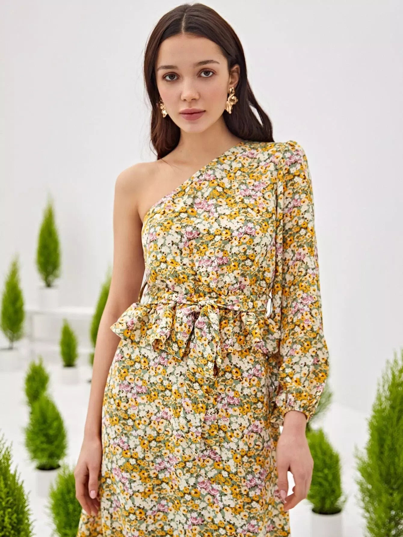 بلوزة بيبلوم زهرية بكتف واحد بدون حزام