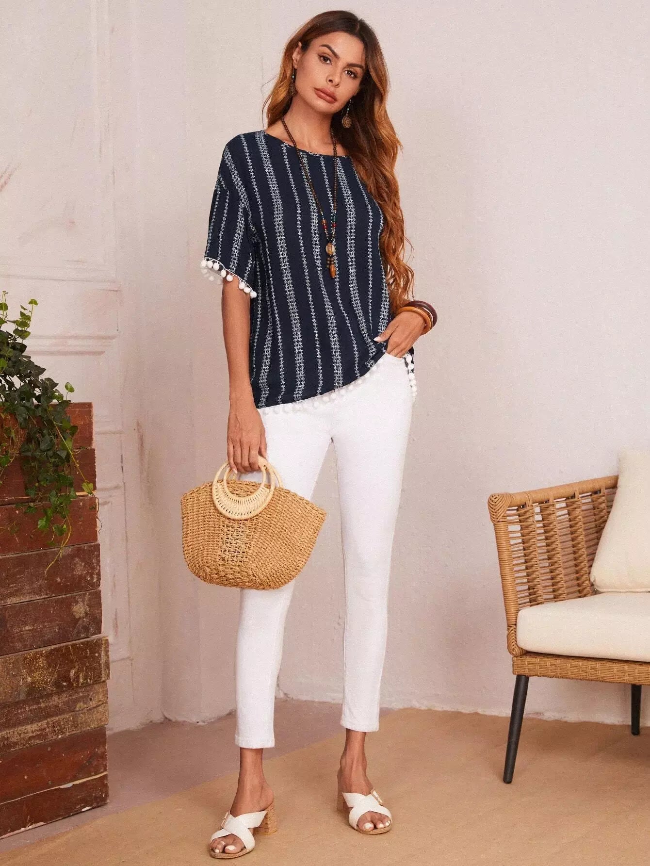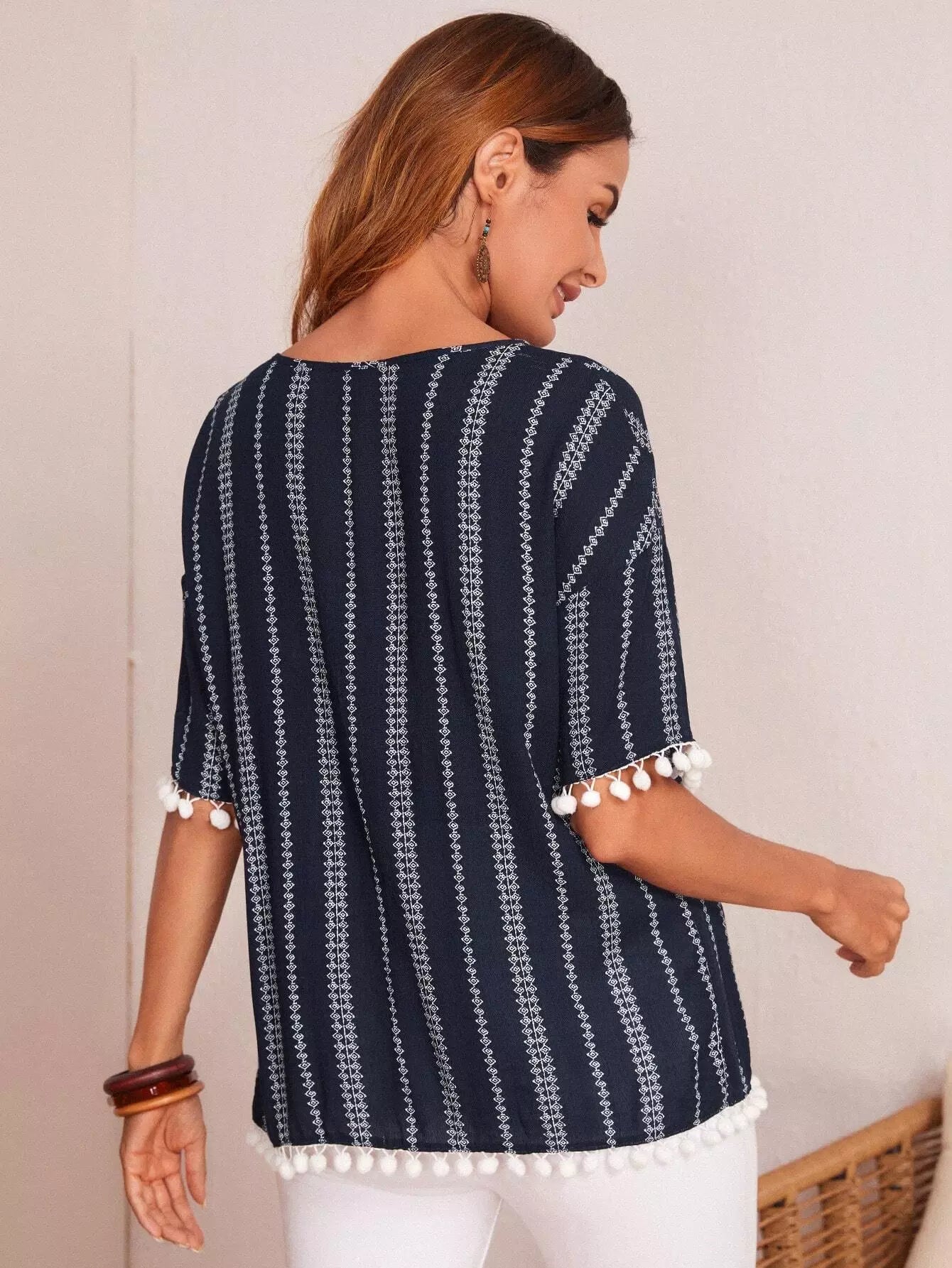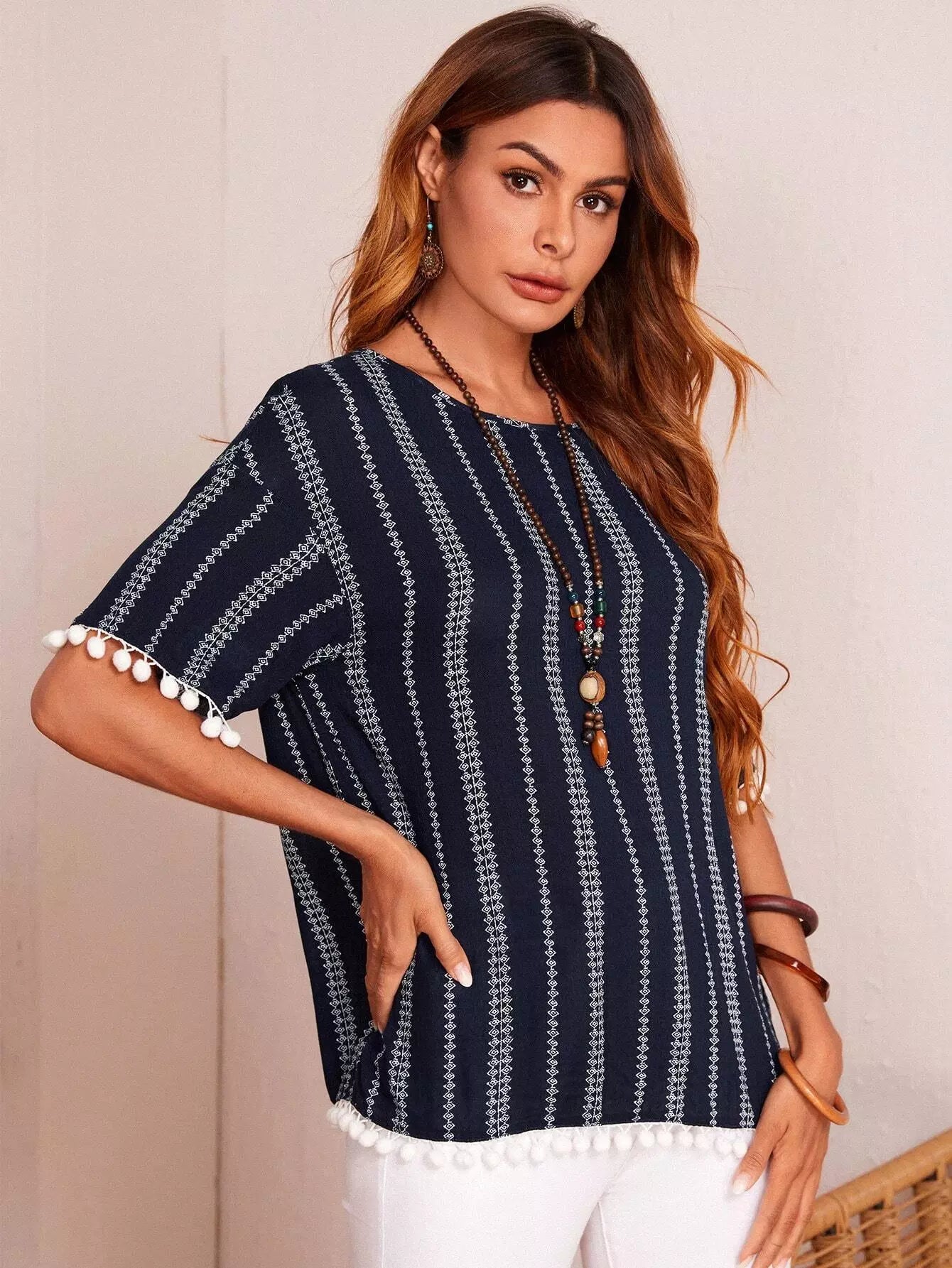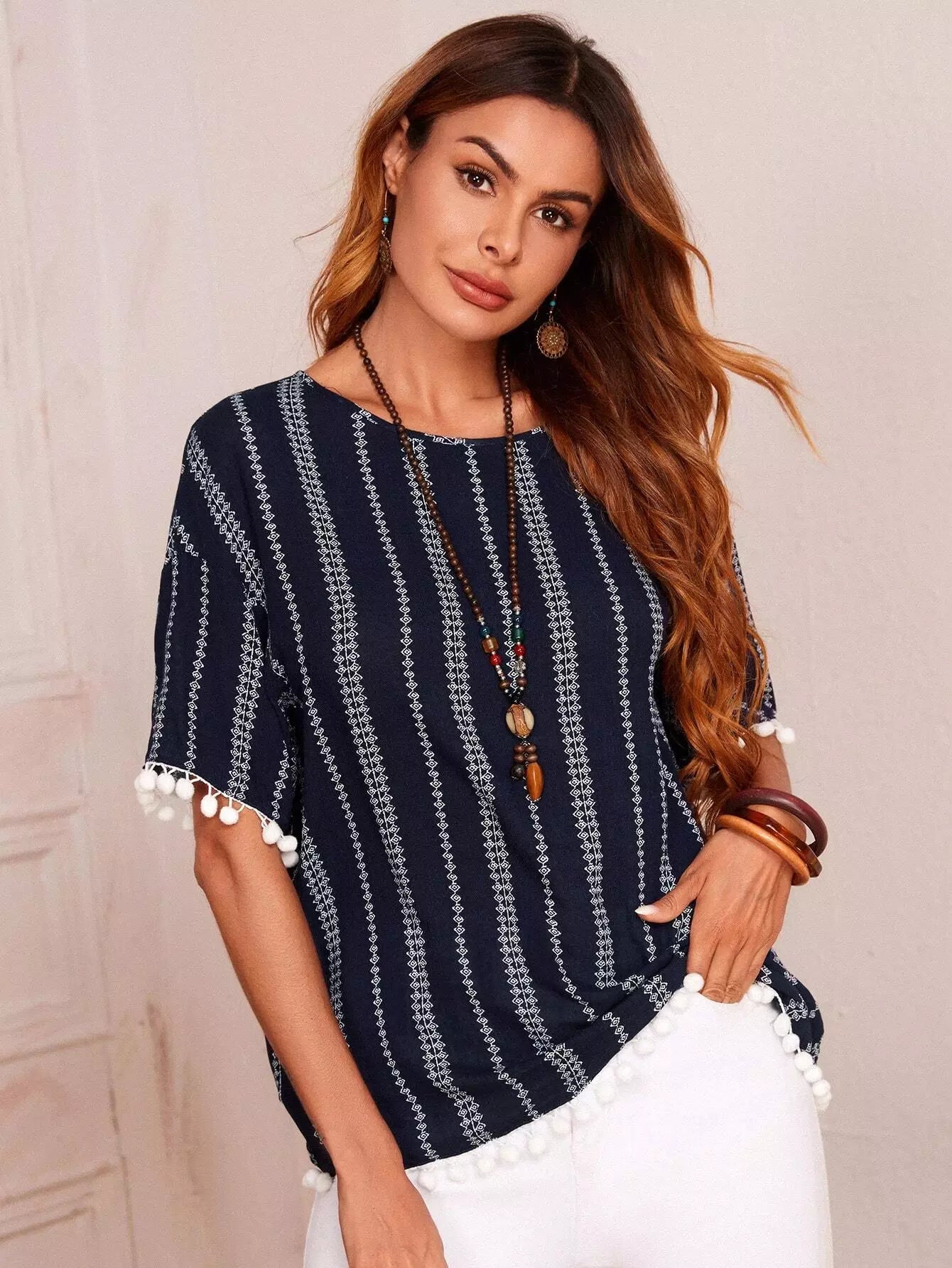 بلوزة بدون أكتاف منسدلة بتفاصيل بوم بوم