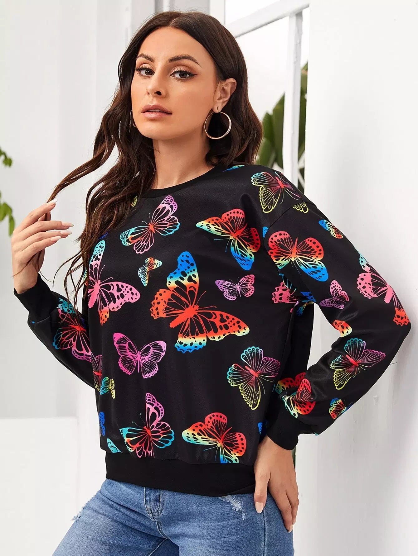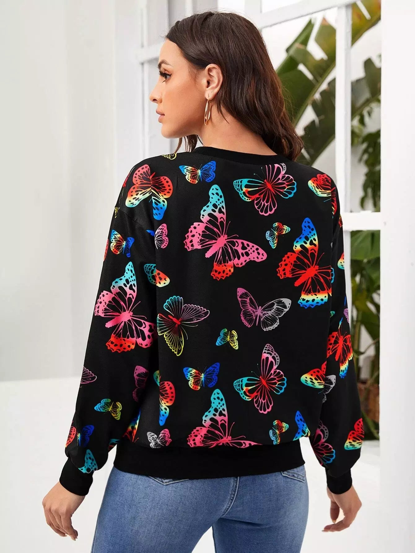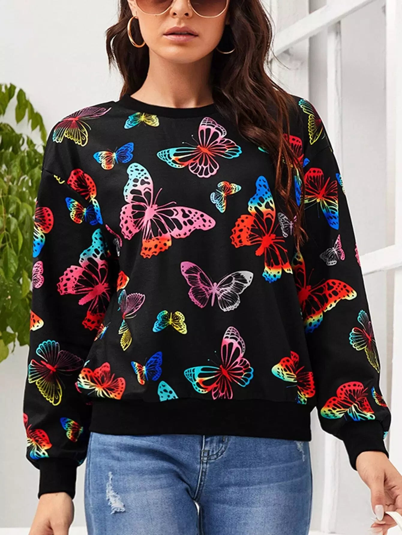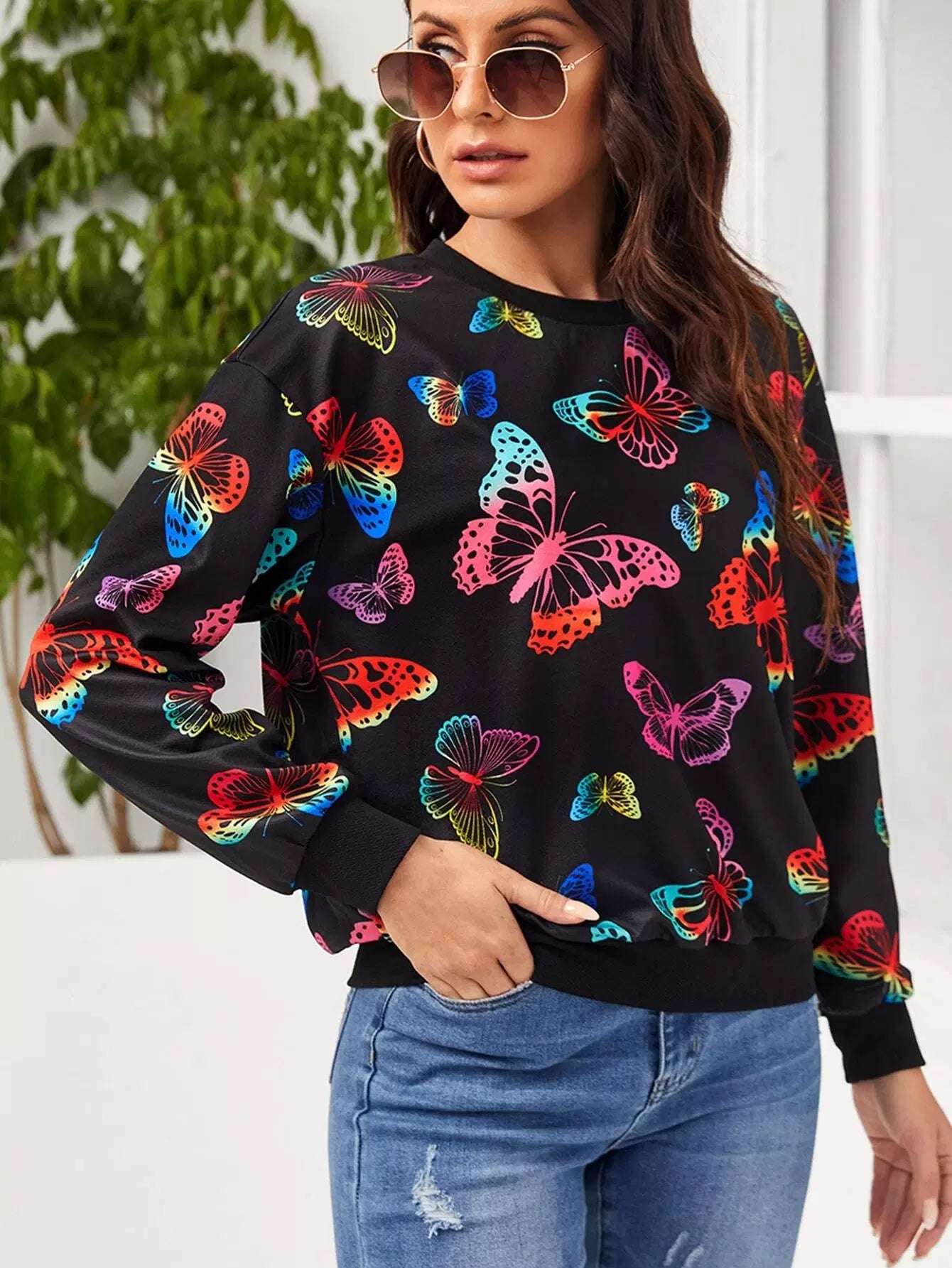 بلوفر برقبة مستديرة مطبوع عليها فراشة