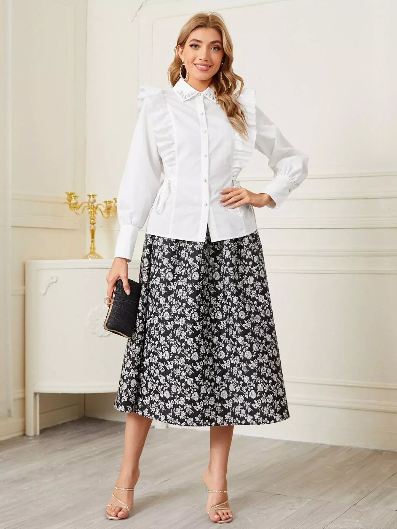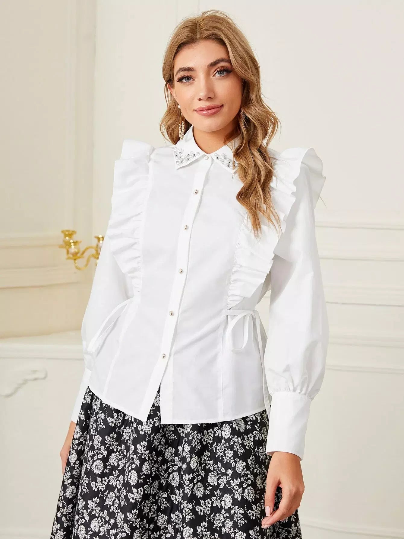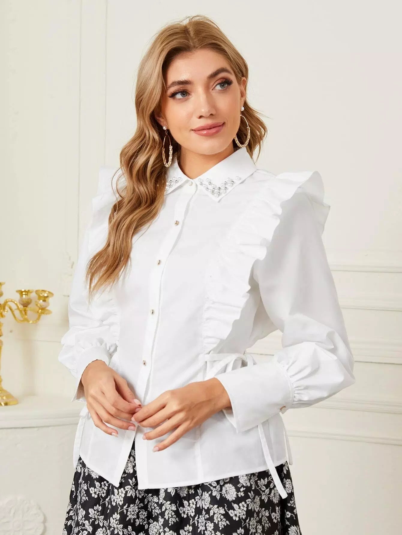 قميص مزين بكشكش مزين باللؤلؤ ومطرز بربطة عنق جانبية
