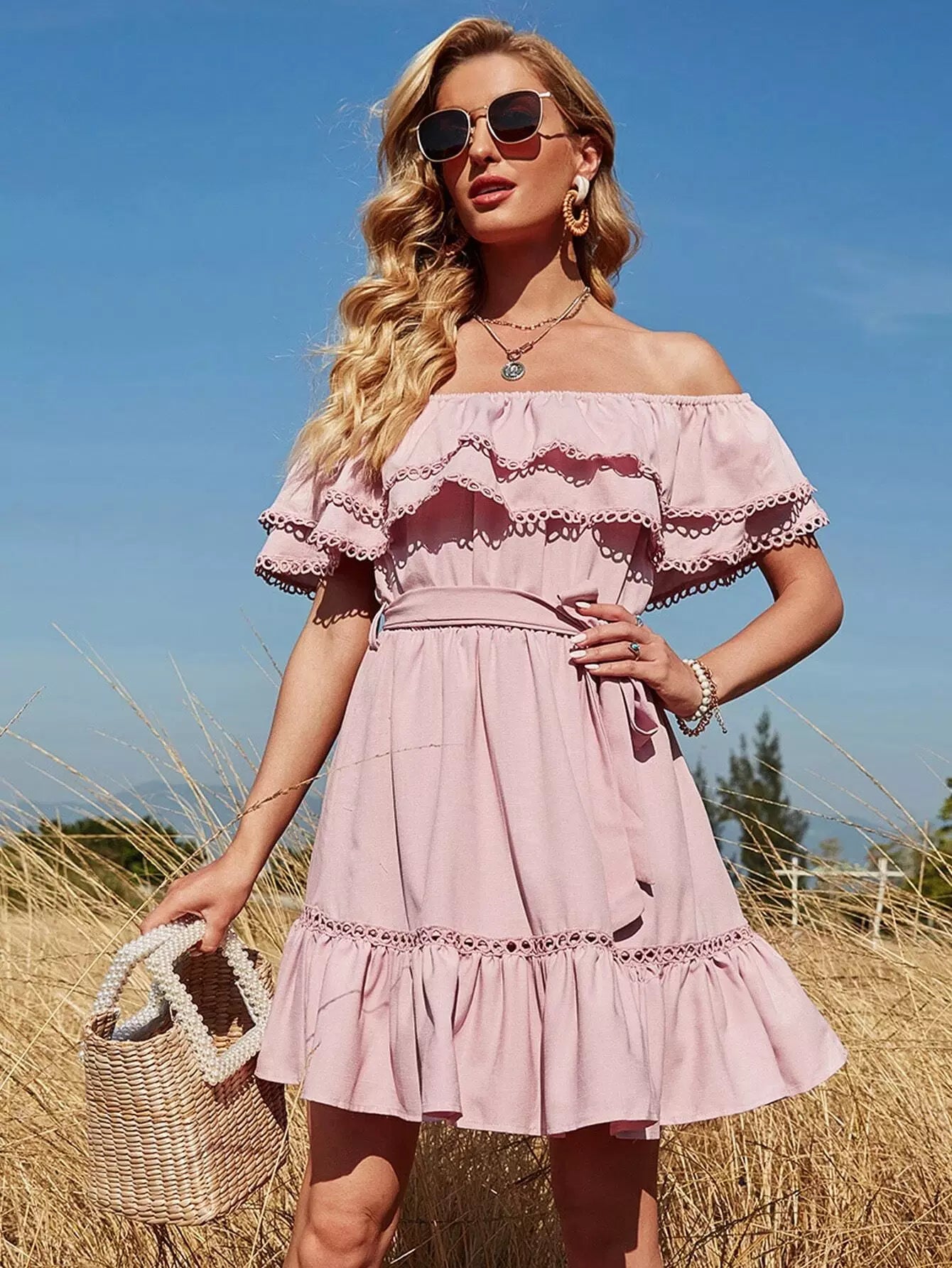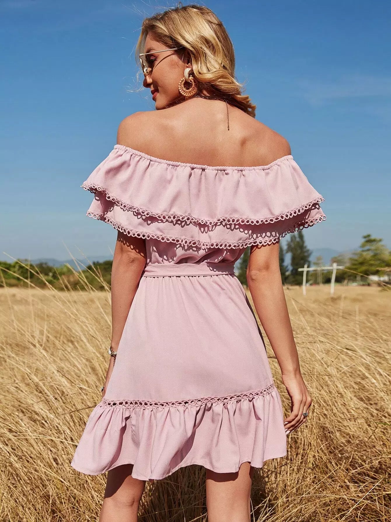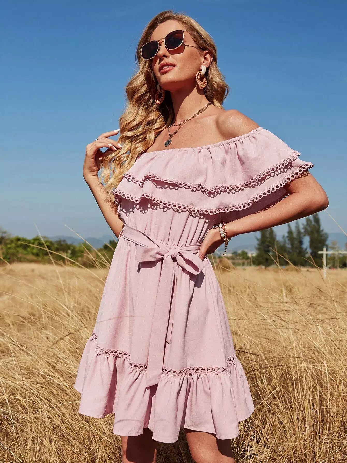فستان باردوت برباط كشكش بربطة عنق ذاتي