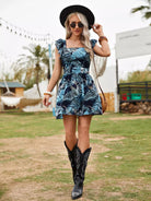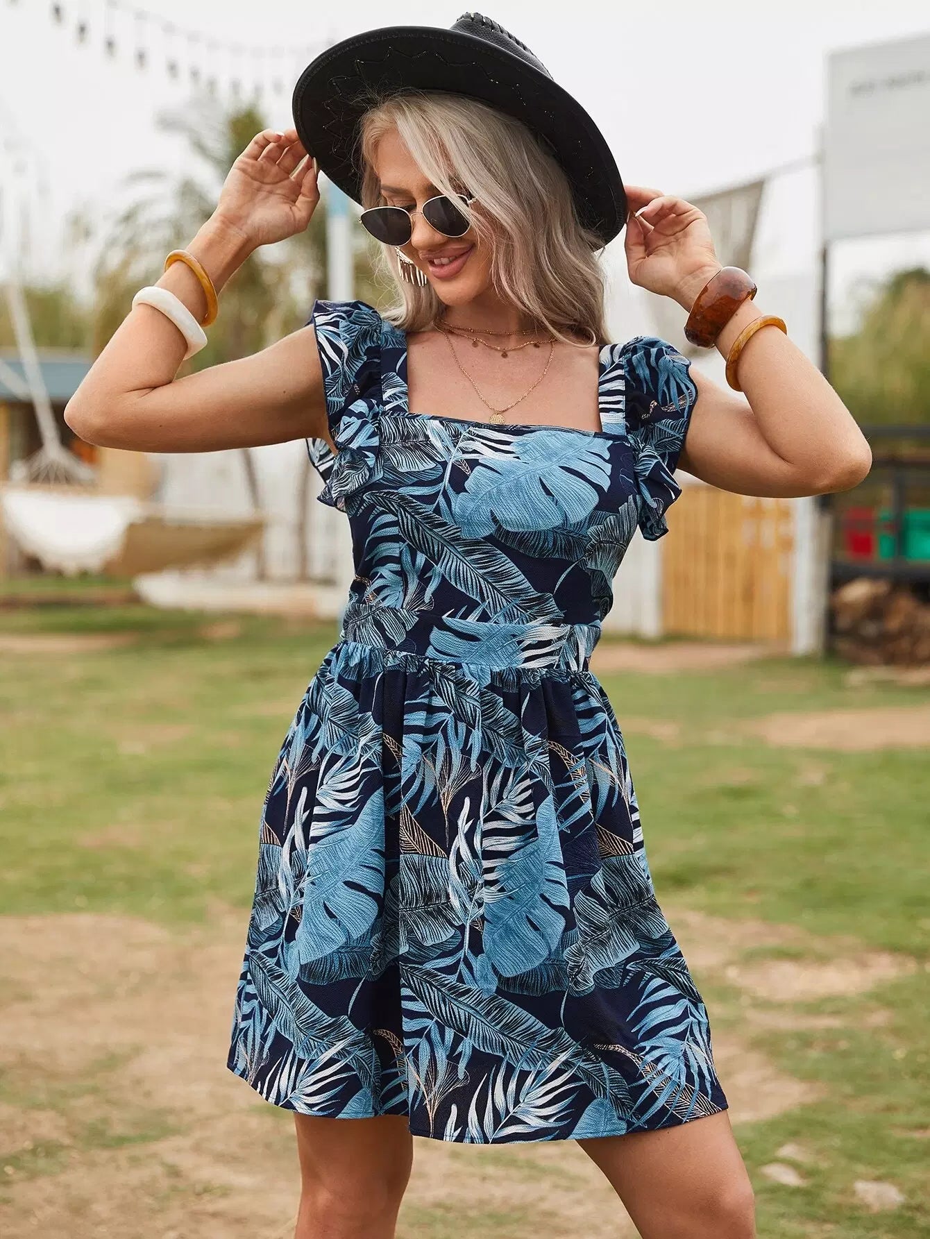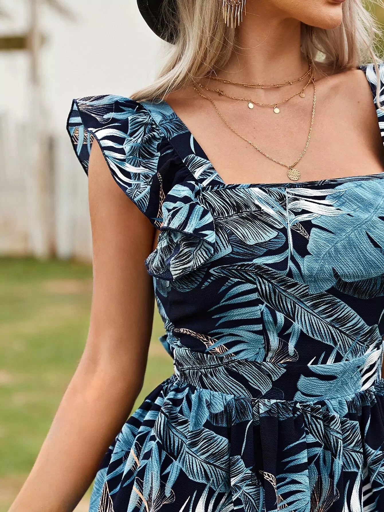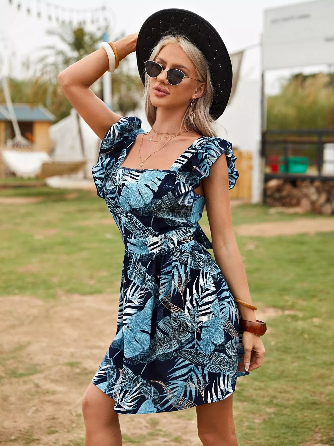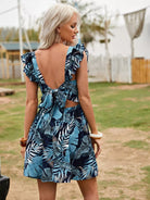 فستان مزين بكشكش مزين بربطة عنق مكشكشة بدون ربطة ظهر بطبعة استوائية