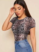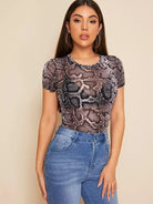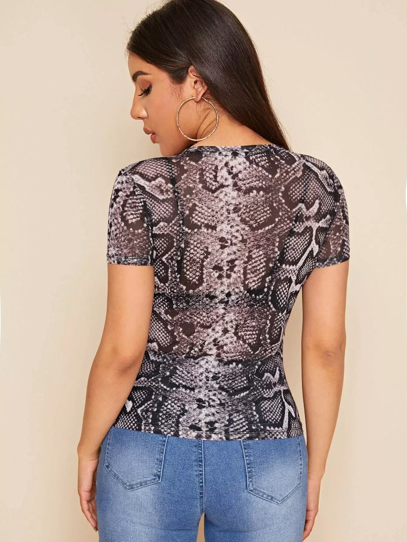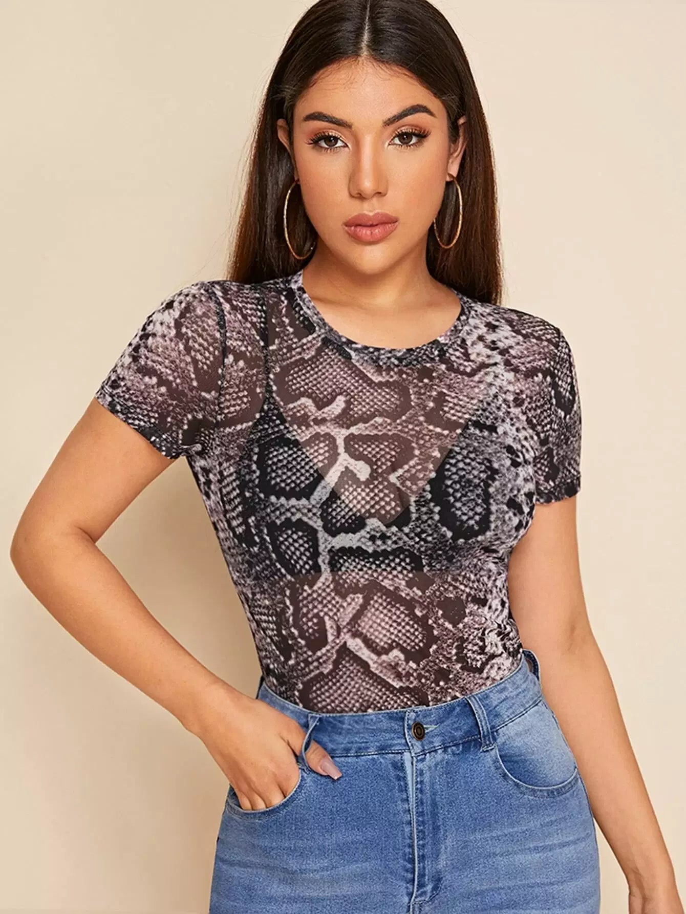 تي شيرت بأكمام قصيرة شبكية شفافة من جلد الثعبان