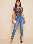 للنساء - تي شيرت شبكي شفاف بأكمام قصيرة مصنوع من جلد الثعبان