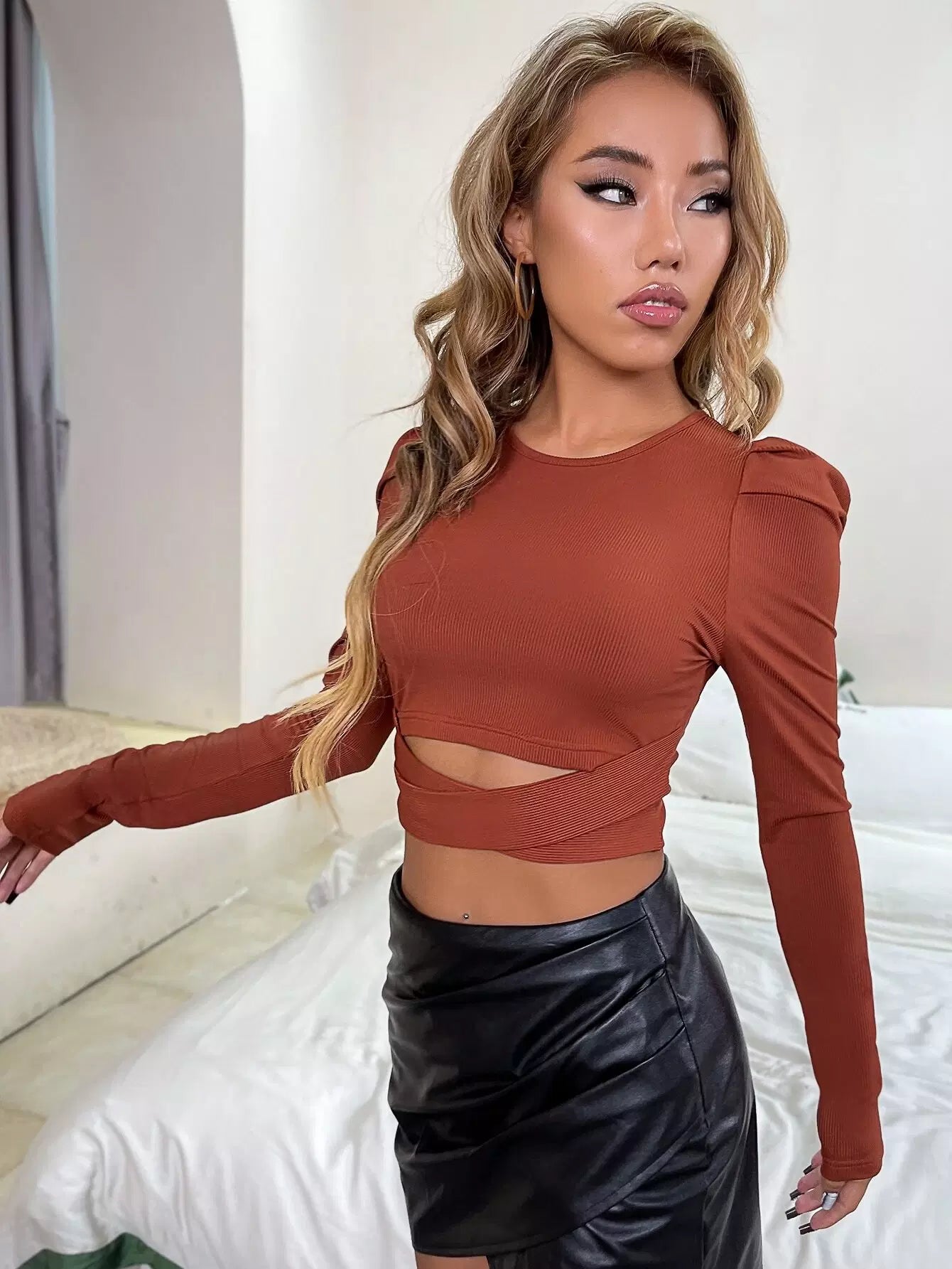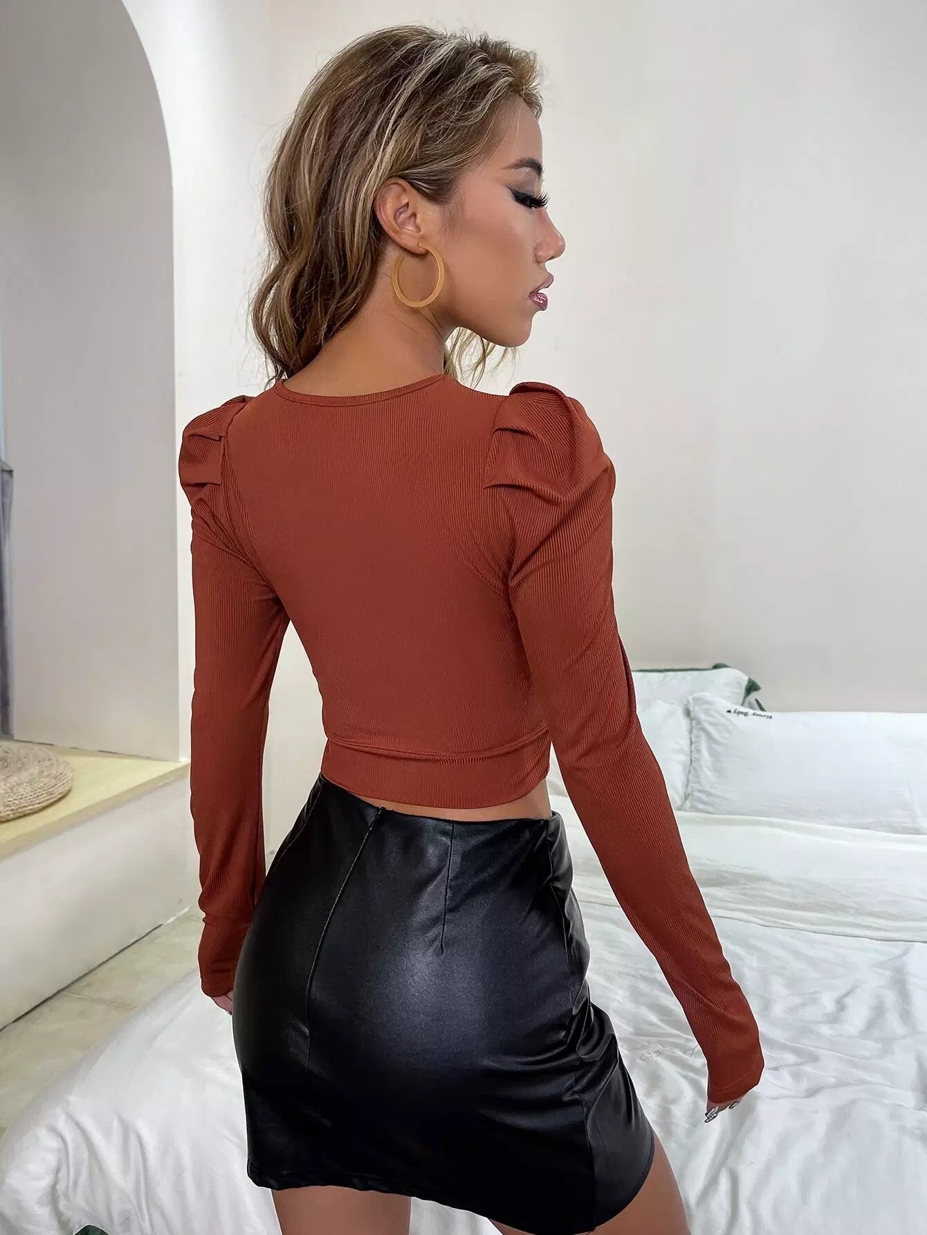 تيشيرت بأكمام منفوشة بفتحة منفوخة سادة متقاطعة مقطوعة