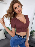 تي شيرت قصير ملفوف بفتحة رقبة على شكل حرف V عميقة من نسيج مضلع سادة