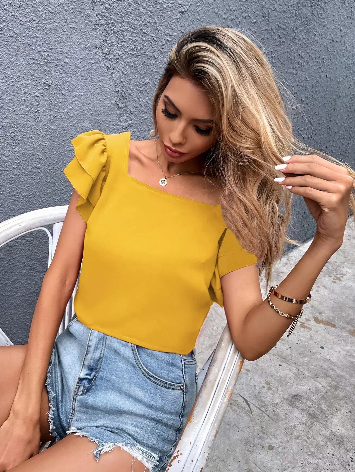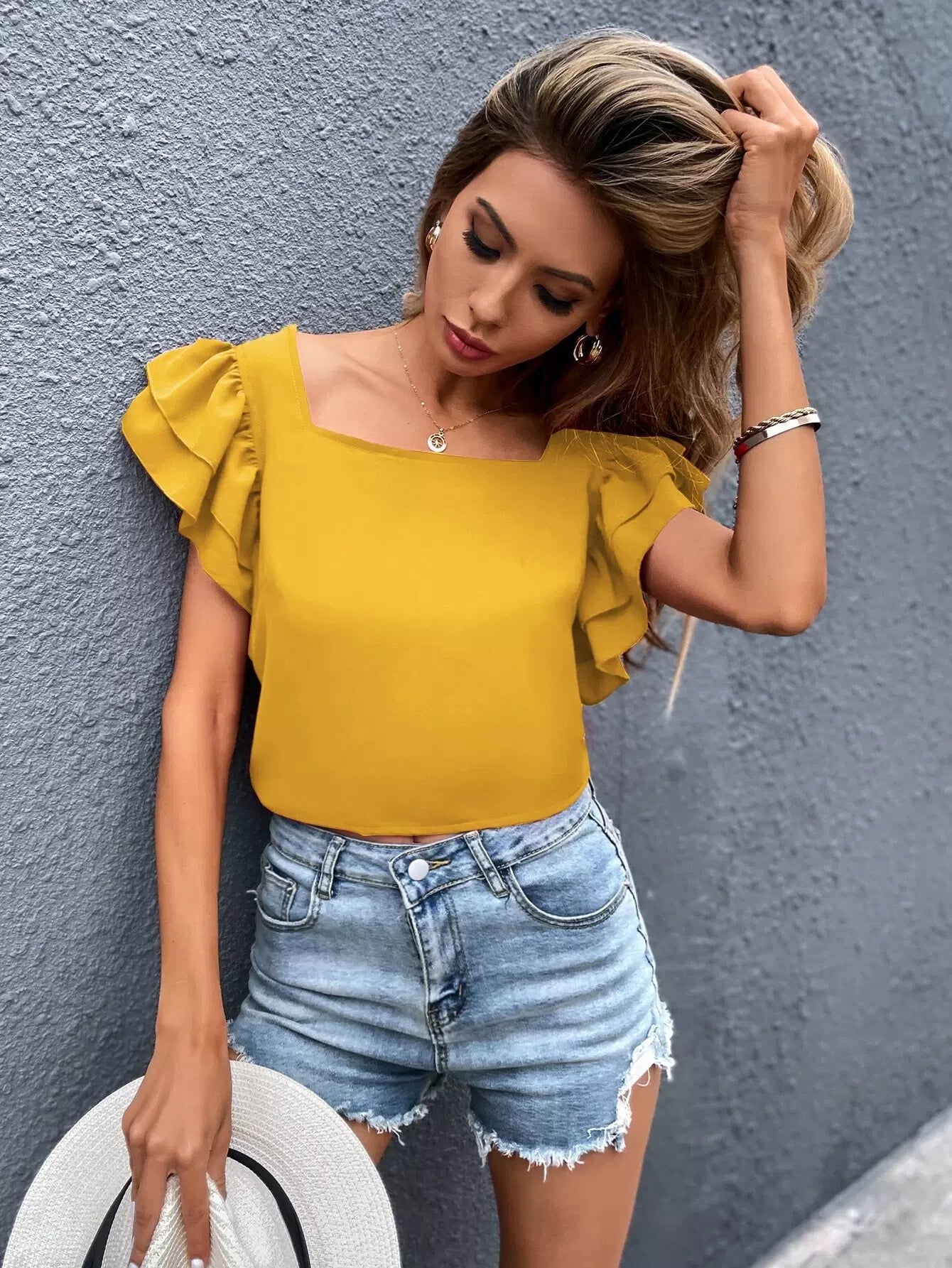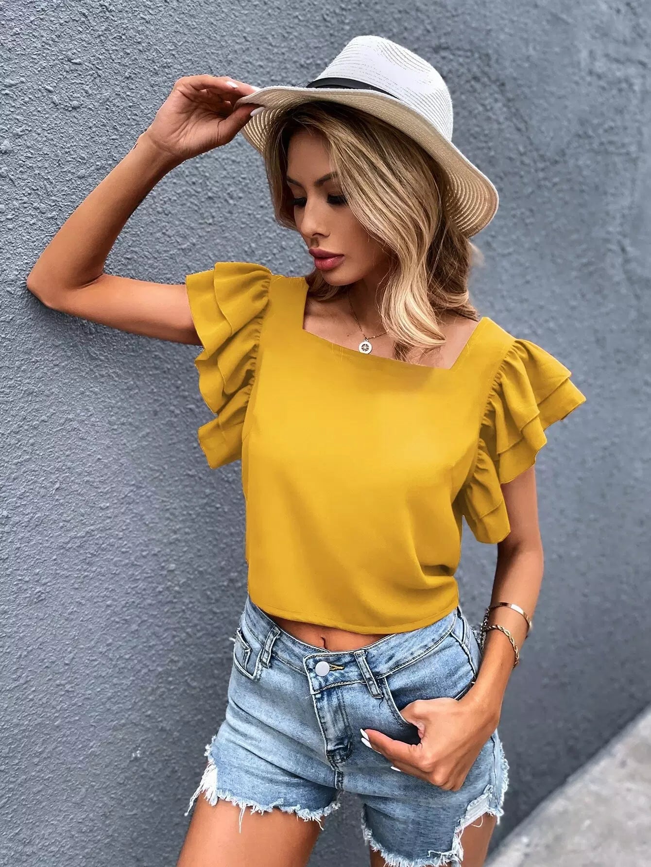 بلوزة سادة متدرجة ذات حواف مكشكشة بربطة عنق على الظهر